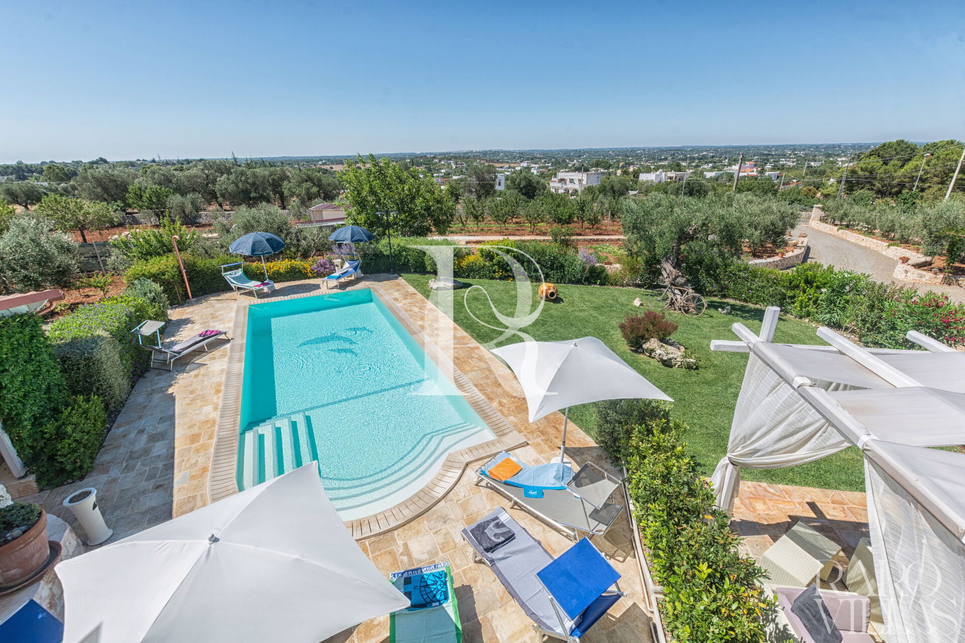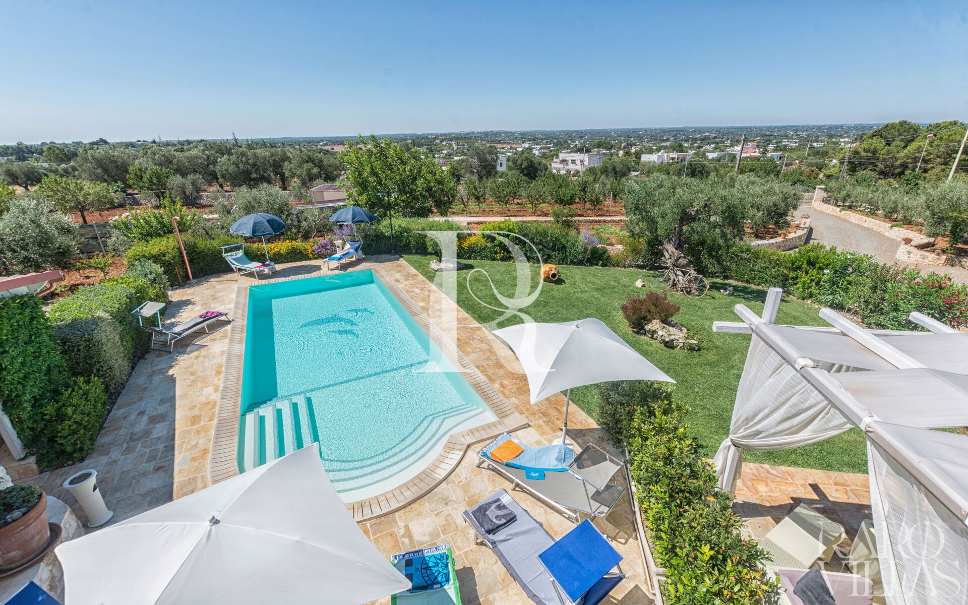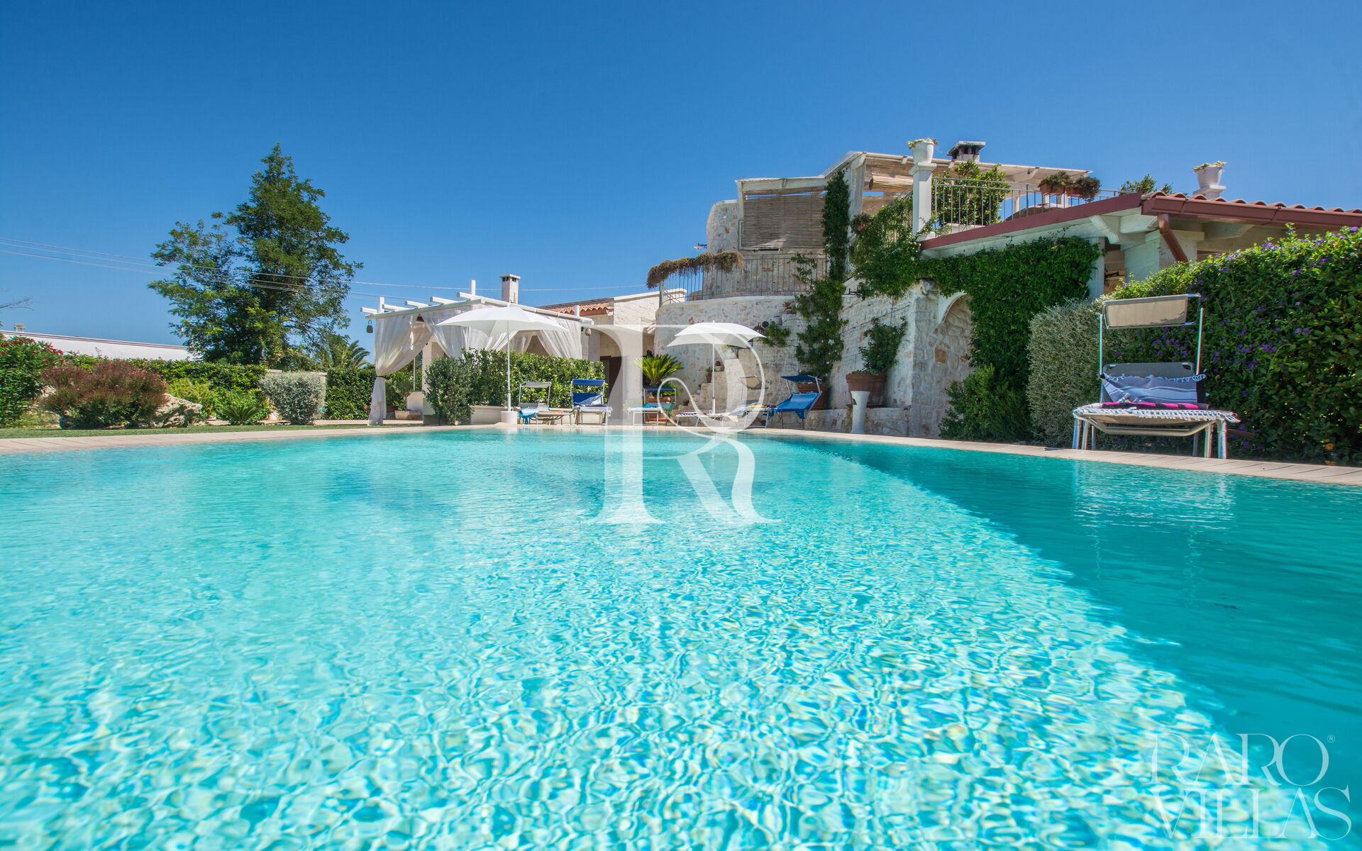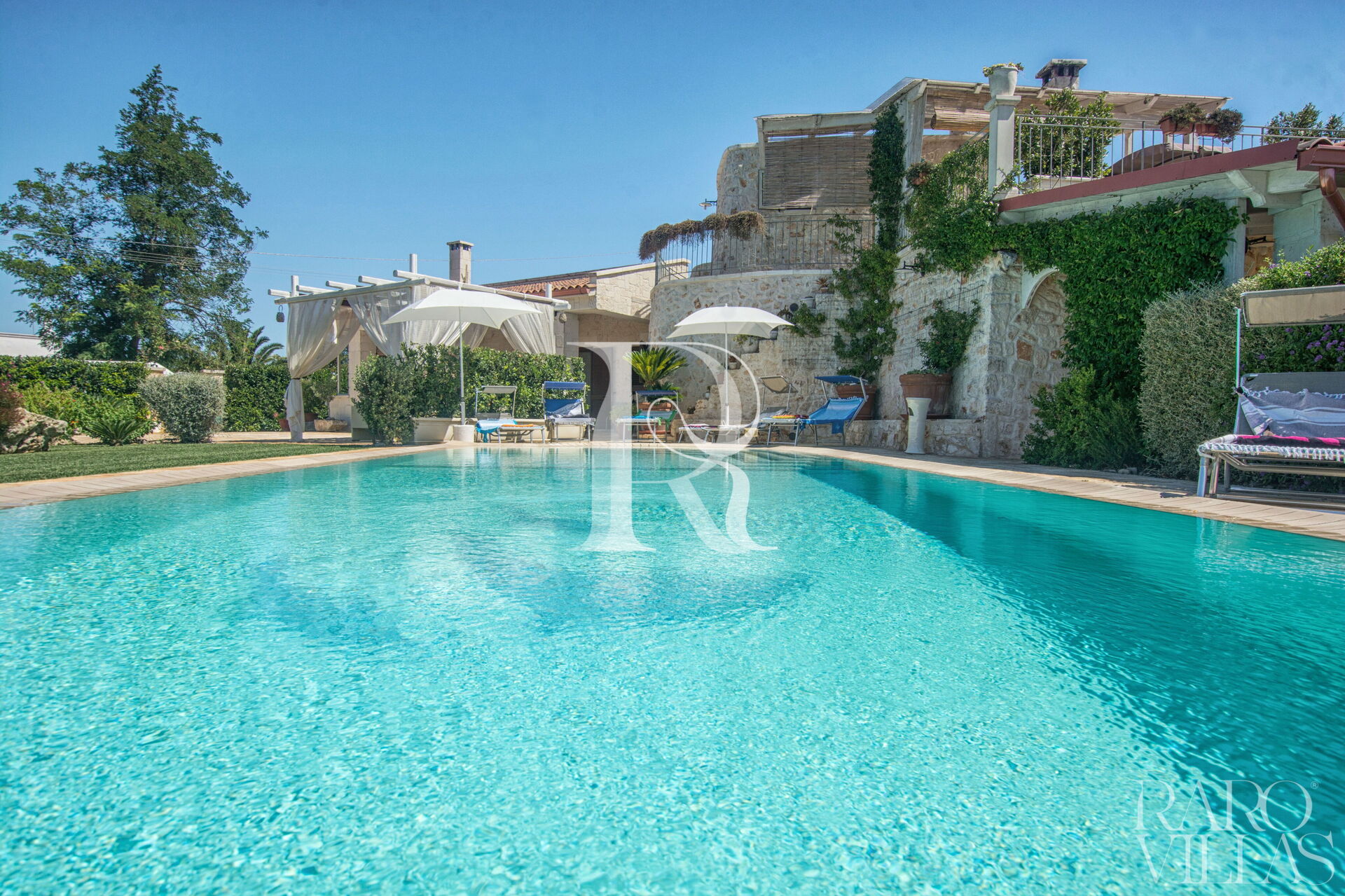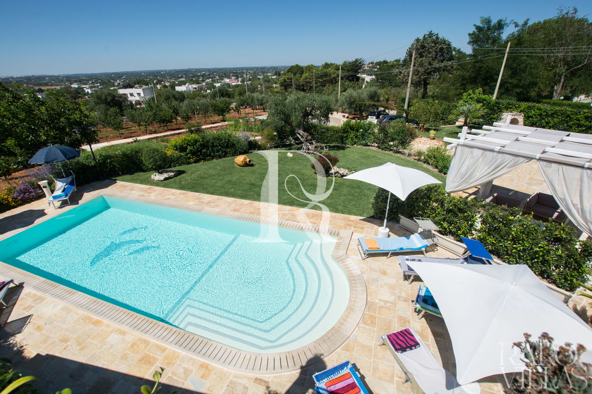 The pool area is surrounded by an English lawn and equipped with loungers where you can enjoy maximum relaxation.