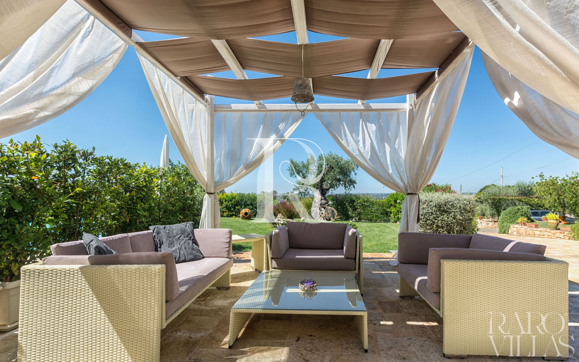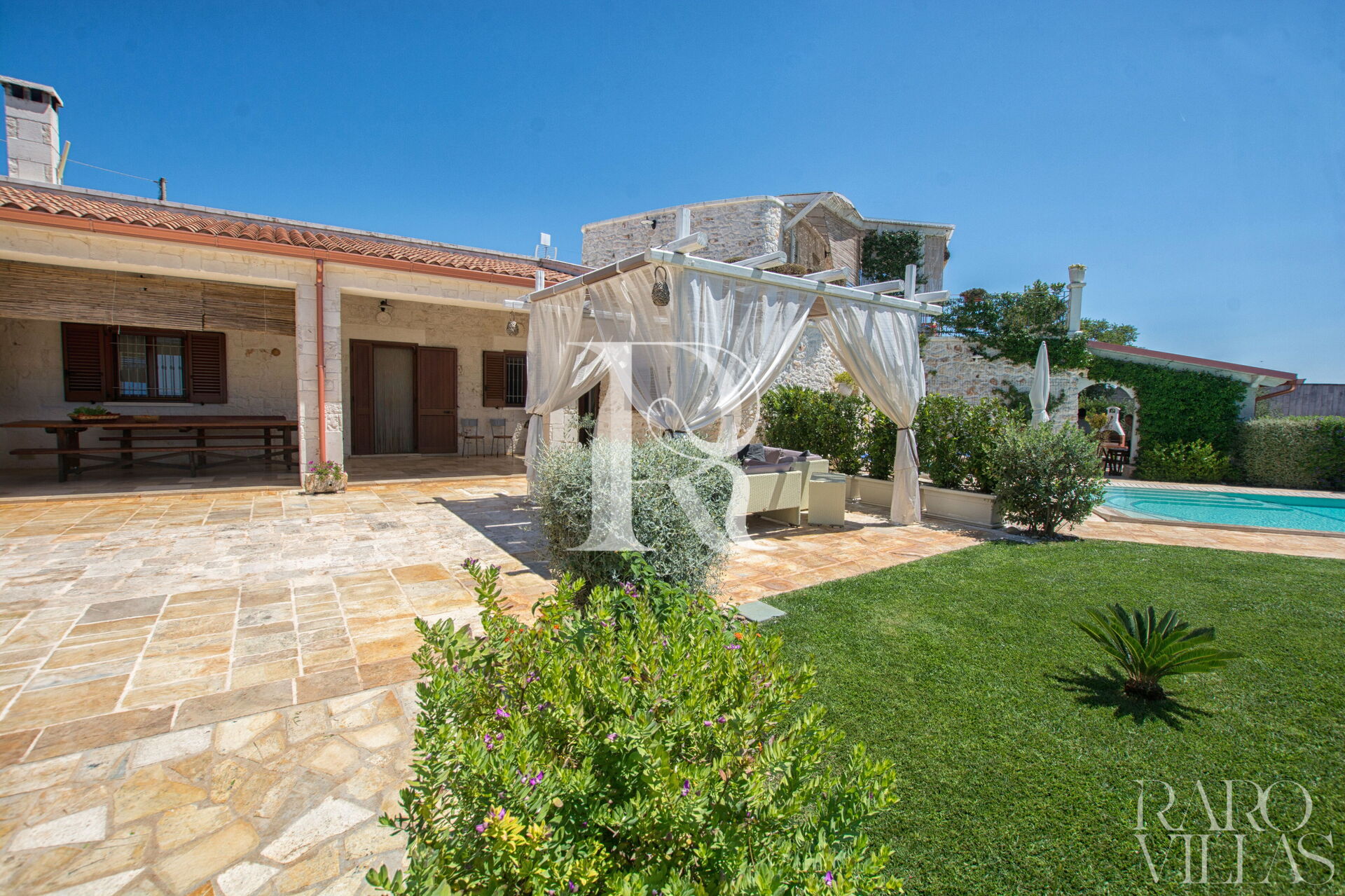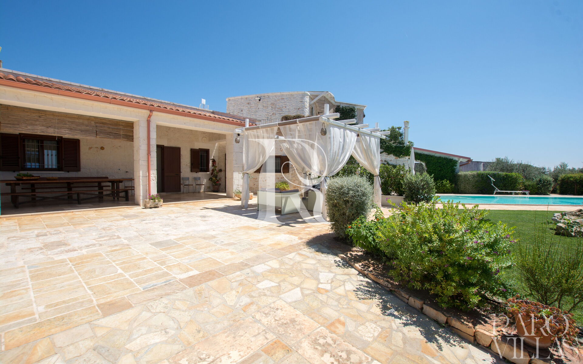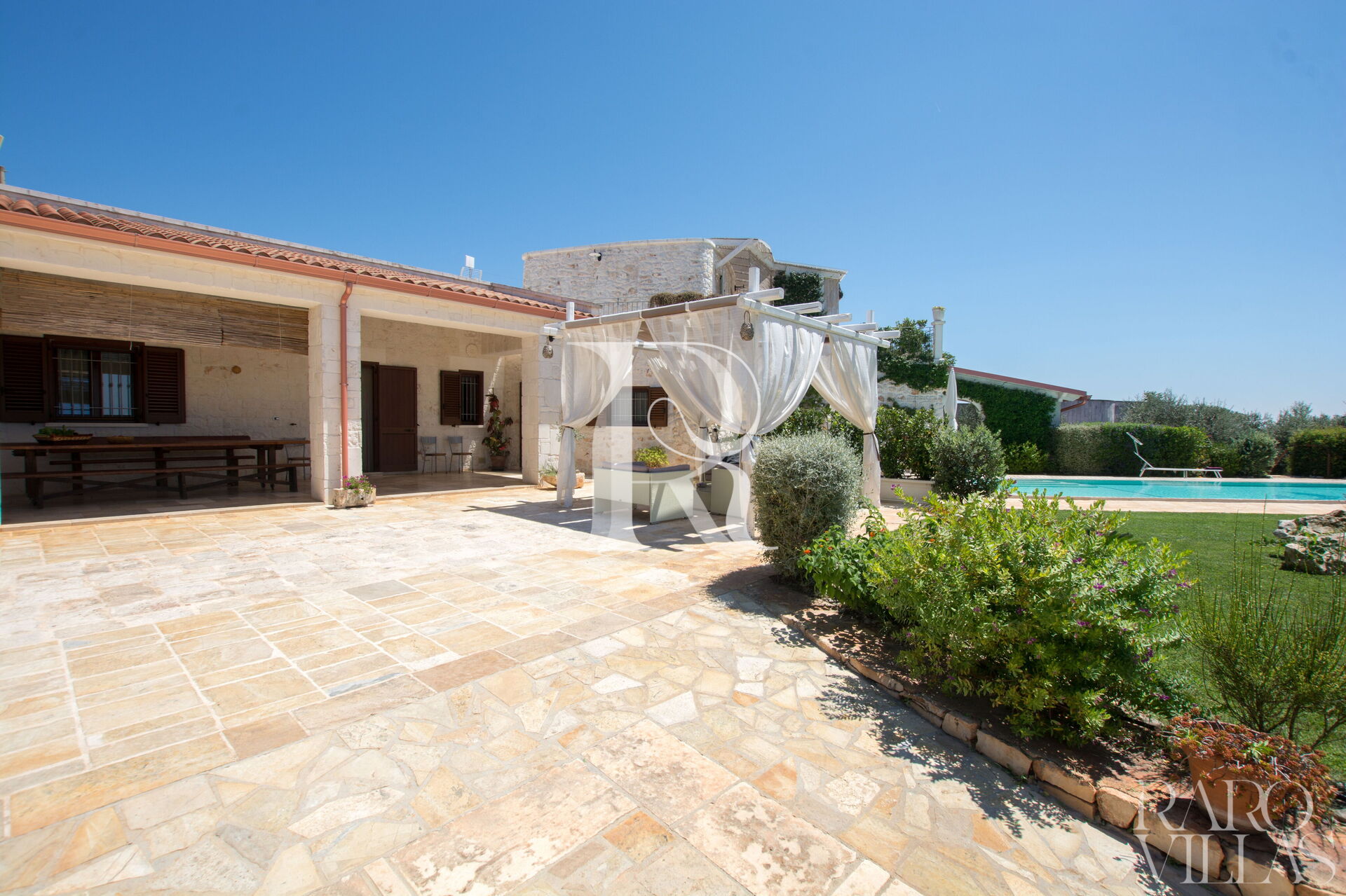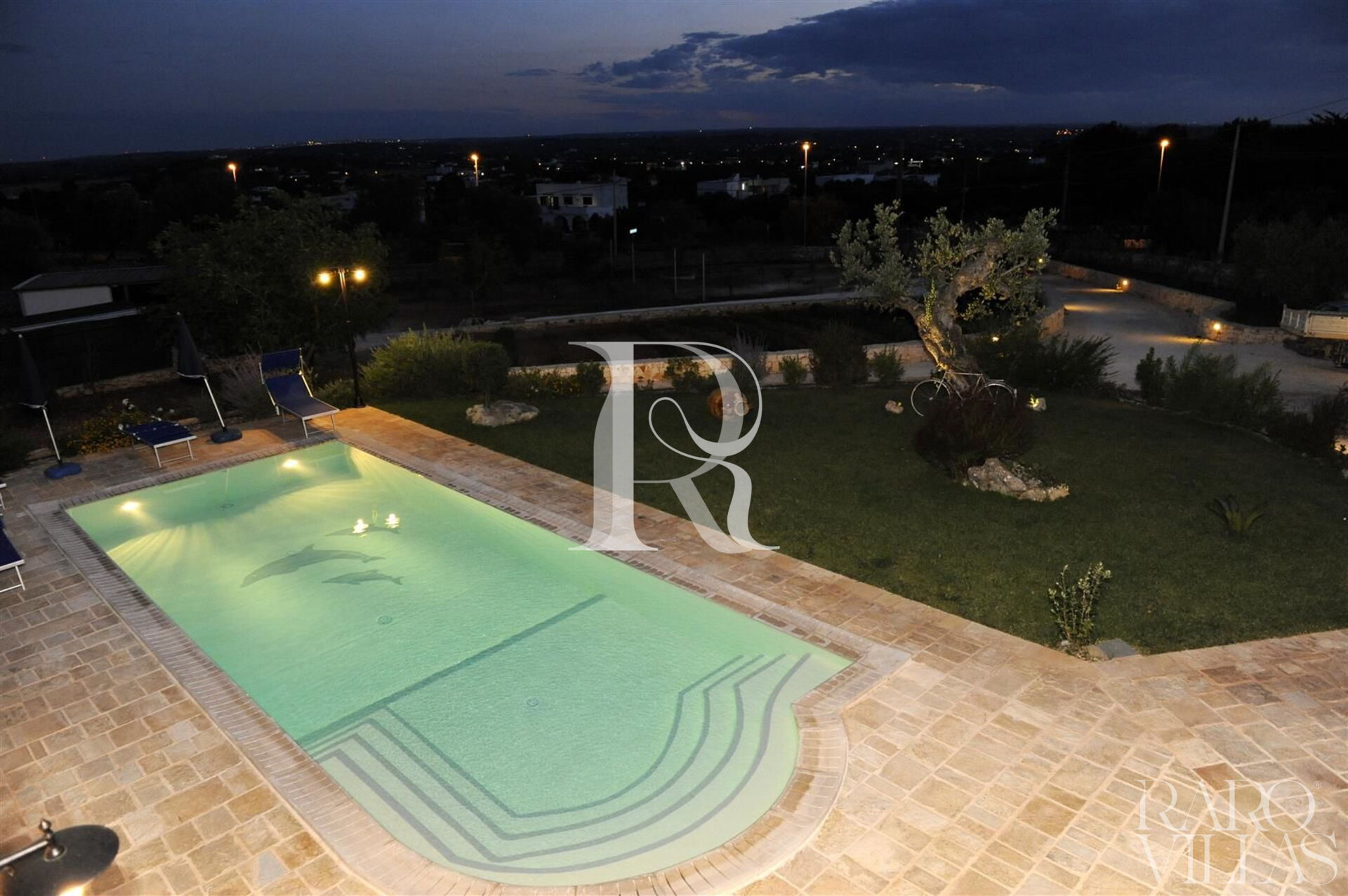 The pool area is surrounded by an English lawn and equipped with loungers where you can enjoy maximum relaxation.