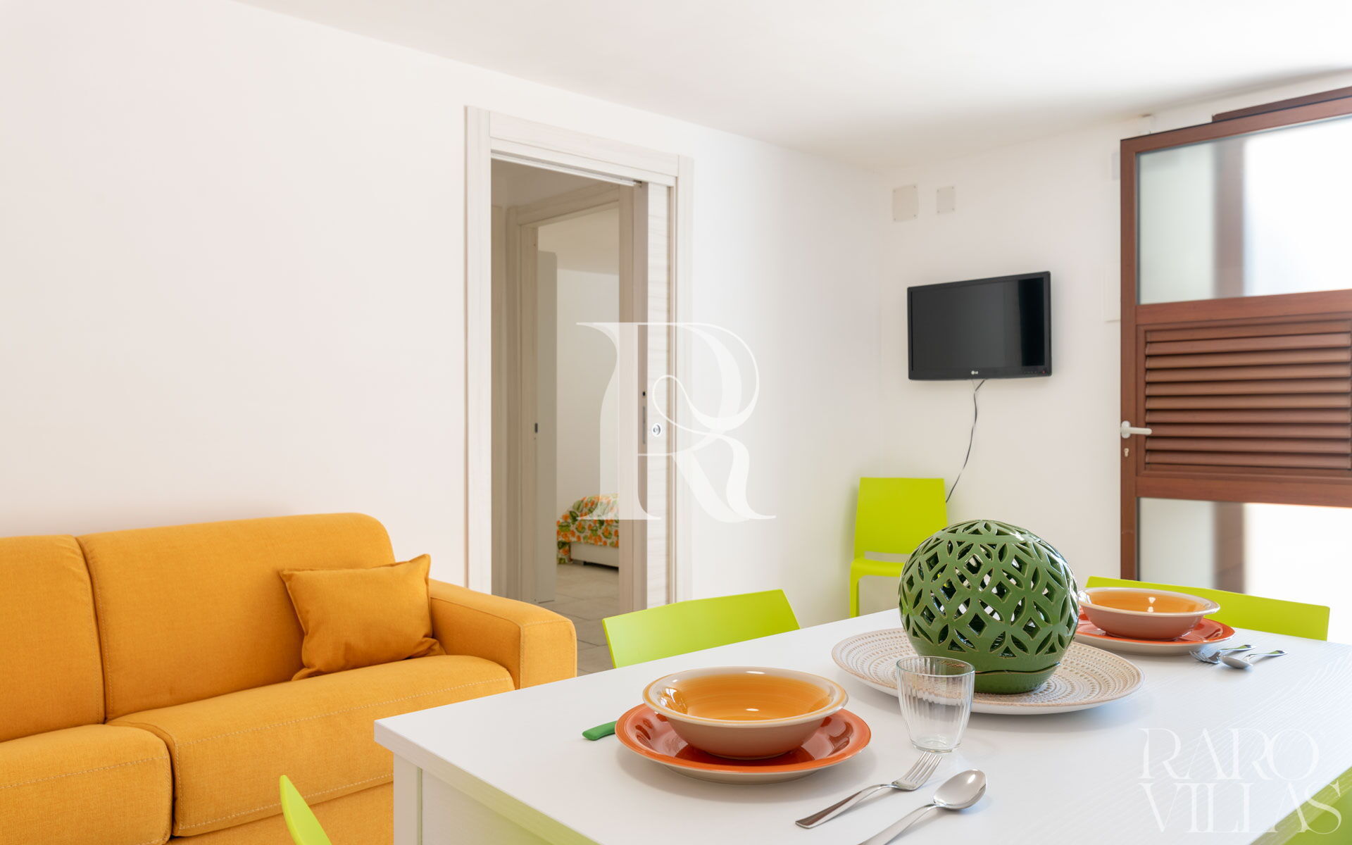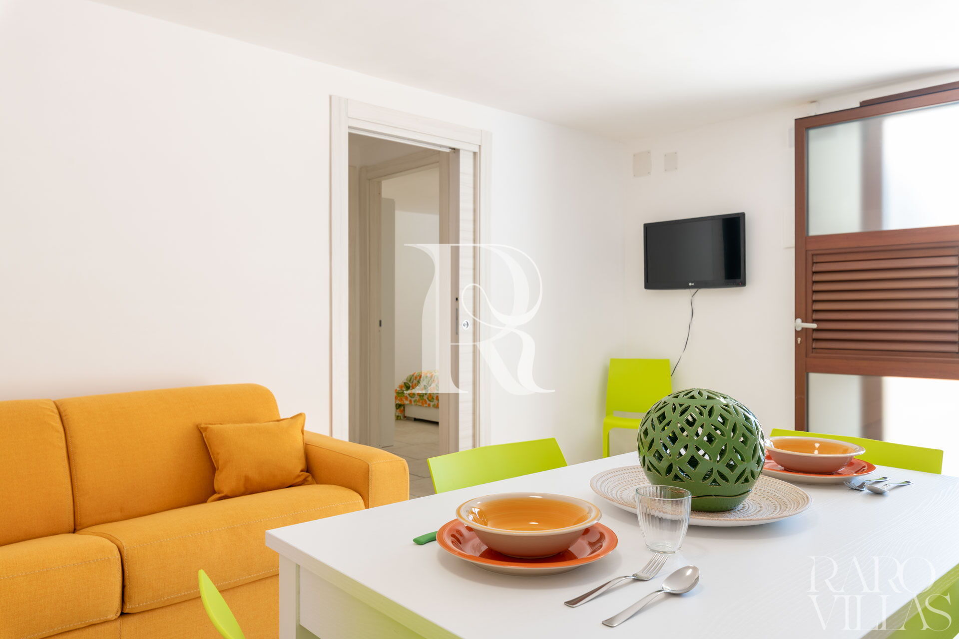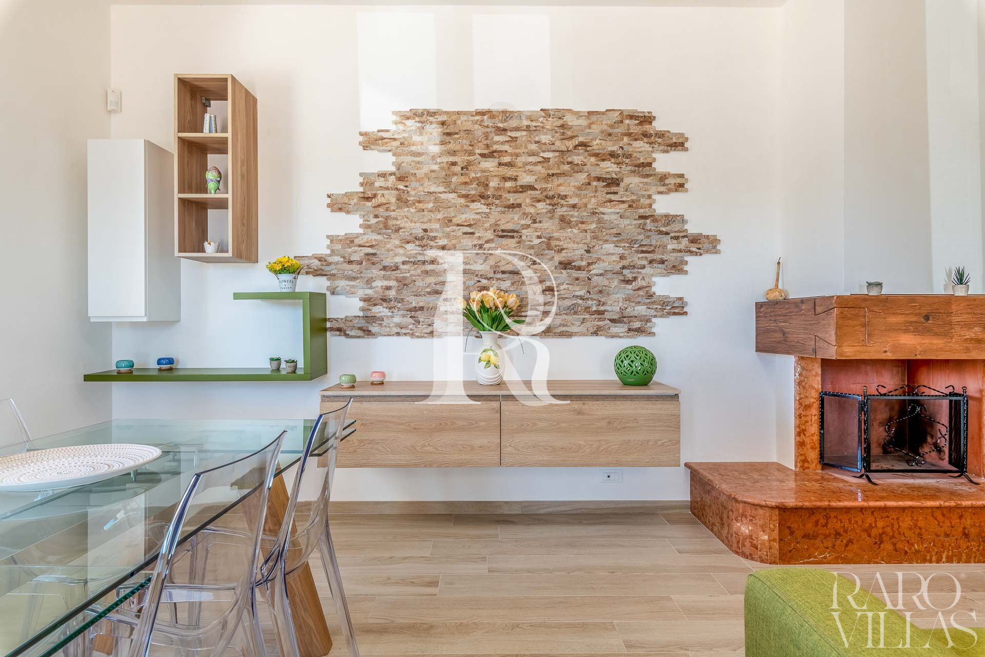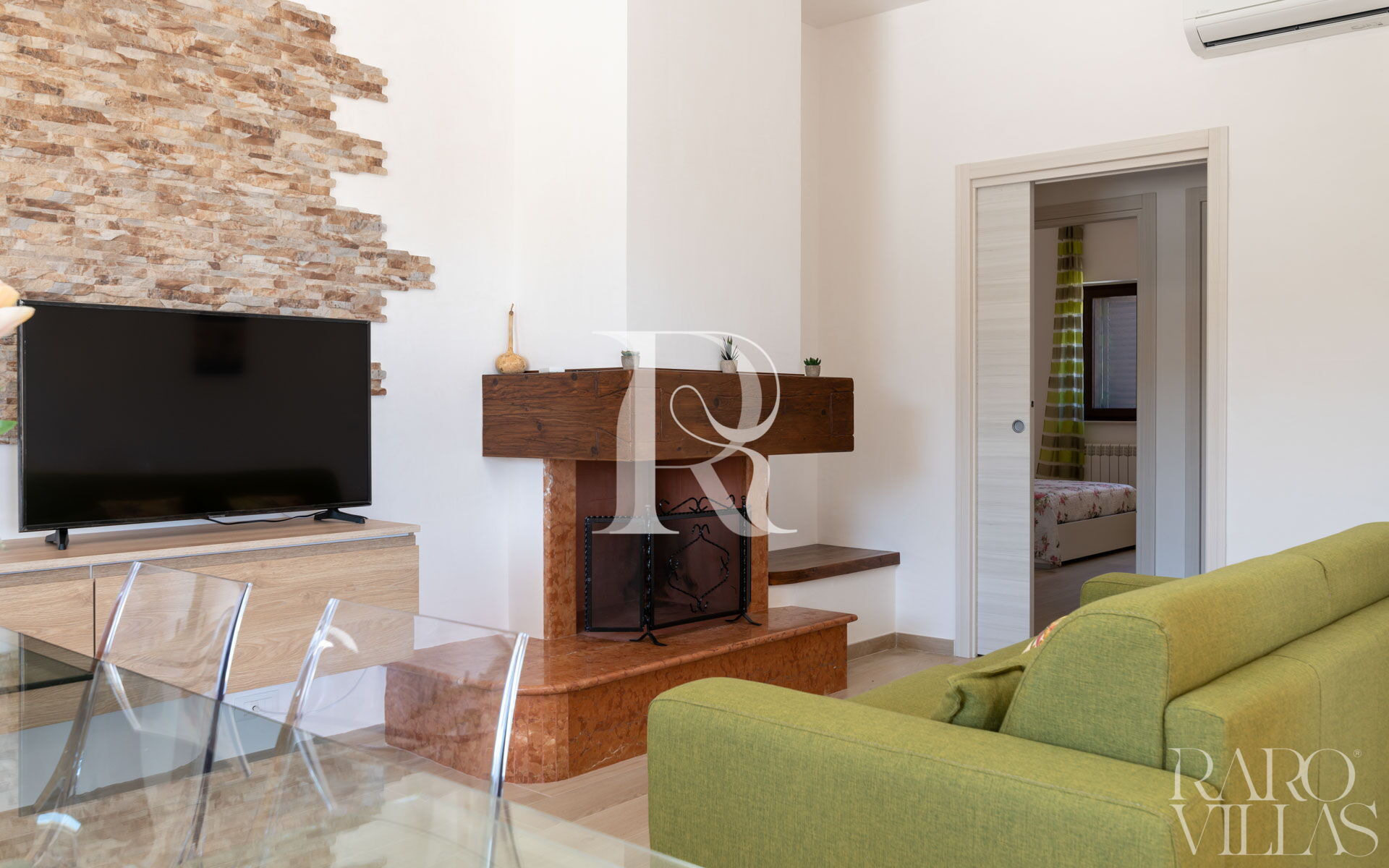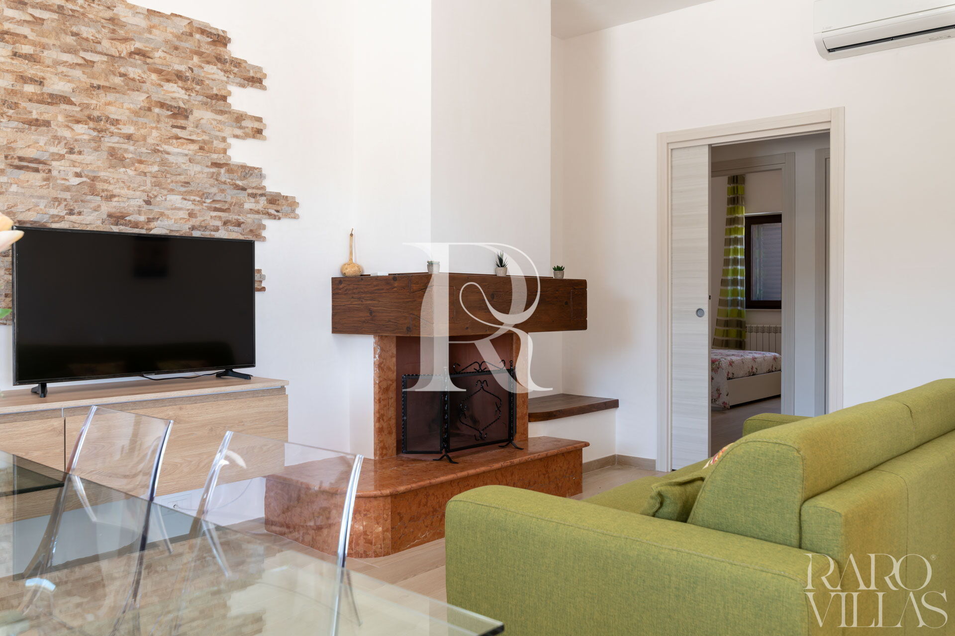 From the main French door, with single door and mosquito net, there will be a bright and habitable living room, furnished with a glass dining table for four diners, a sofa for two, a Smart TV and an elegant marble and wood fireplace.