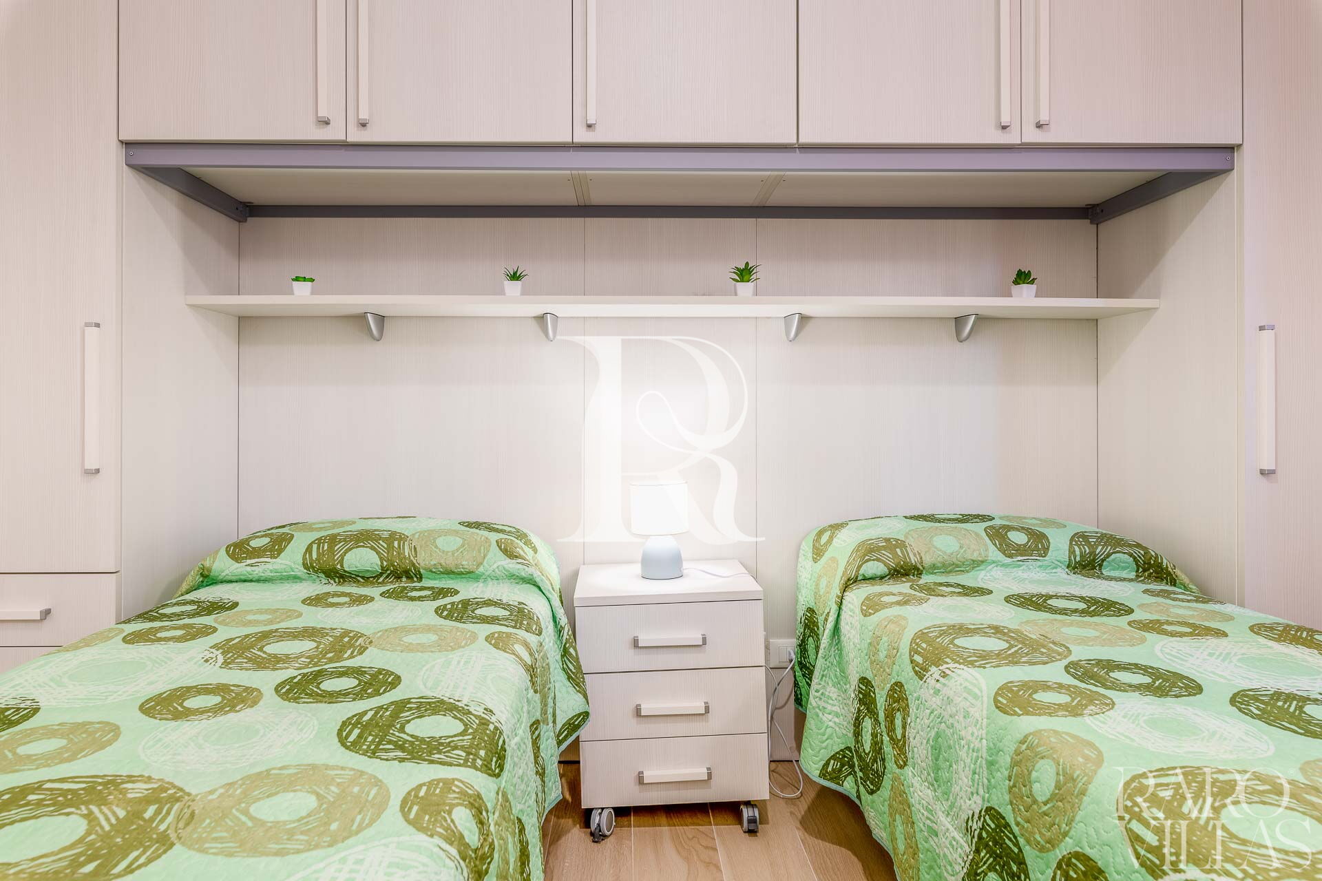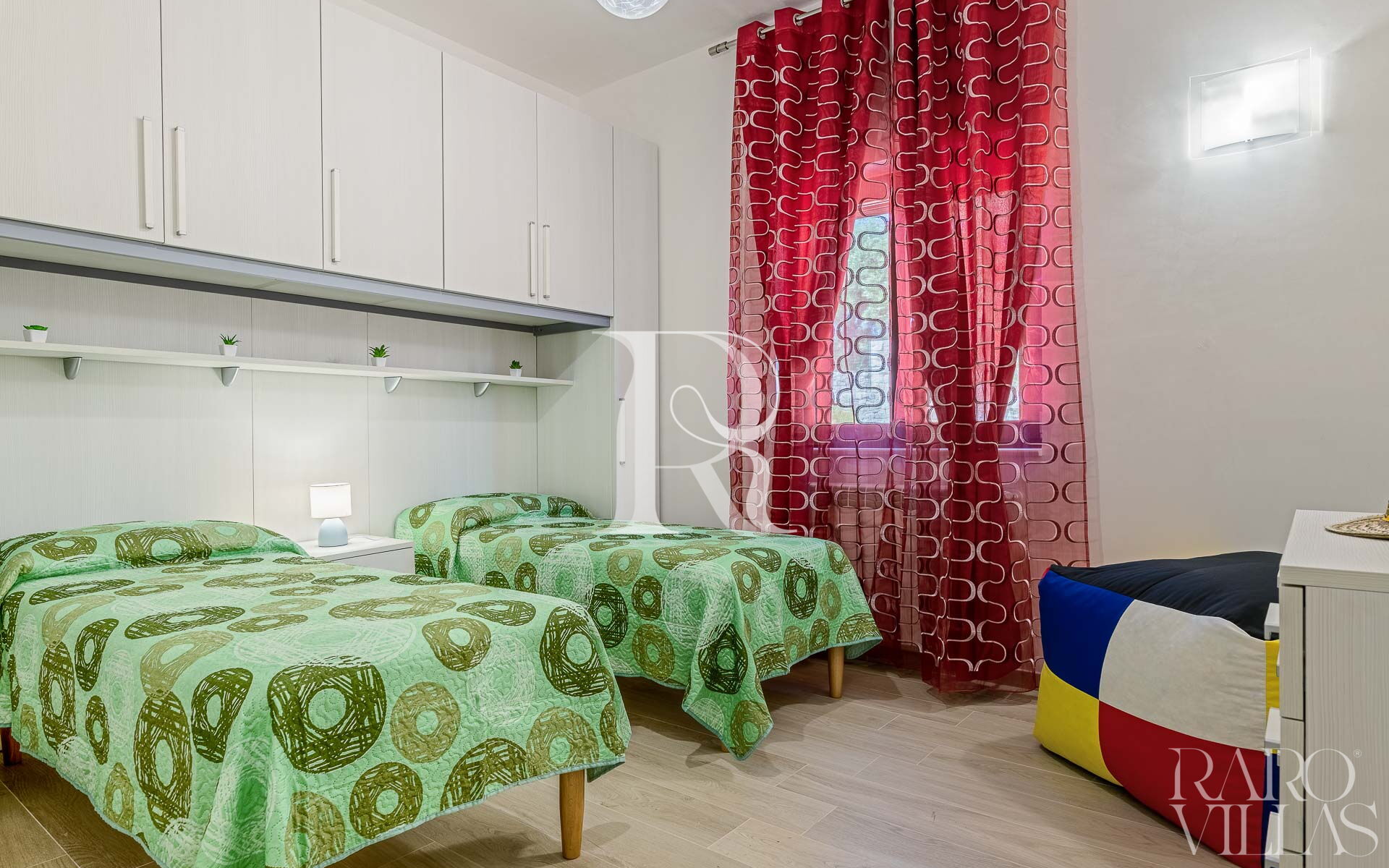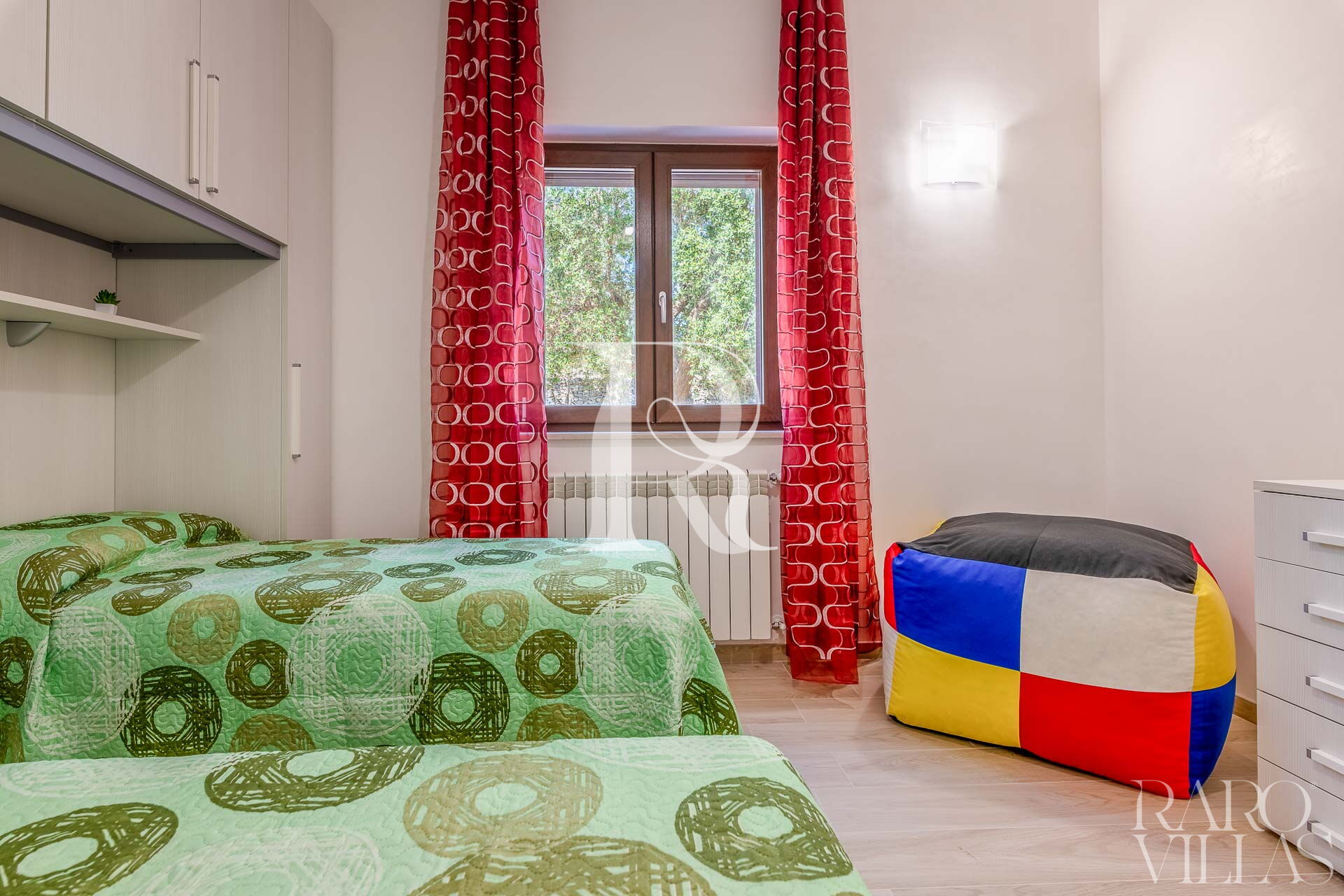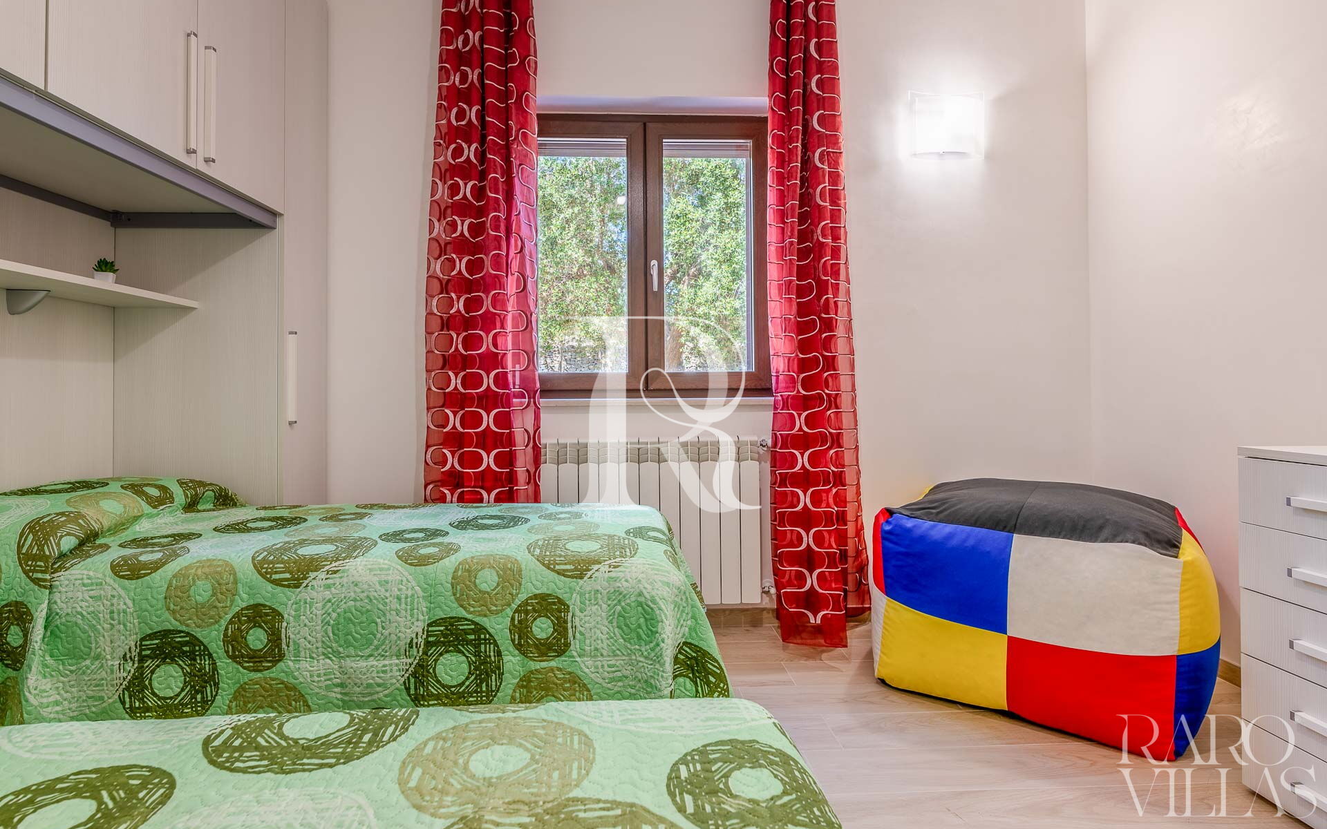 The adjacent bedroom has two single beds with a bedside table, a built-in wardrobe, a chest of drawers and a pouf in the center. The windows are equipped with colored curtains that make the rooms welcoming and comfortable.