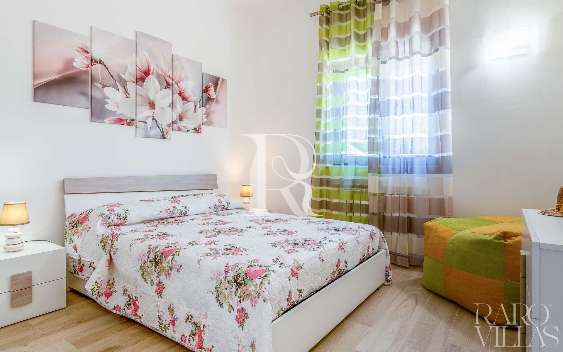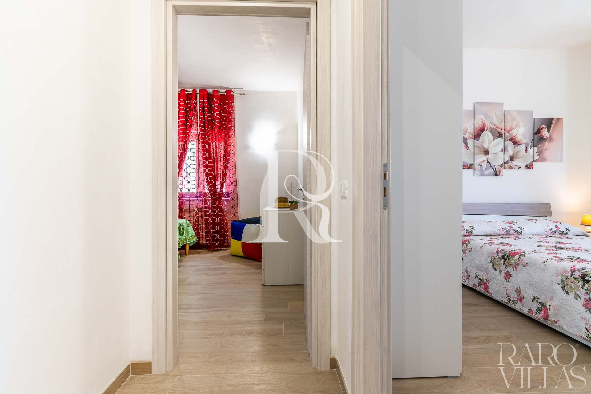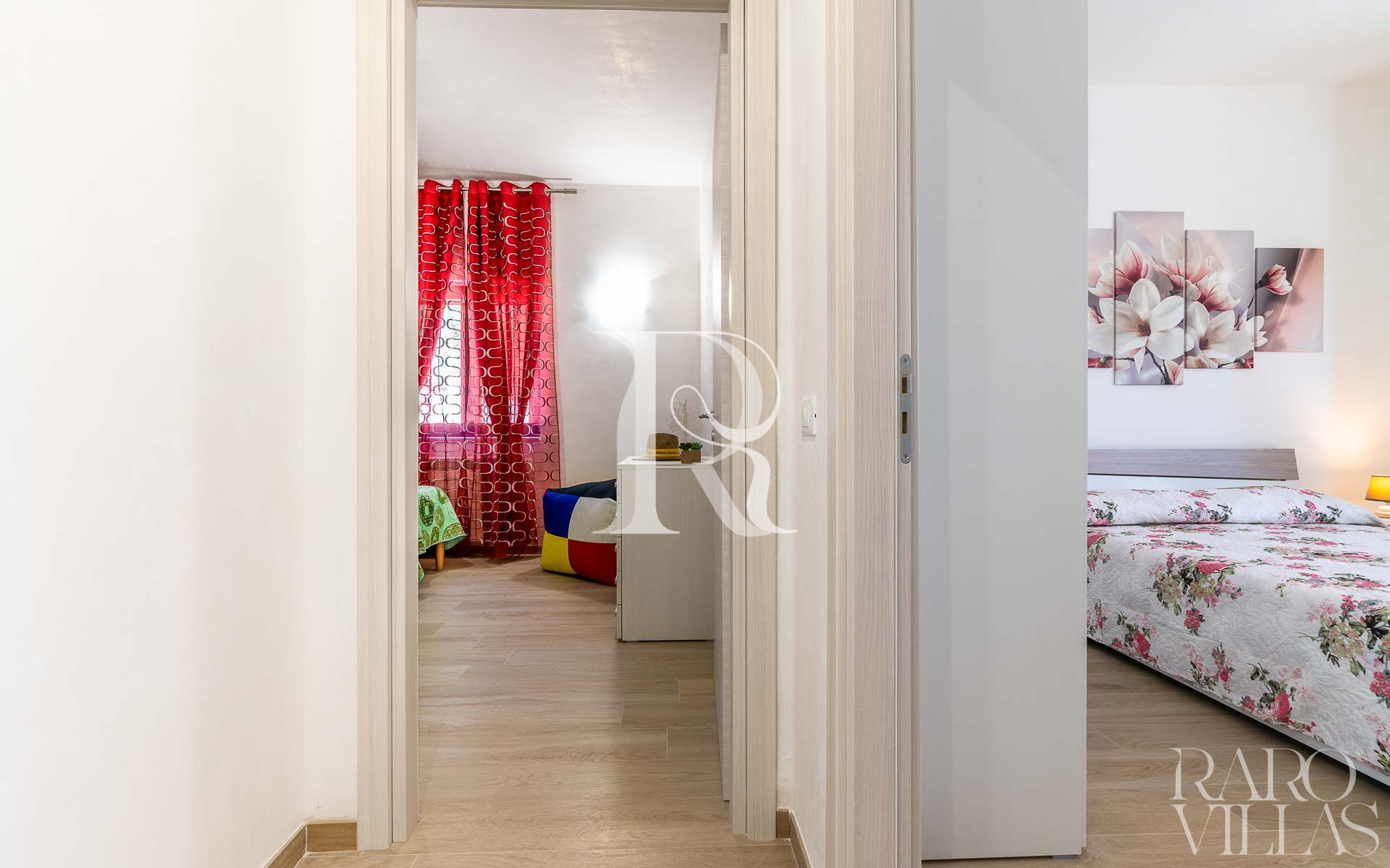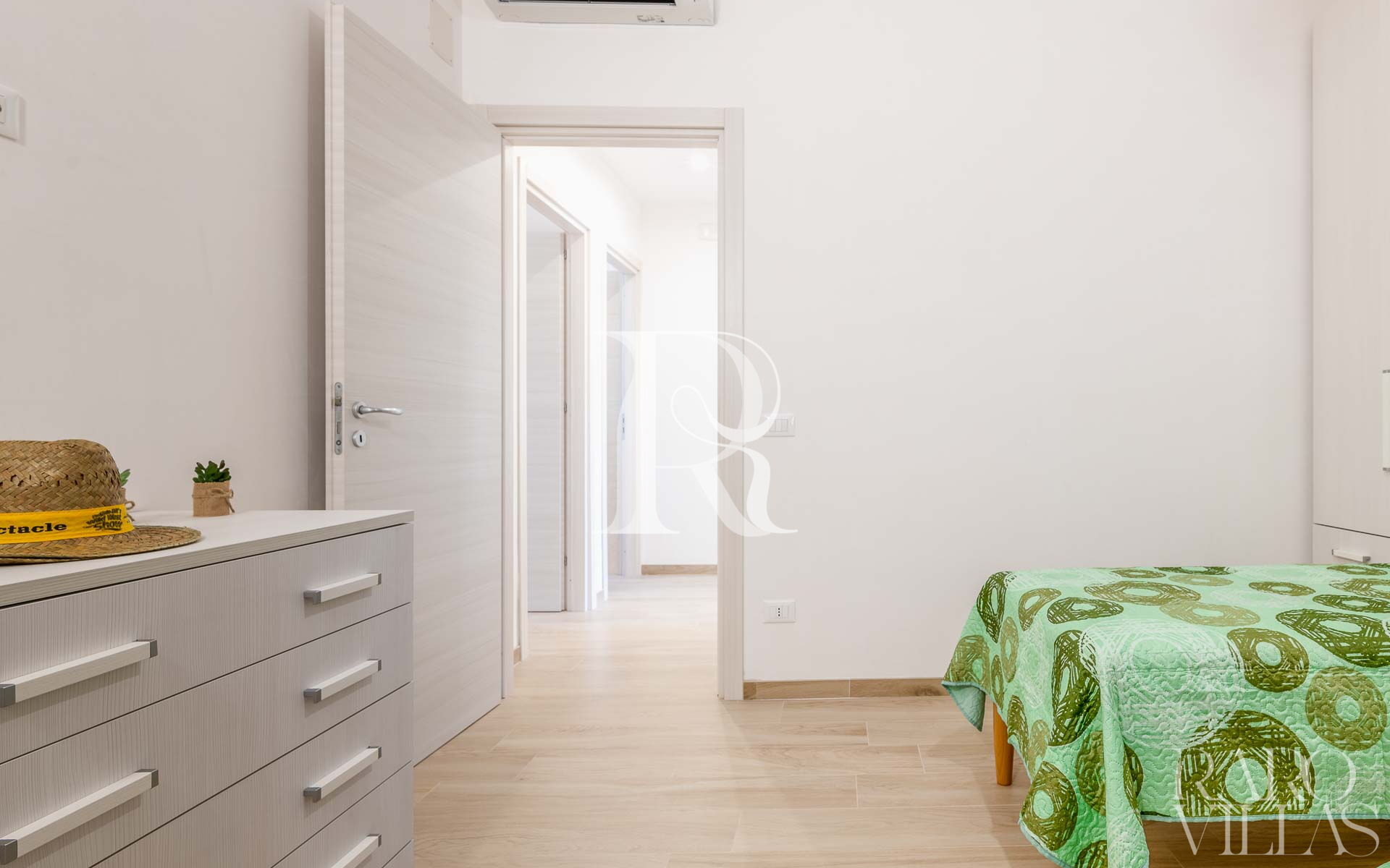 The adjacent bedroom has two single beds with a bedside table, a built-in wardrobe, a chest of drawers and a pouf in the center. The windows are equipped with colored curtains that make the rooms welcoming and comfortable.