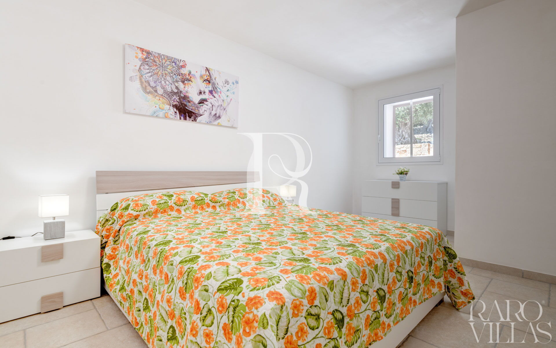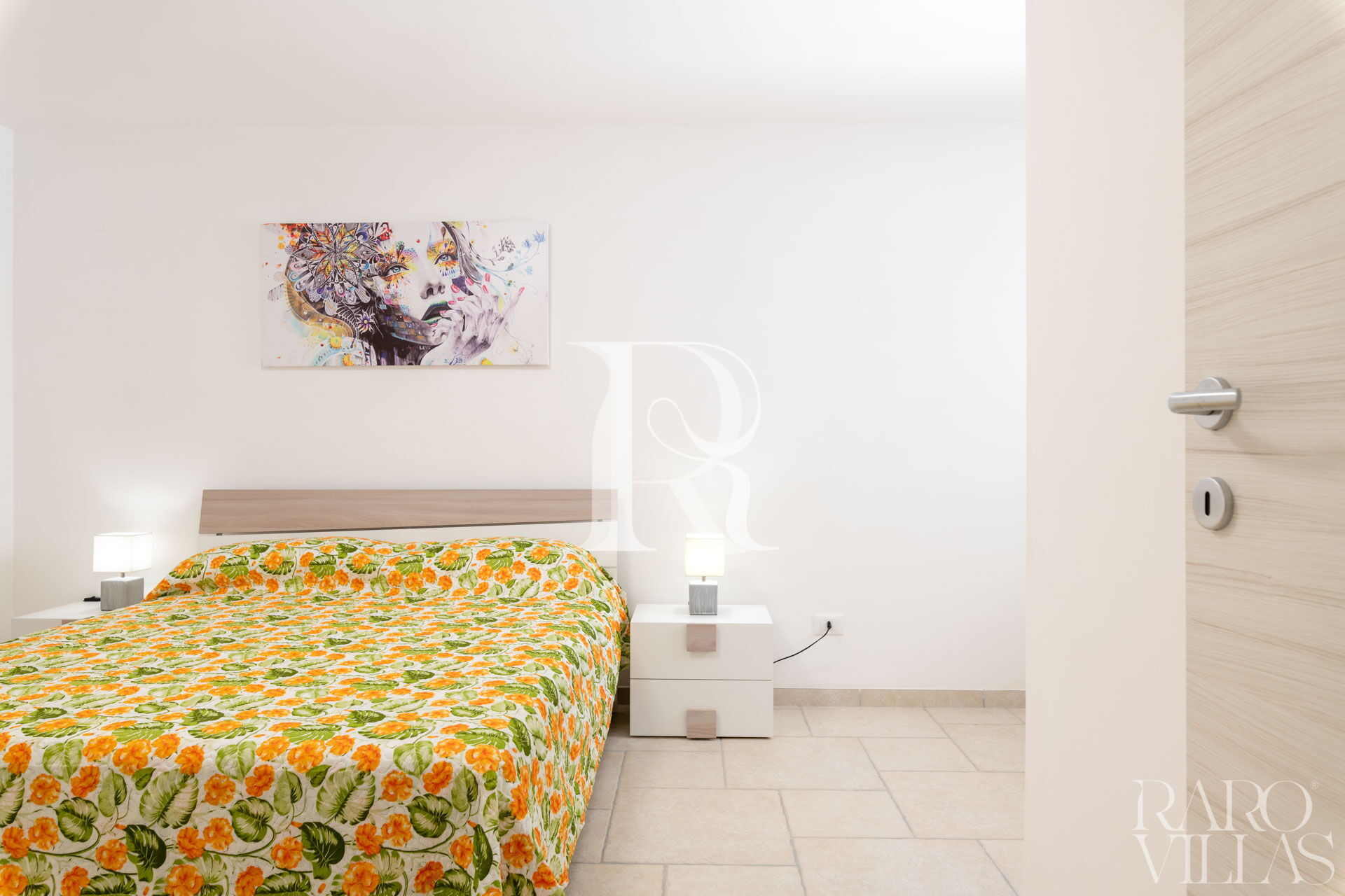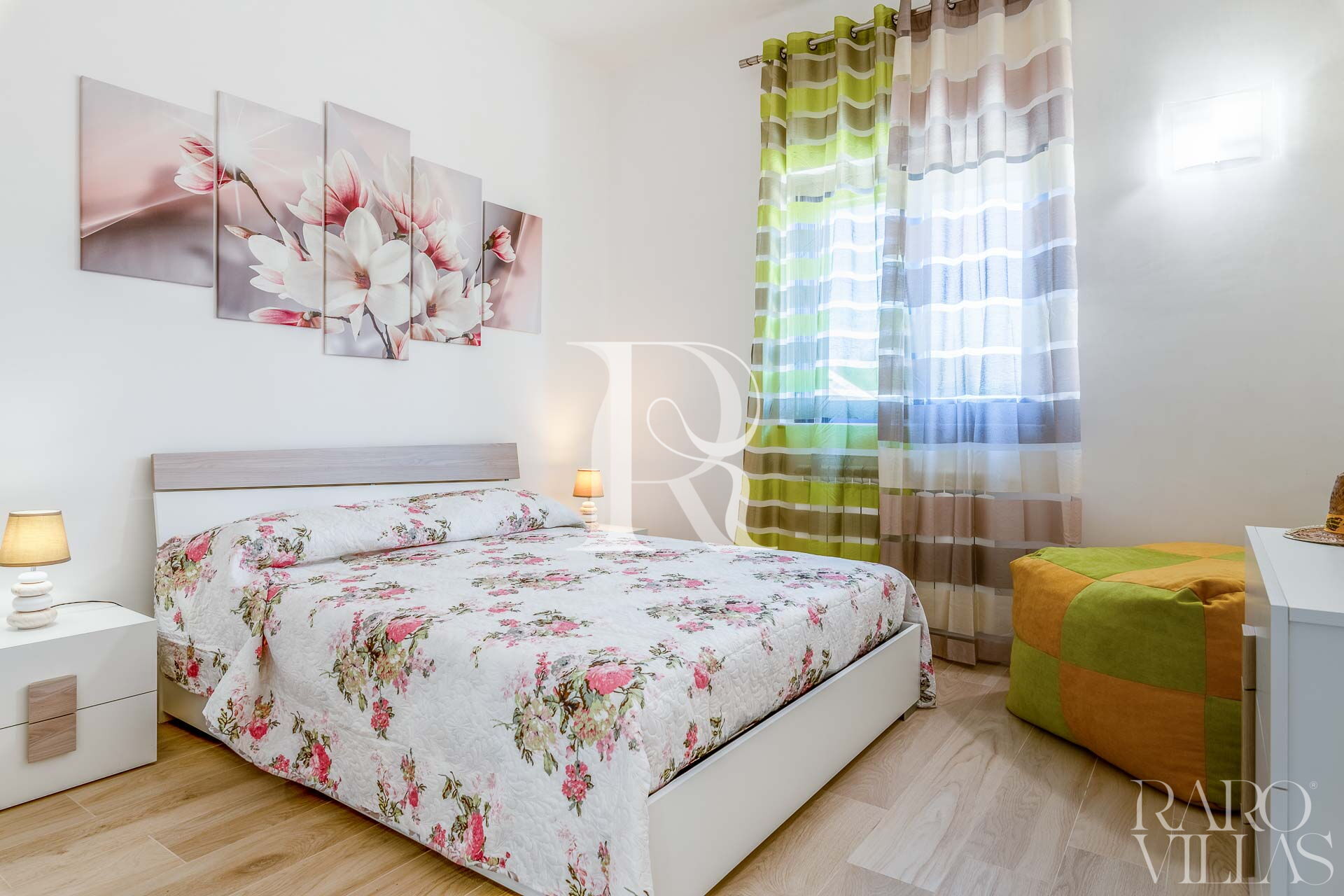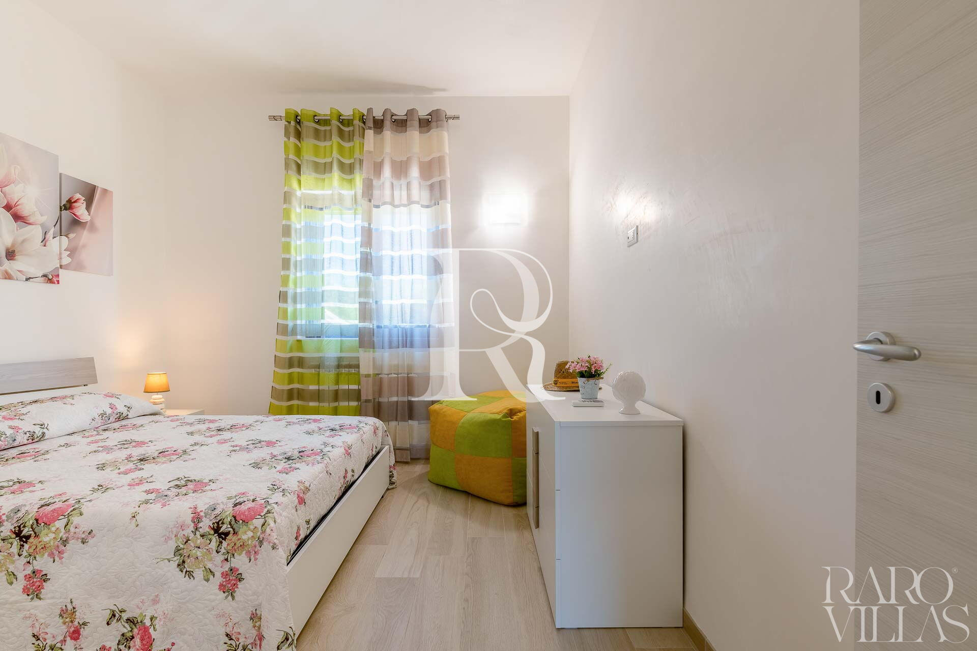 The adjacent bedroom has two single beds with a bedside table, a built-in wardrobe, a chest of drawers and a pouf in the center. The windows are equipped with colored curtains that make the rooms welcoming and comfortable.