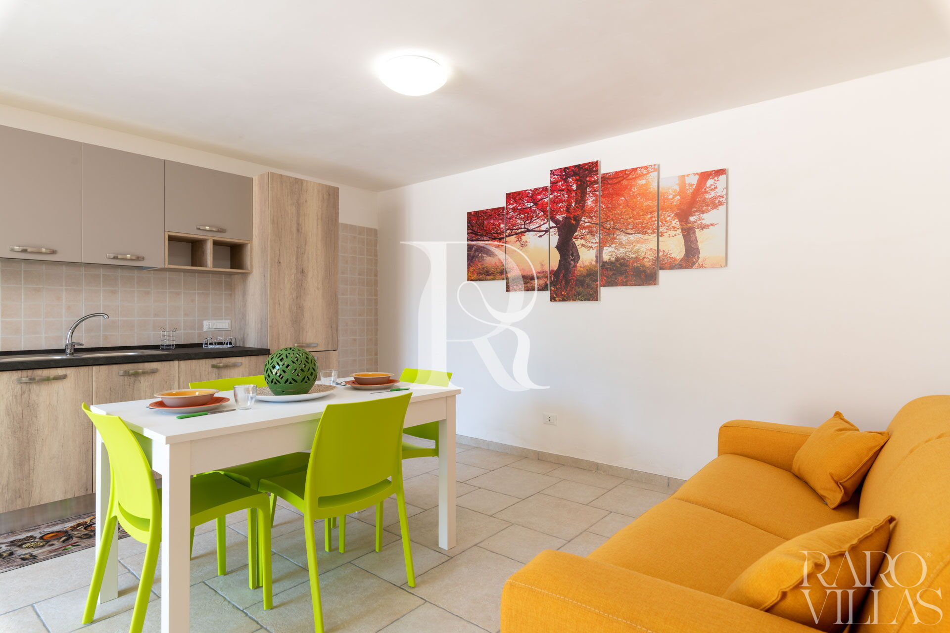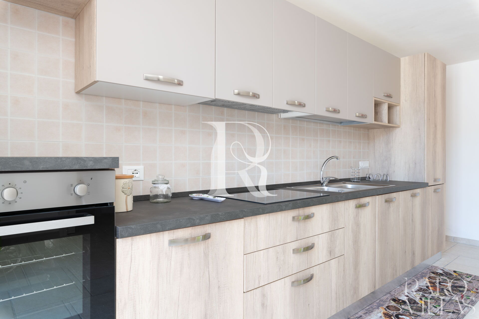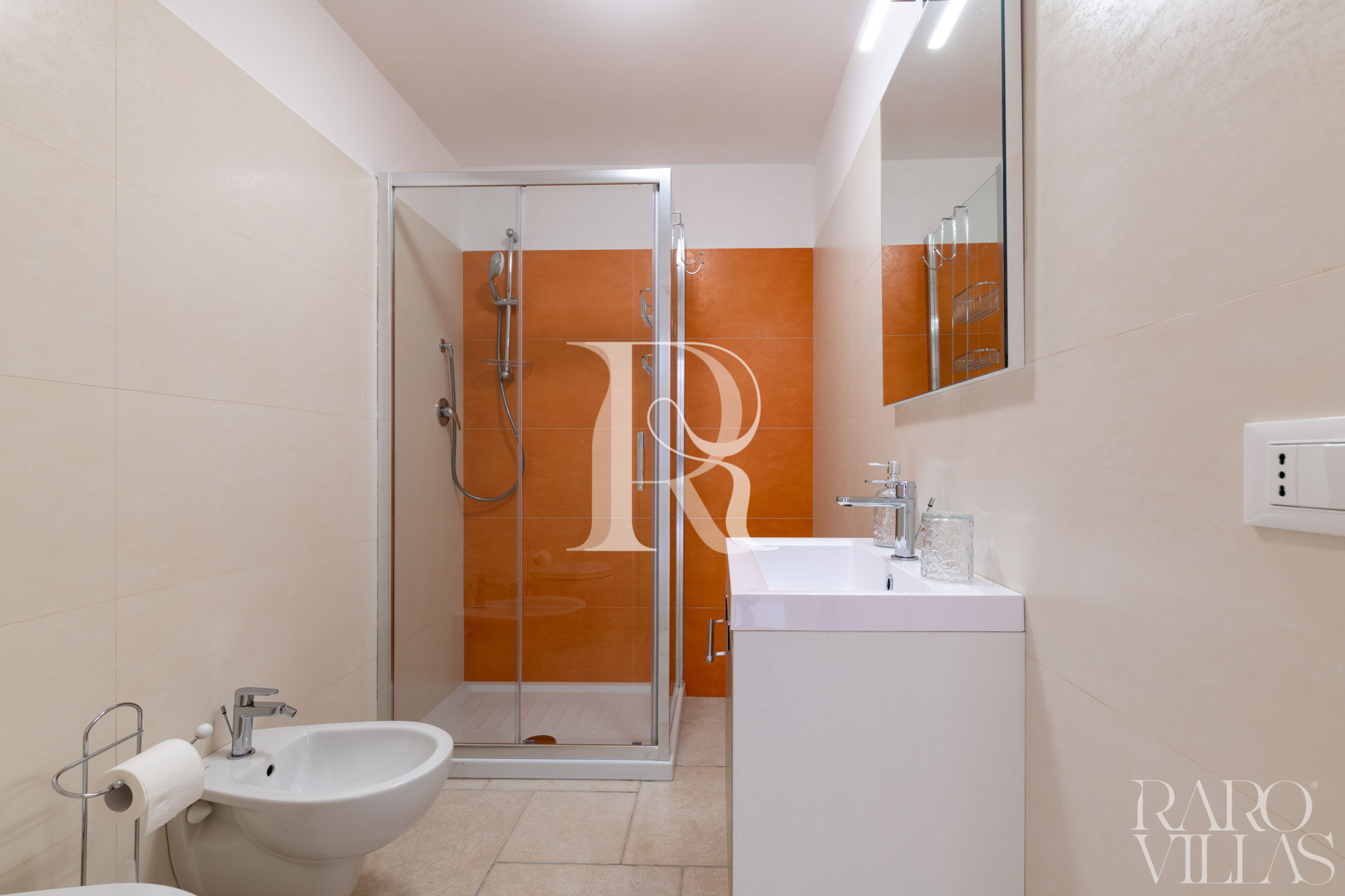 On the lower floor, with access from the outside, there is an independent apartment equipped with a second complete kitchen, a third bedroom with double bed and a complete bathroom (shower, toilet, bidet, sink with mirror).