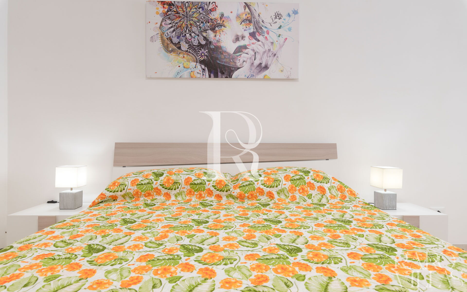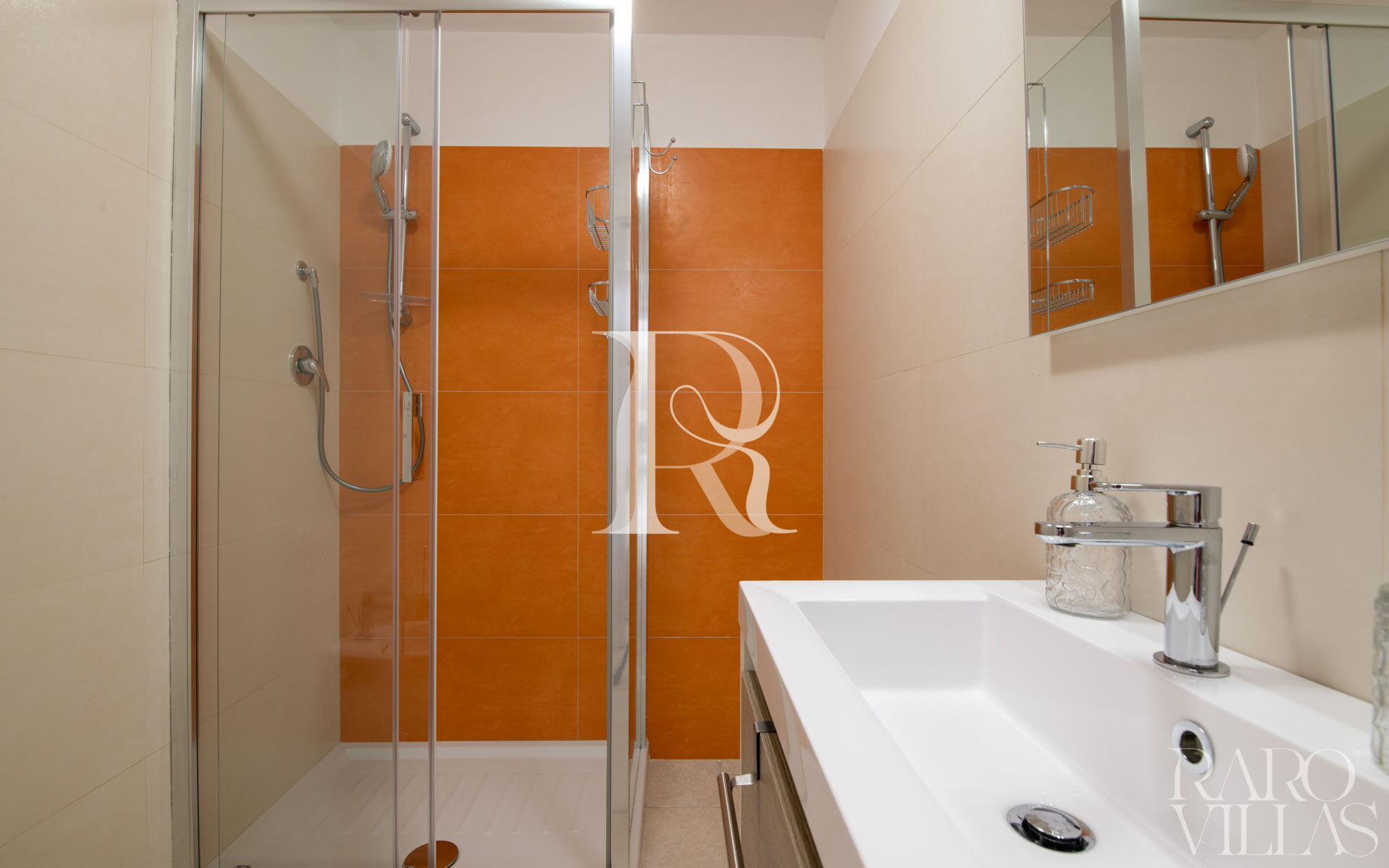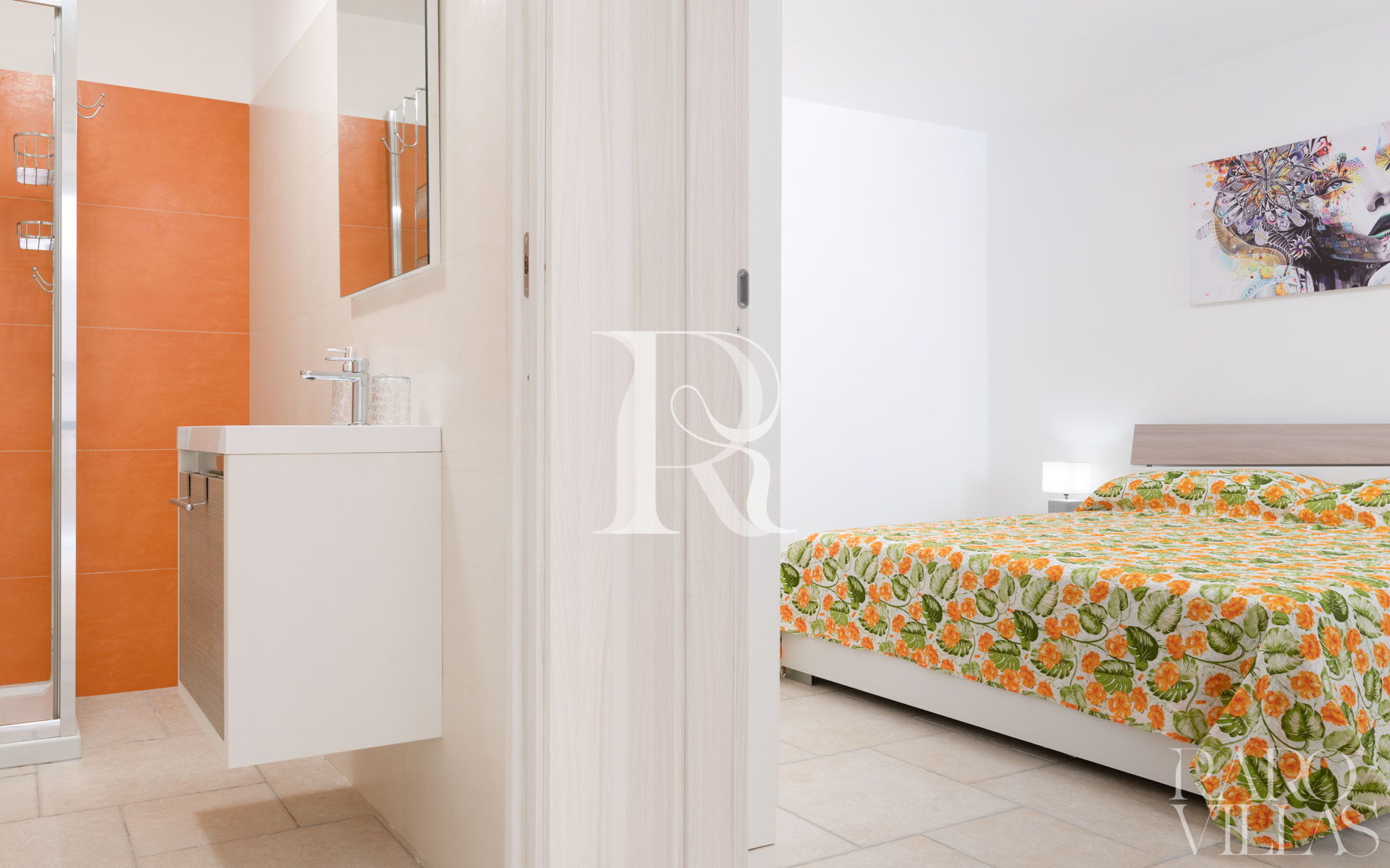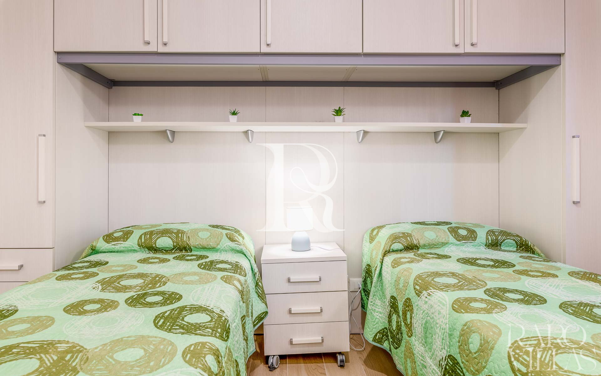 One bedroom is equipped with a double bed with ottoman, chest of drawers, wardrobe and two bedside tables. It shares, with the bedroom with the two single beds, a bathroom complete with a shower, a double sink with mirror, toilet and bidet.