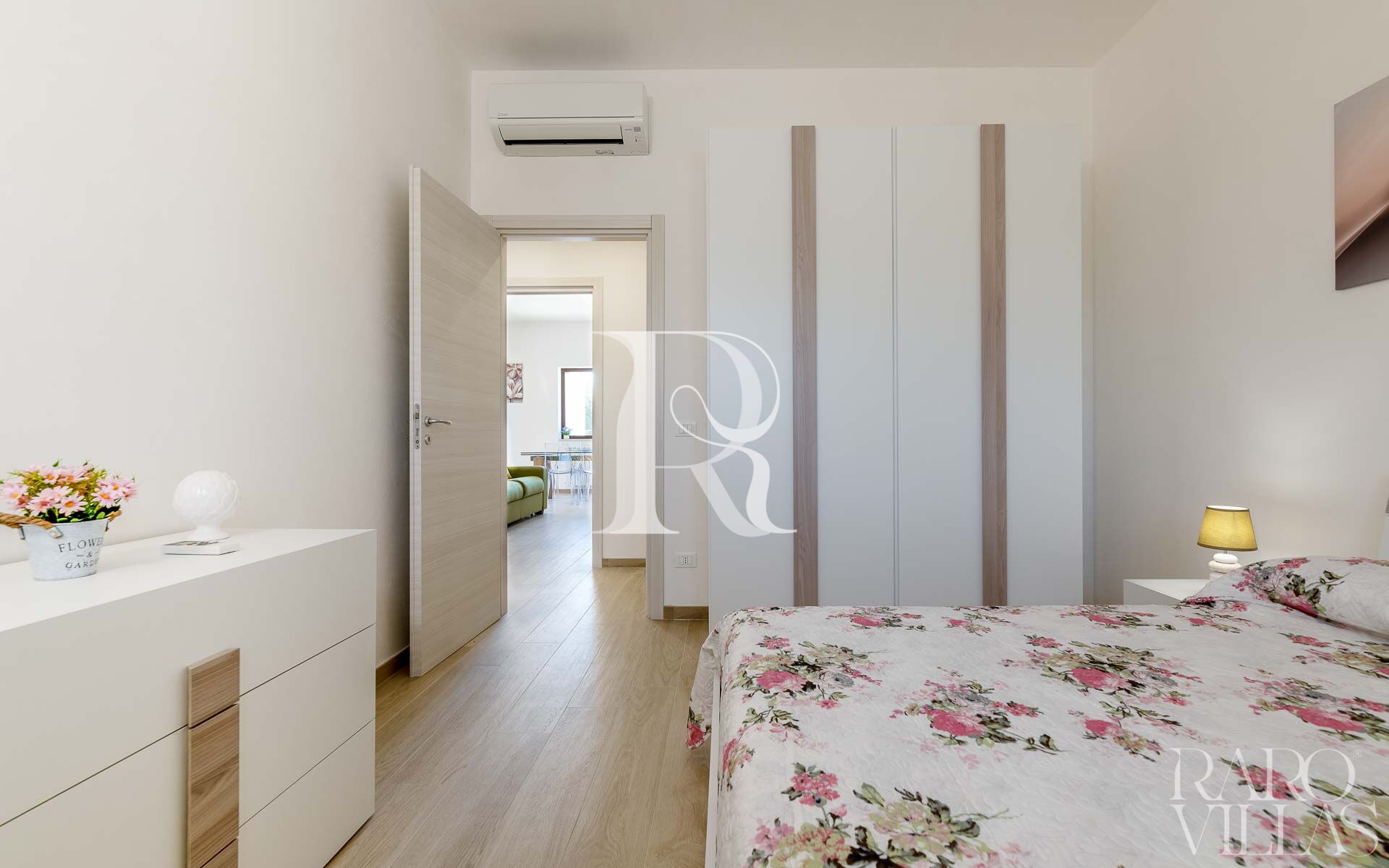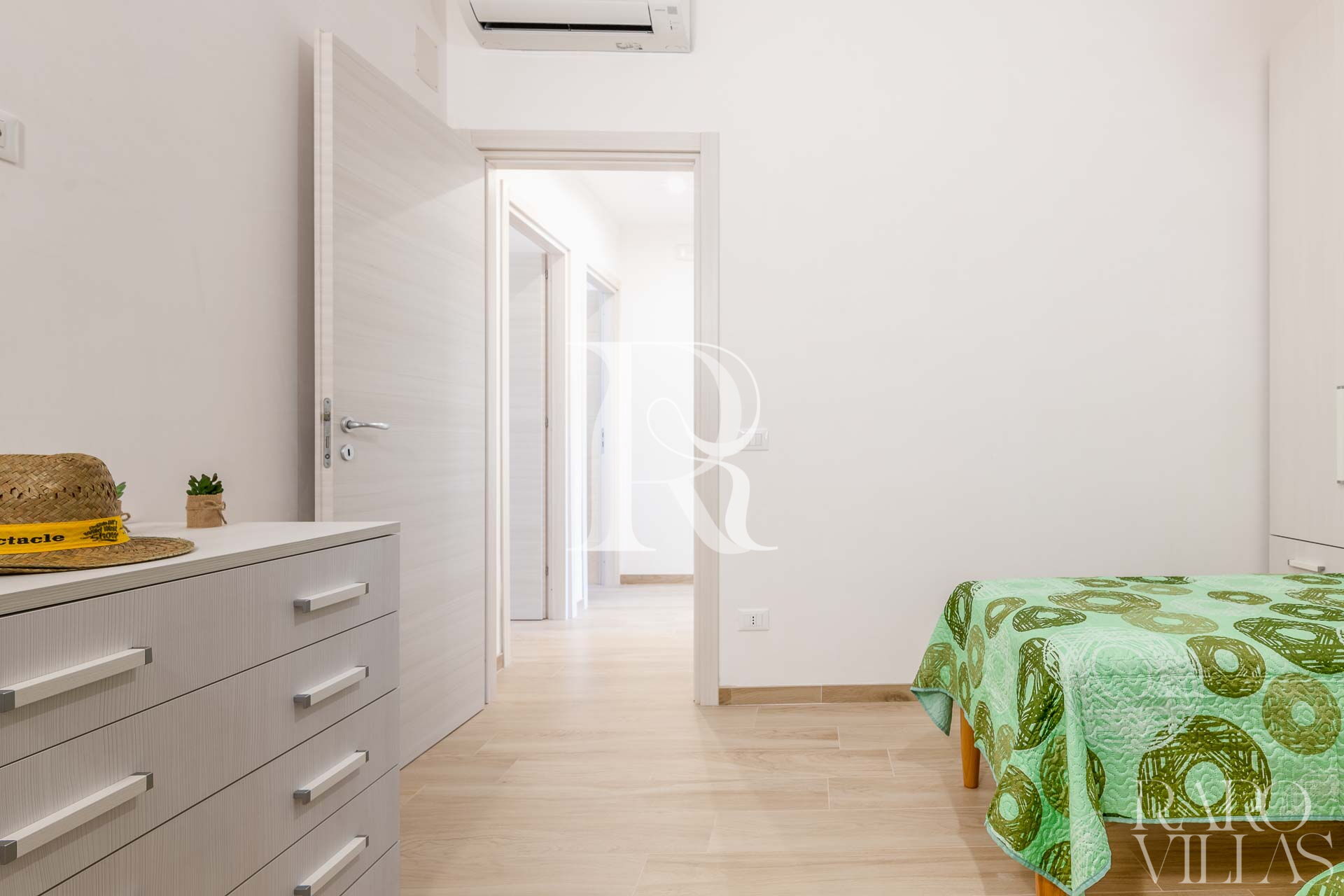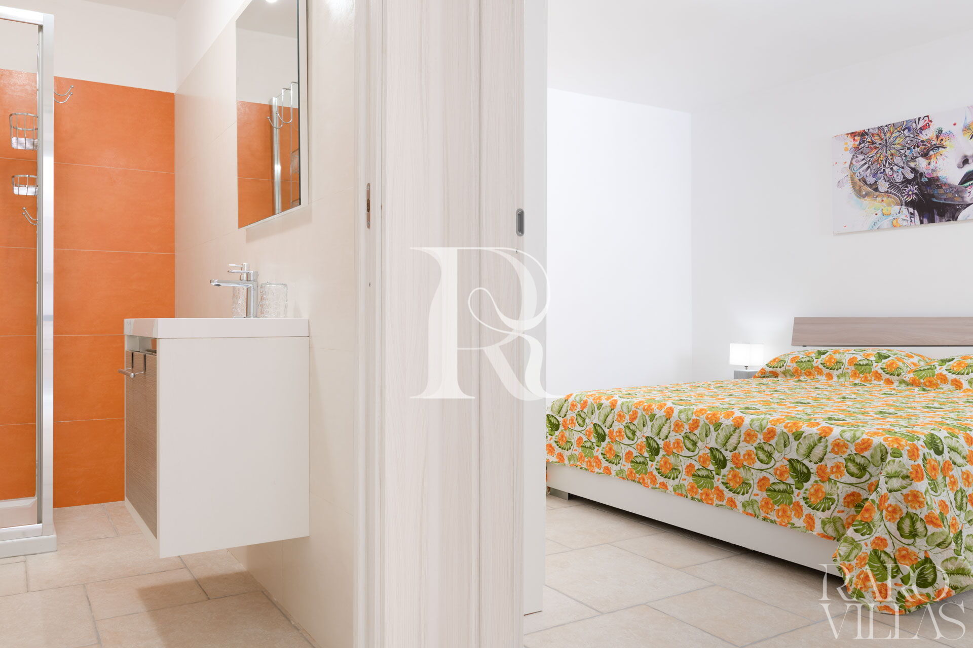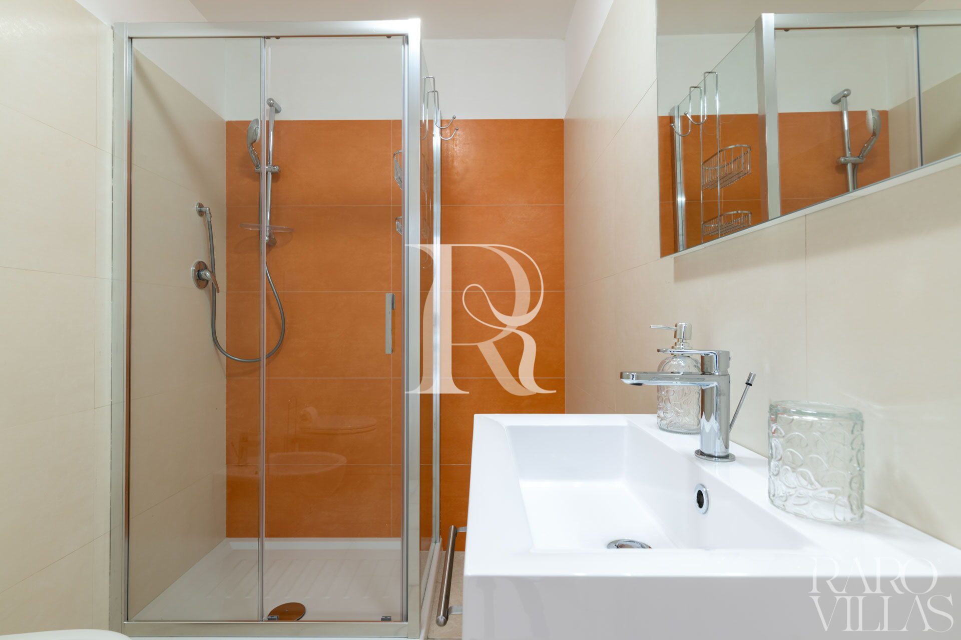 One bedroom is equipped with a double bed with ottoman, chest of drawers, wardrobe and two bedside tables. It shares, with the bedroom with the two single beds, a bathroom complete with a shower, a double sink with mirror, toilet and bidet.