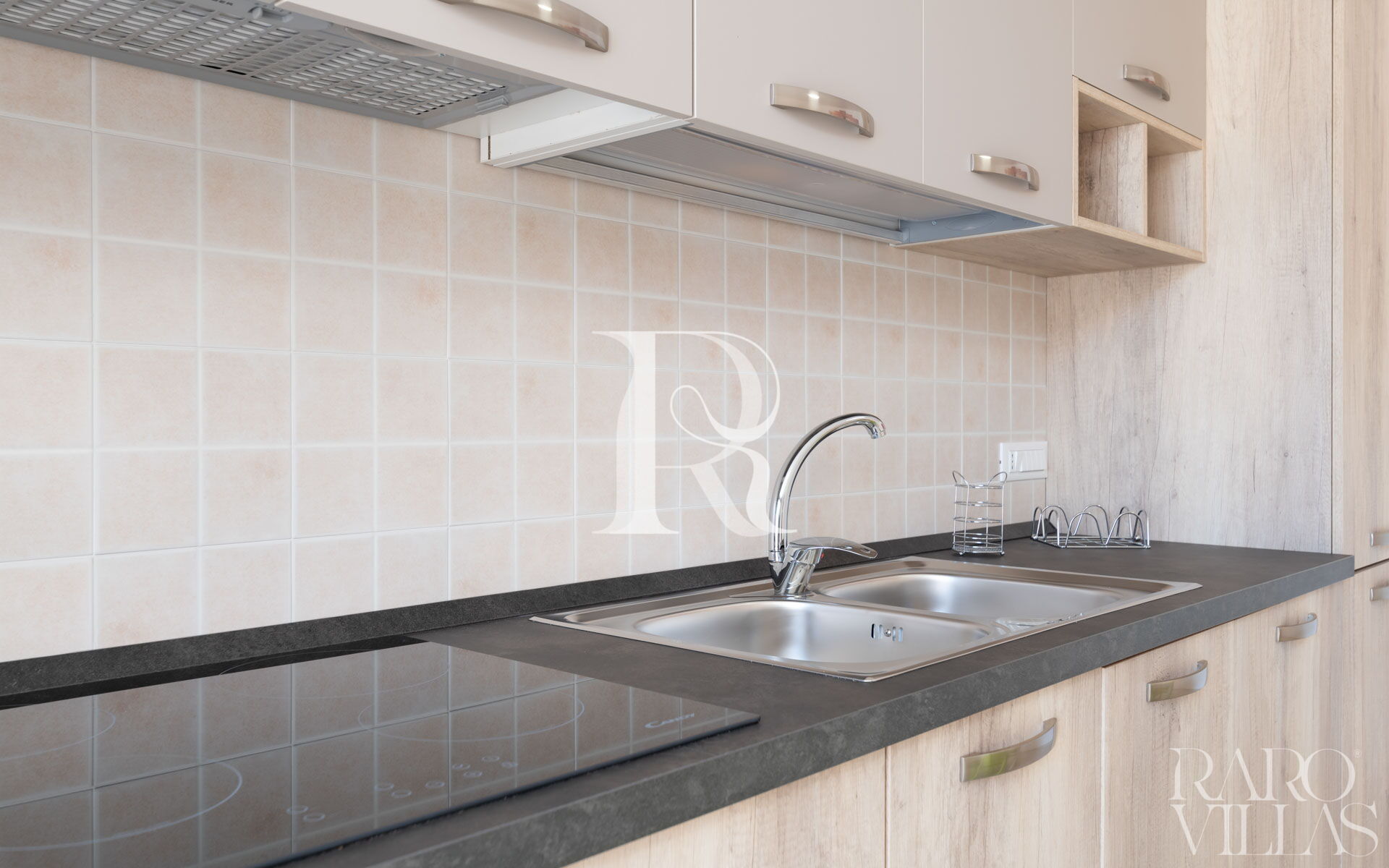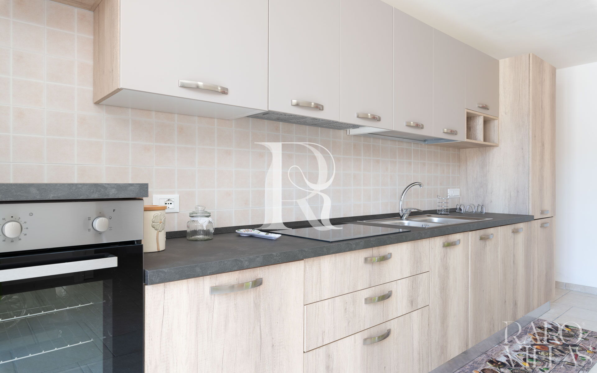The second kitchen has a double sink, electric hob with stove, fridge / freezer, electric oven and dishwasher. It is also equipped with a comfortable sofa, a dining table for four diners and a small TV on the wall.