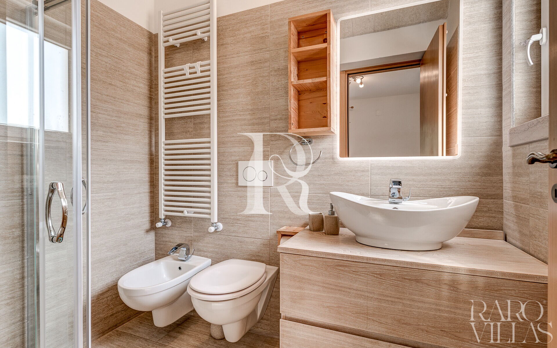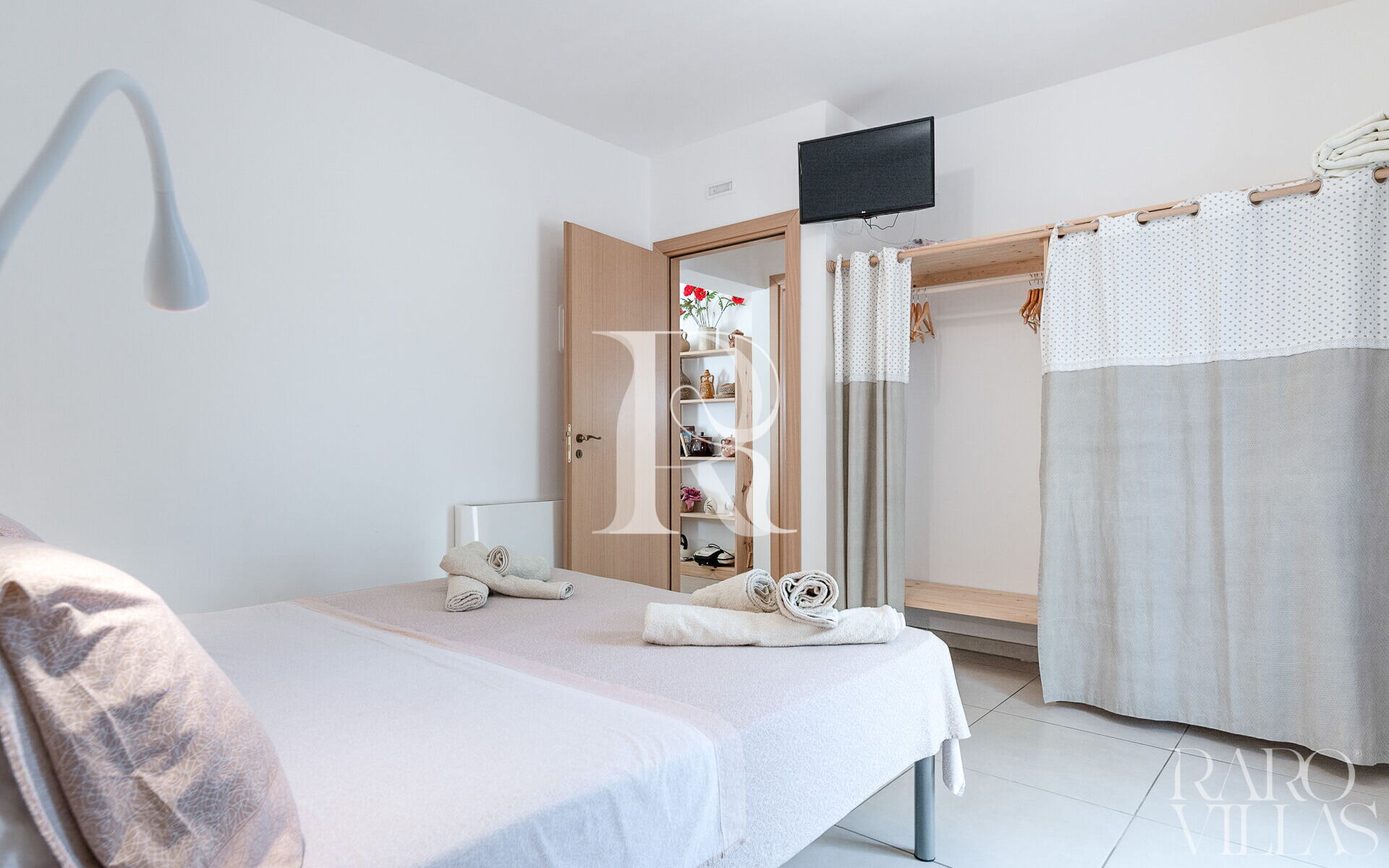 A corridor that also has exterior views leads to a bedroom consisting of a double bed and a single bed and a bathroom with shower and toilet; from this room you can directly access the outdoor spaces.
