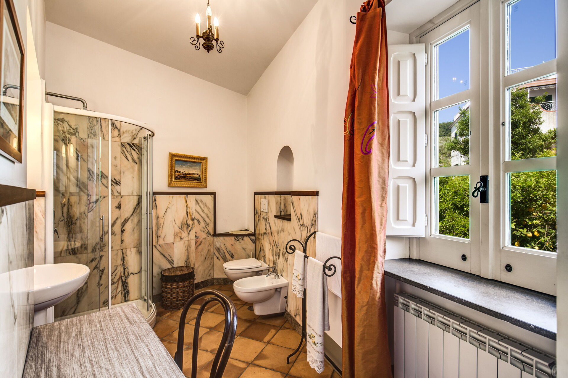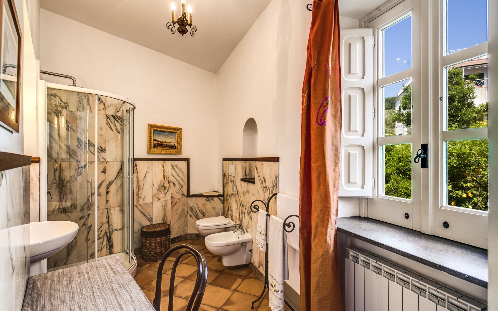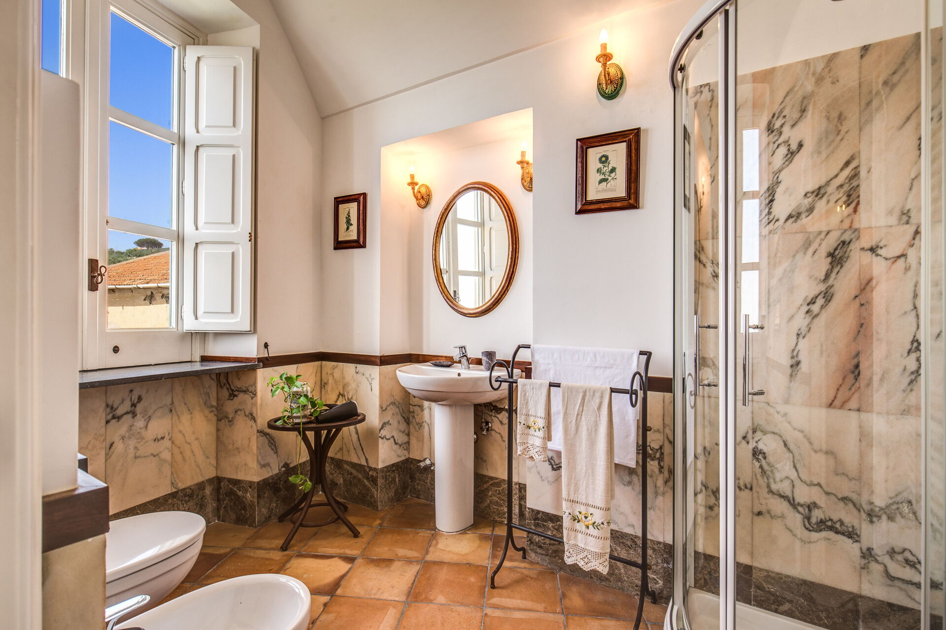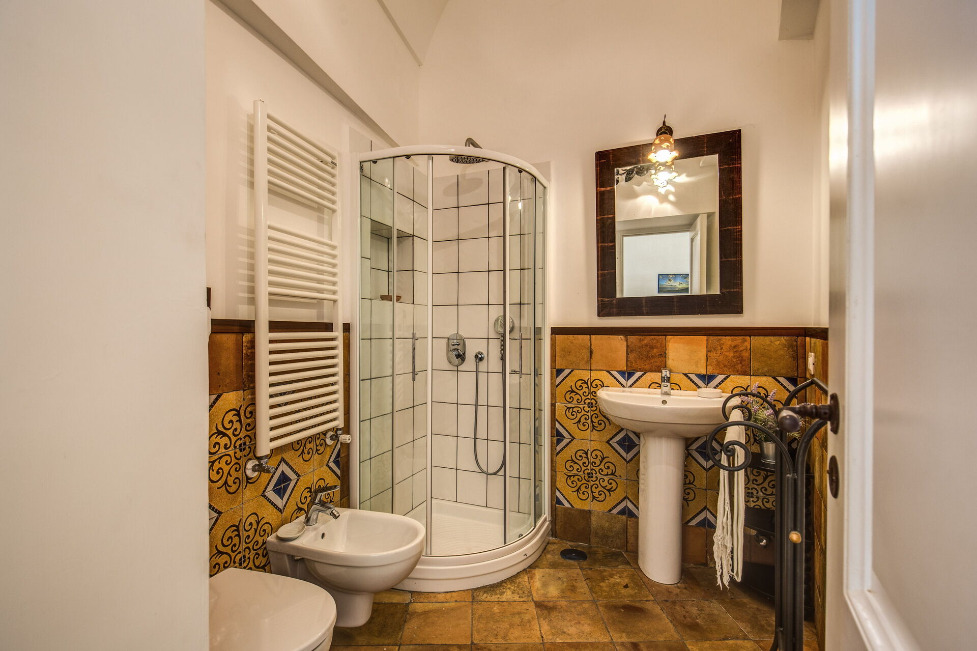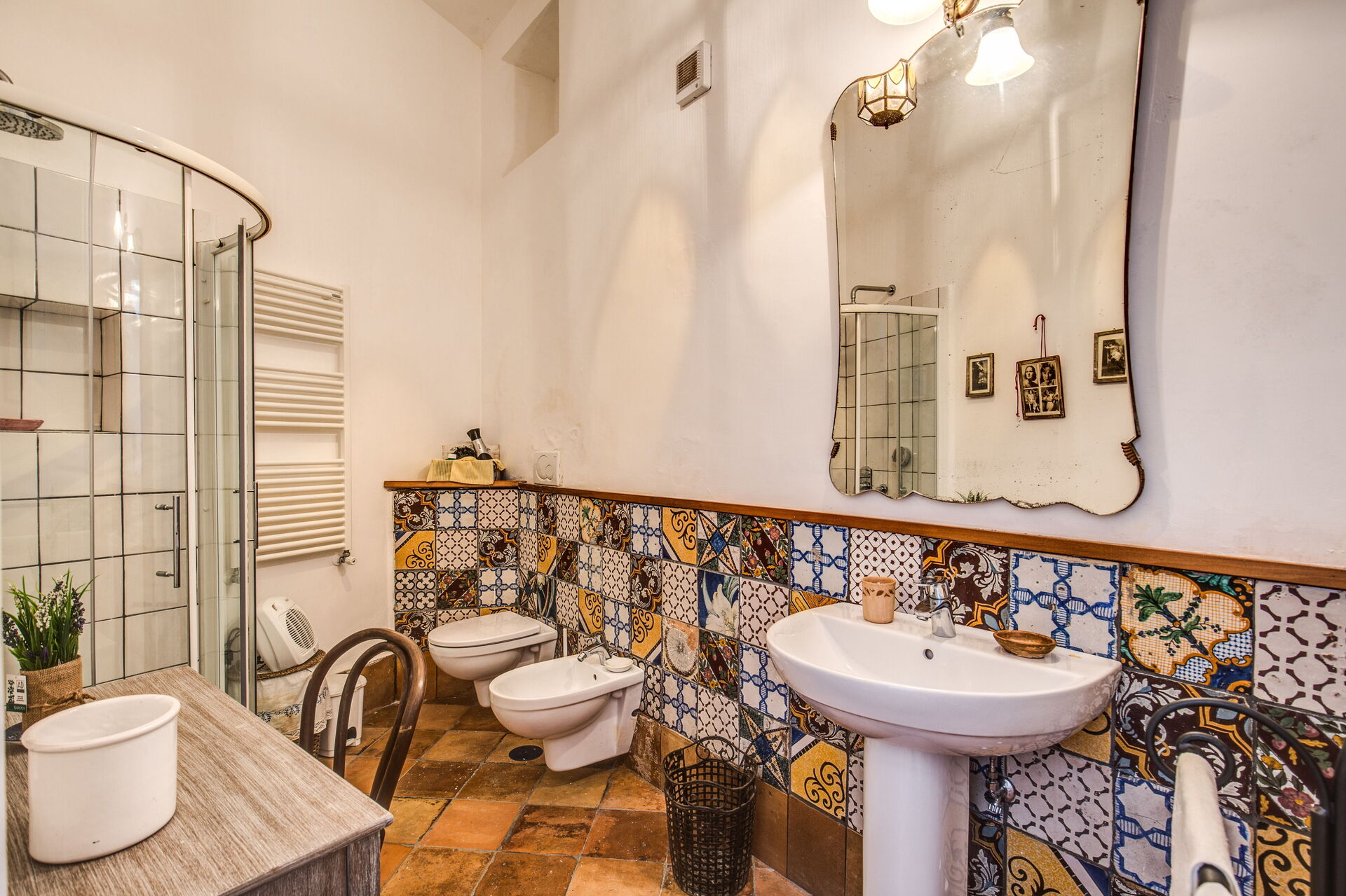 Bathroom: basin, toilet, bidet, shower.