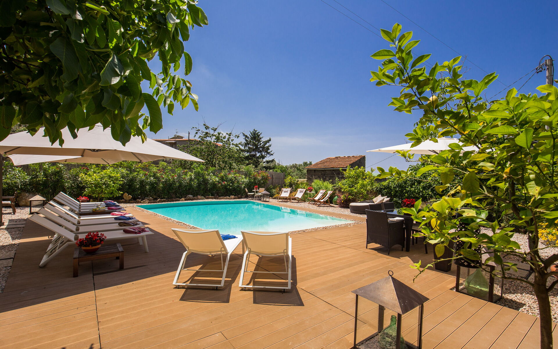 Garden: swimming pool, shower, al fresco dining, dining table, garden furniture, sunbed.