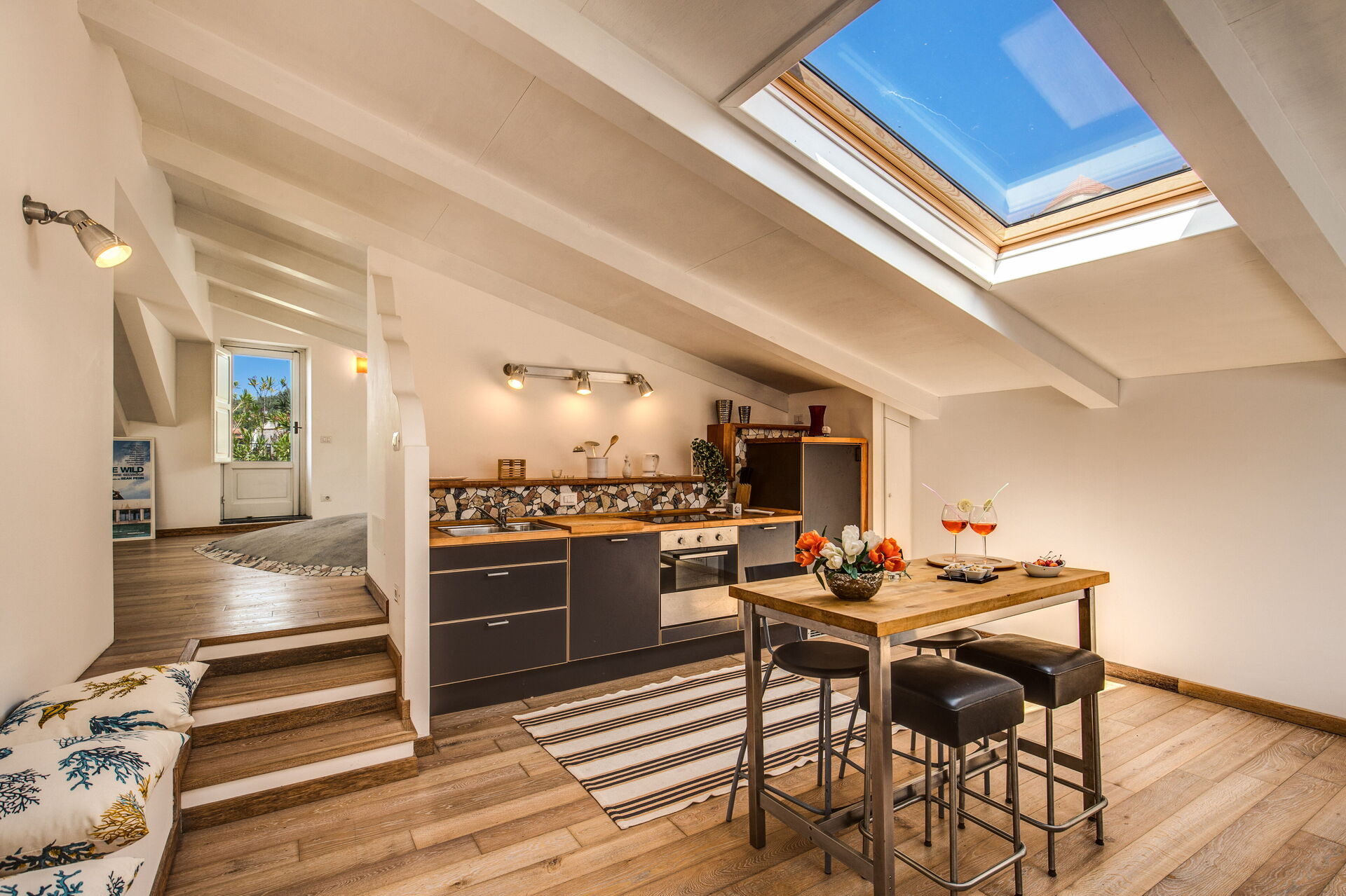 Open space: dining table, double bed, sofa bed double, WIFI internet, air conditioning, fridge, stove top, freezer, well equipped kitchen, italian coffee machine, exit to the terrace.