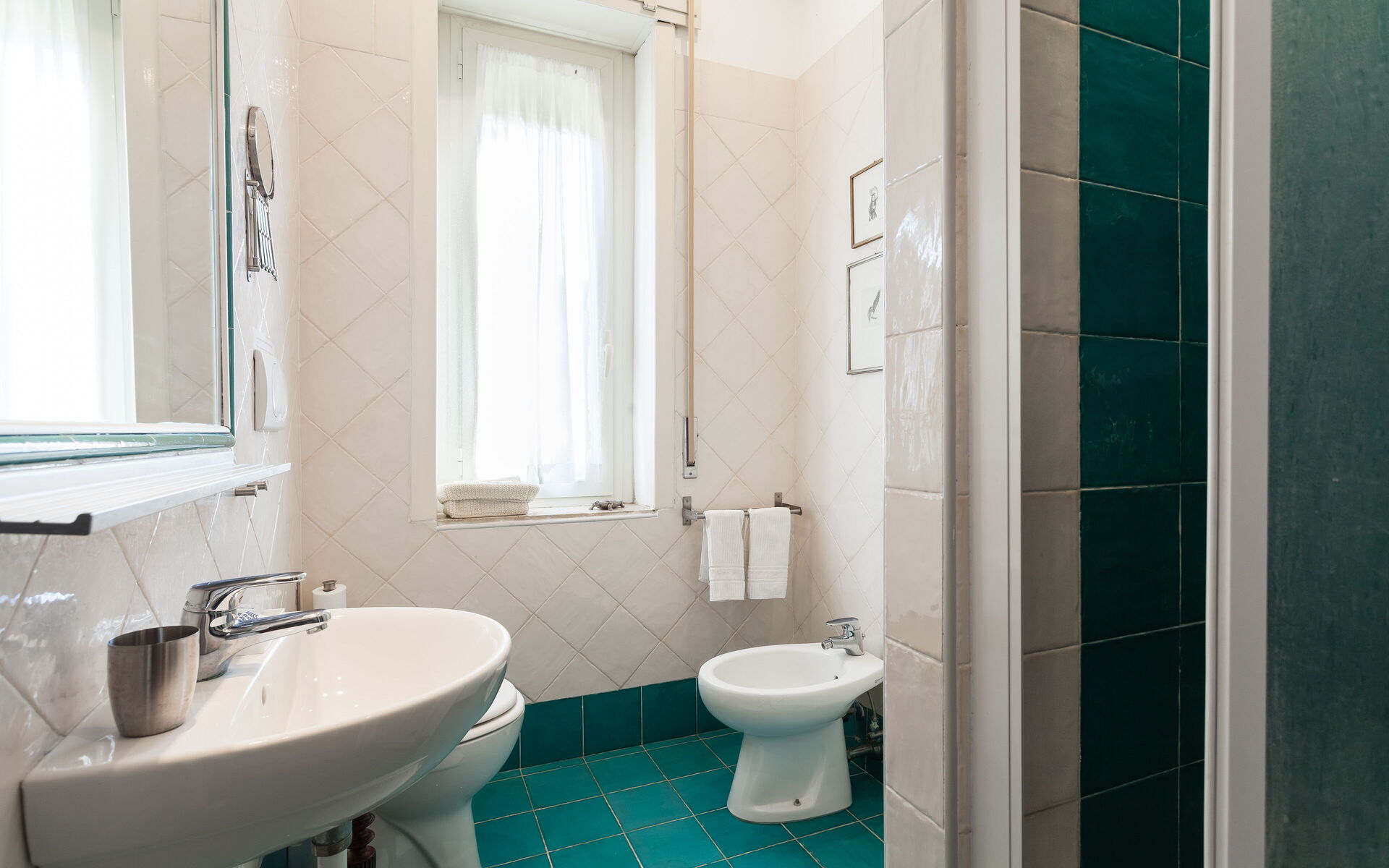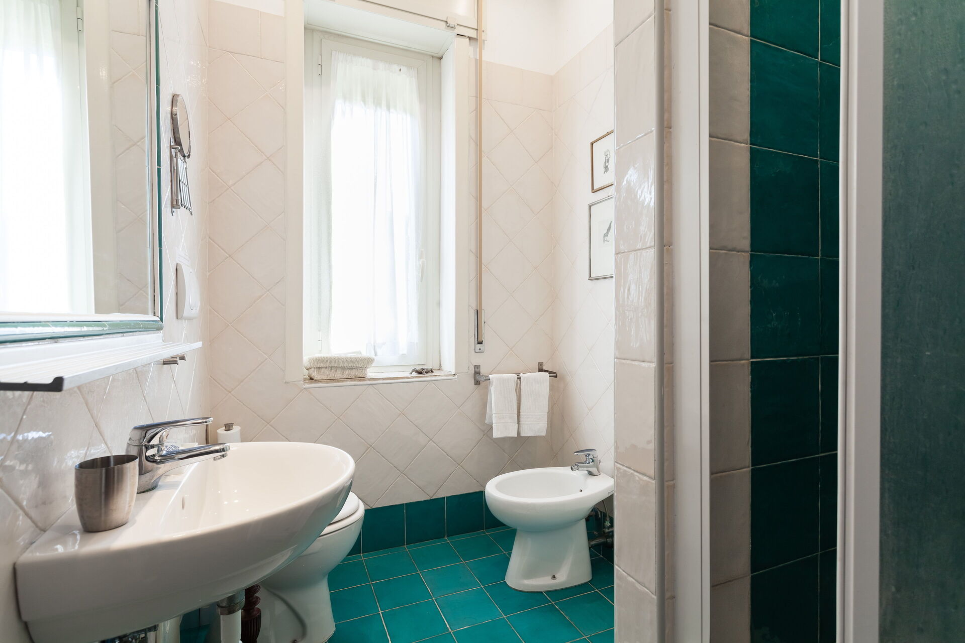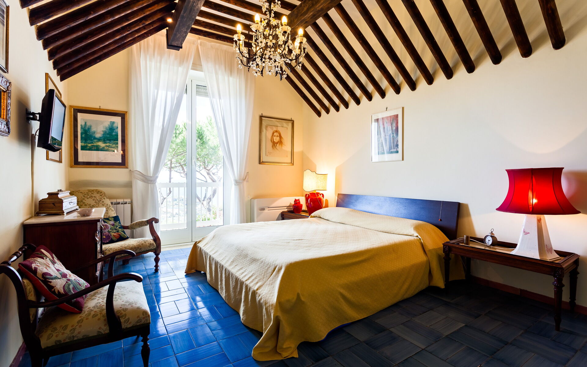 Bedroom + Ensuite Bathroom: double bed, two single beds, WIFI internet, air conditioning, television, working desk, fridge, basin, toilet, bidet, bathtub, shower, hairdryer, exit to the garden.