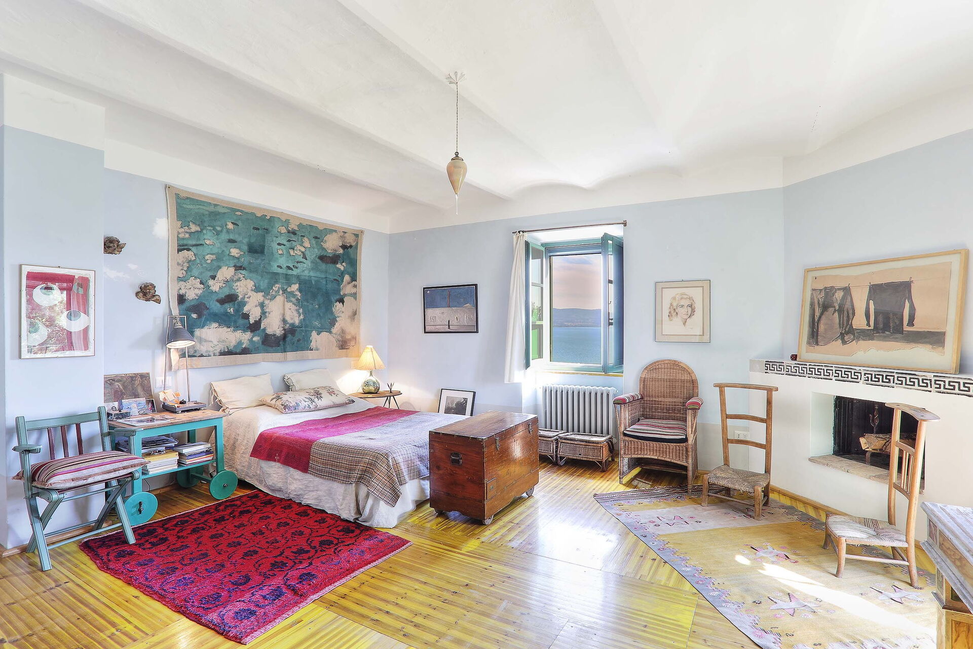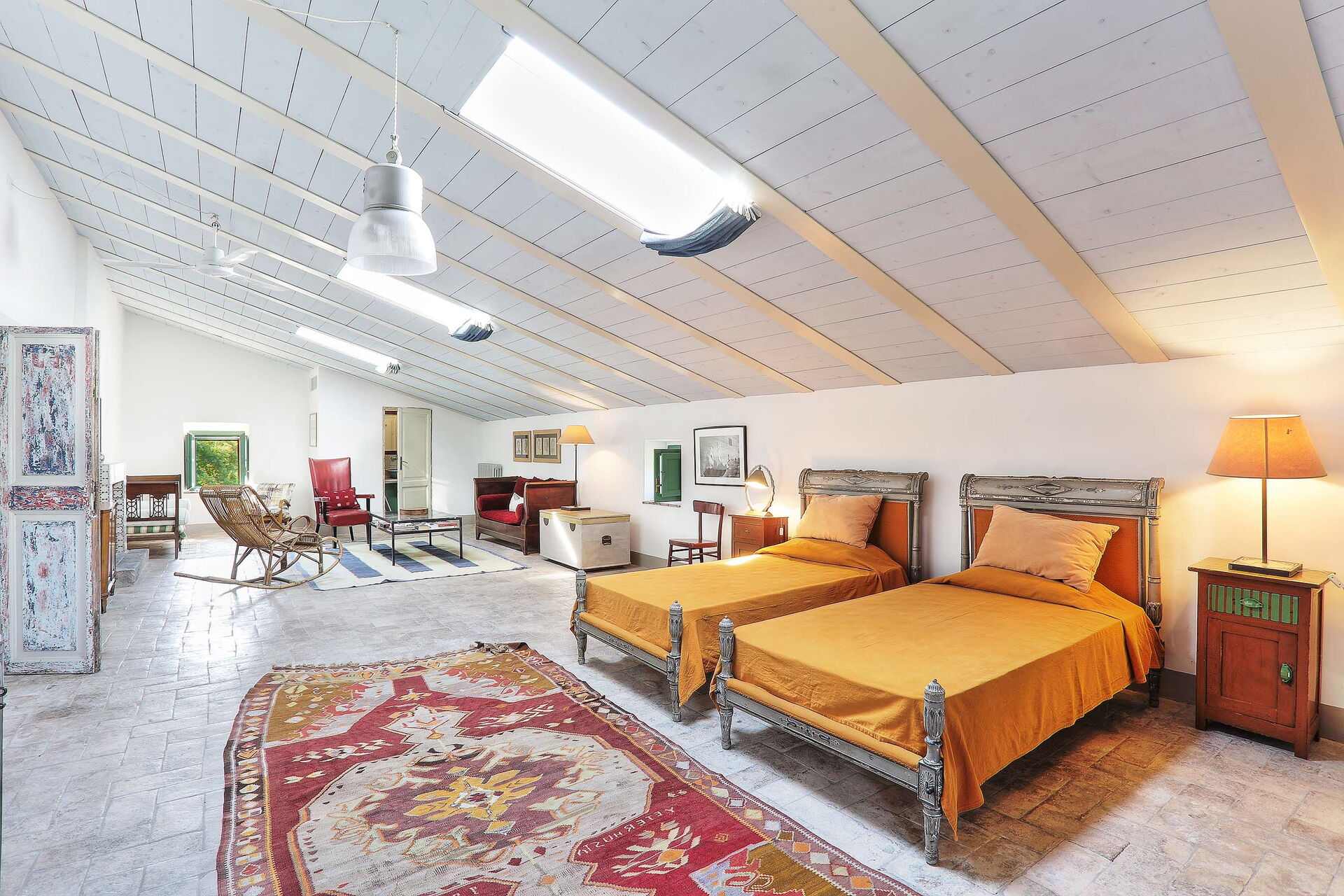 Bedroom + Ensuite Bathroom: two single beds, mosquito net, portable fan, sofa, three armchairs, fireplace, basin, toilet, bidet, shower.