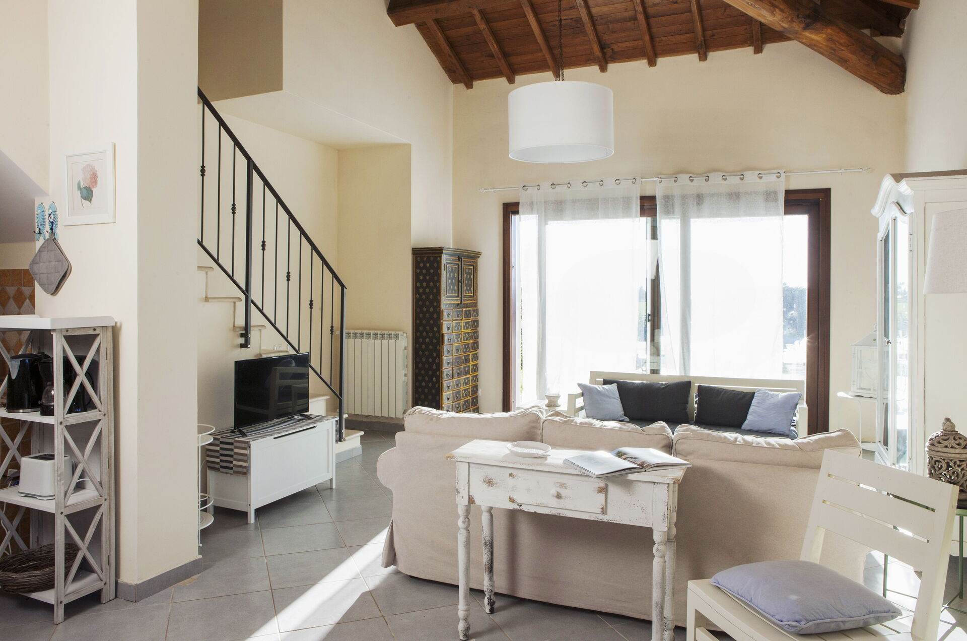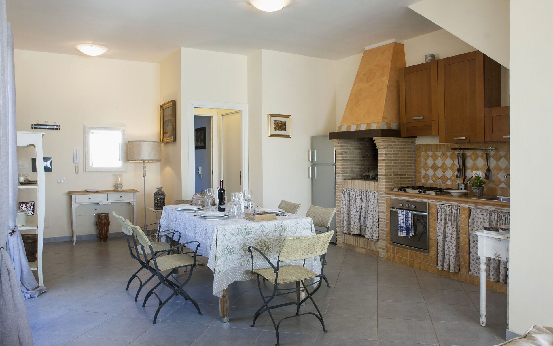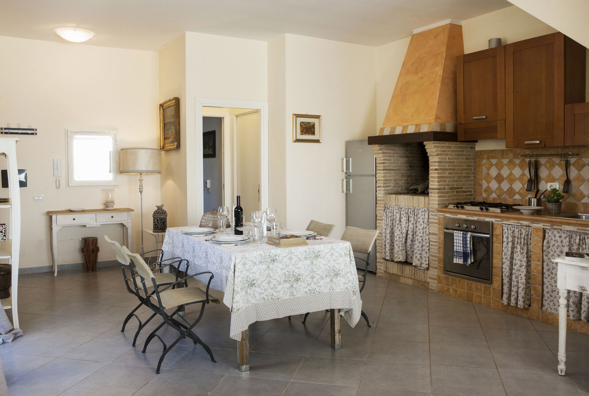 Kitchen + living room: well equipped kitchen, dining table, dishwasher, fridge, freezer, stove top, oven, toaster, american coffee machine, sofa, fireplace, WIFI internet, mosquito net, television, exit to the patio.