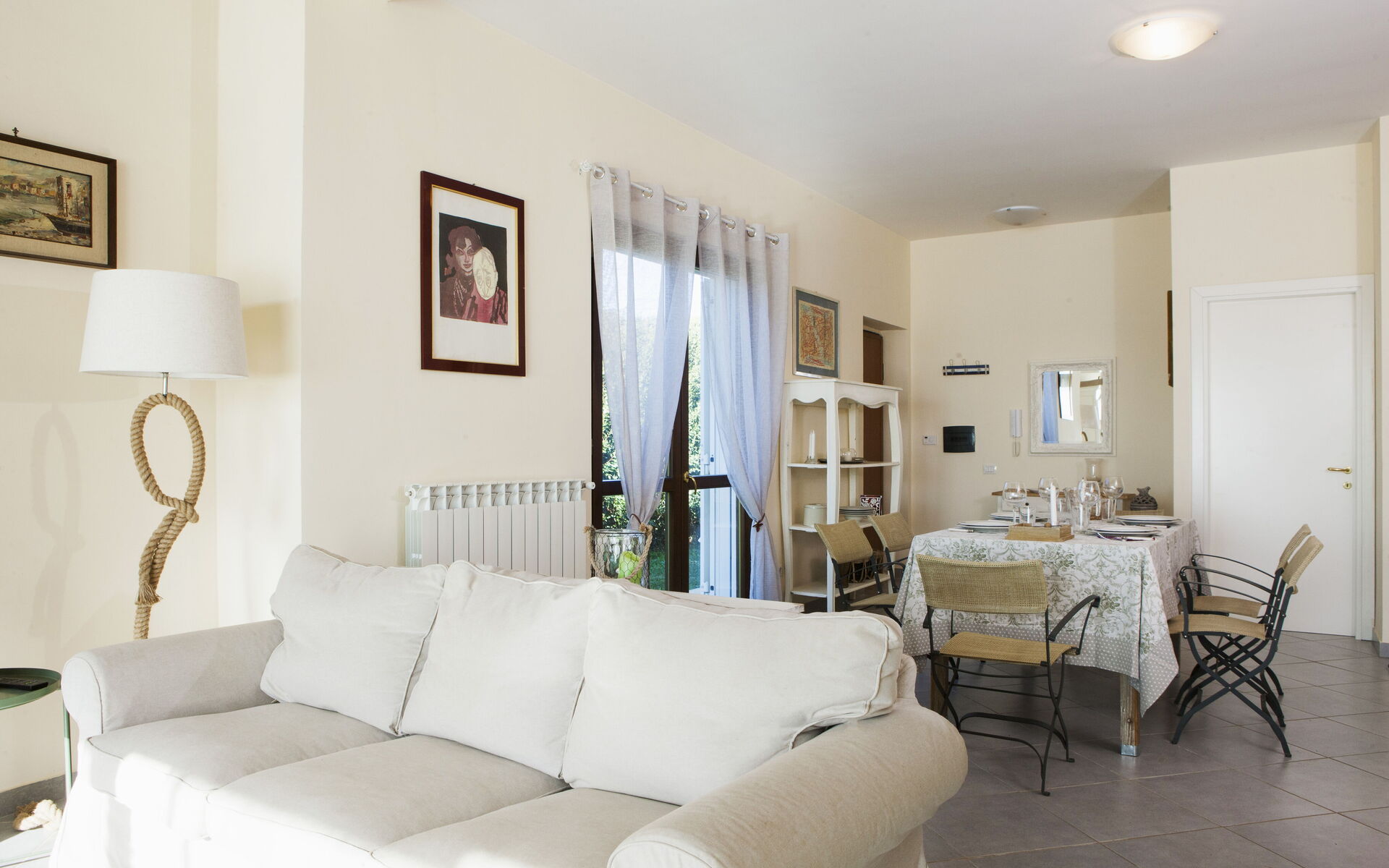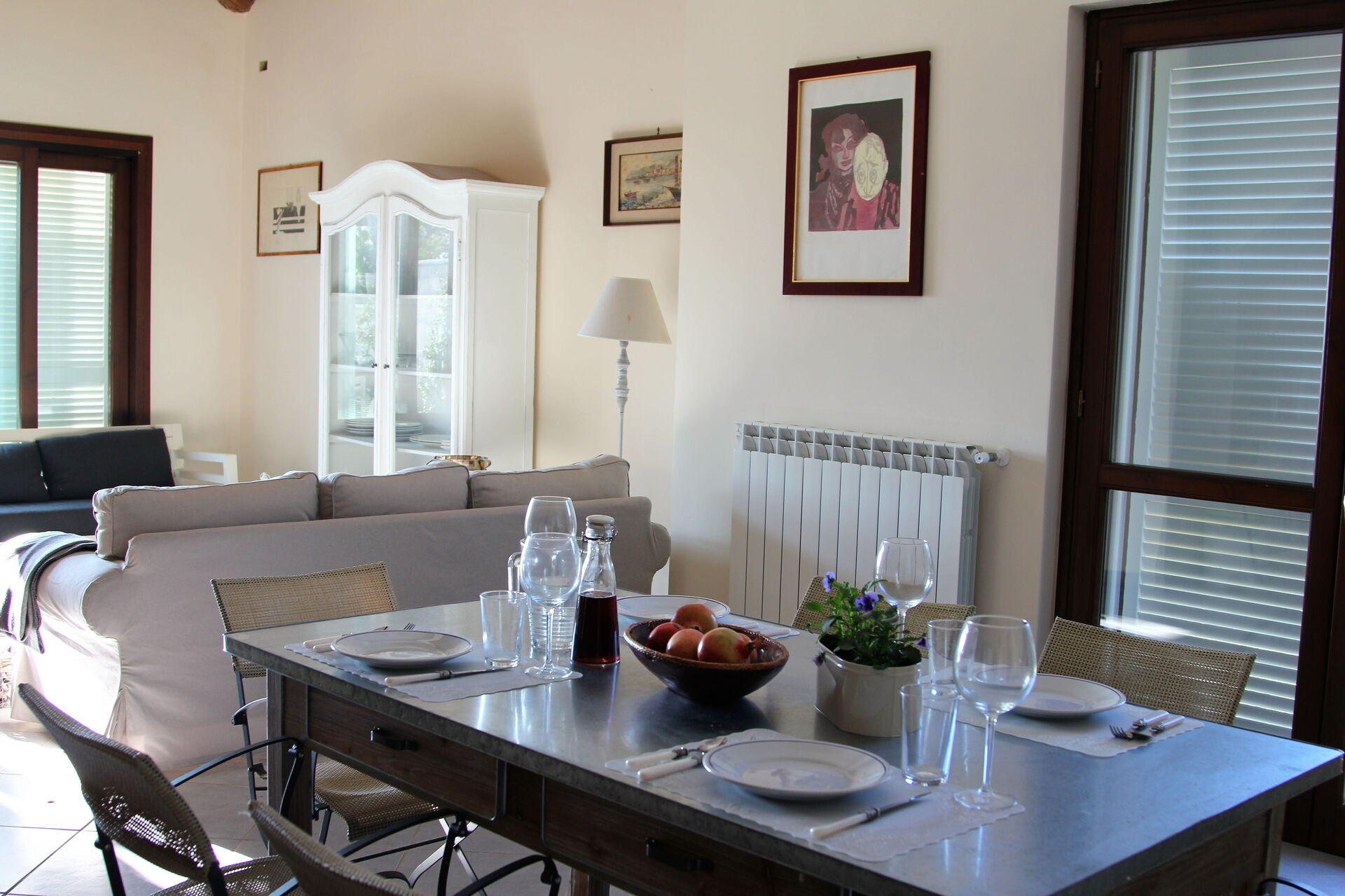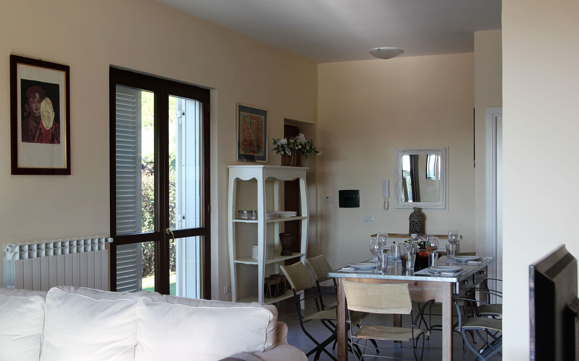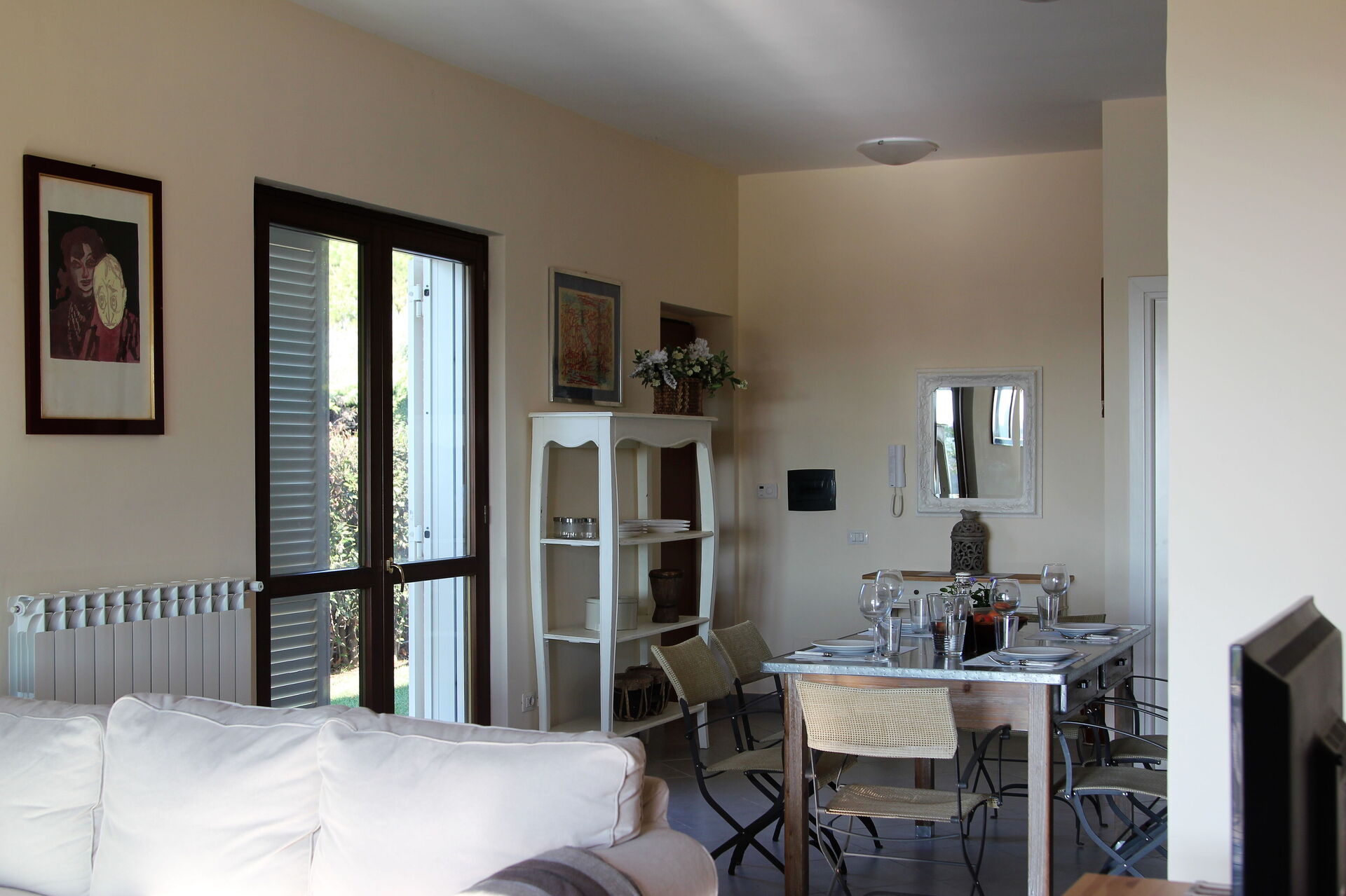 Kitchen + living room: well equipped kitchen, dining table, dishwasher, fridge, freezer, stove top, oven, toaster, american coffee machine, sofa, fireplace, WIFI internet, mosquito net, television, exit to the patio.