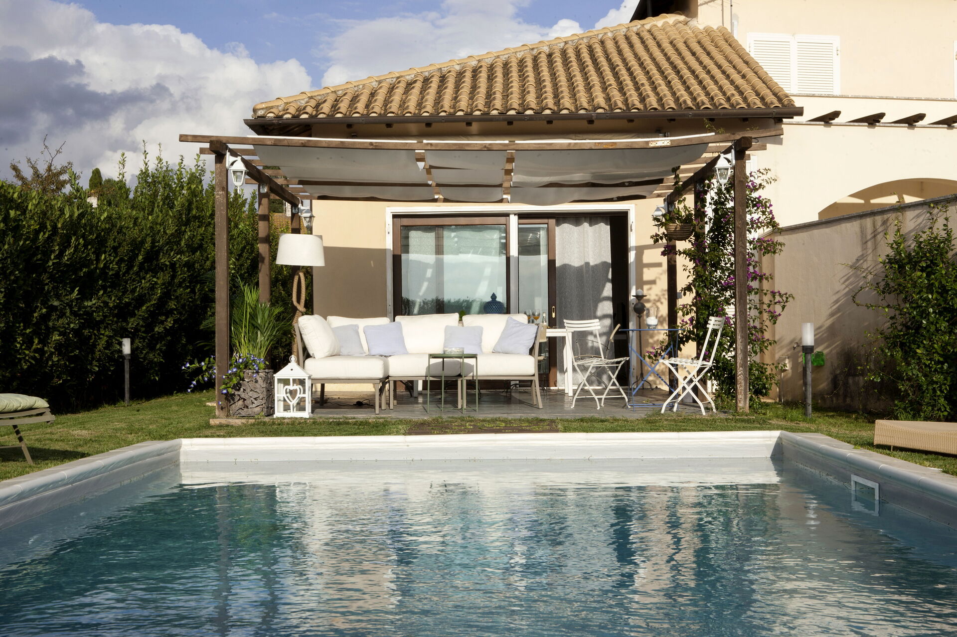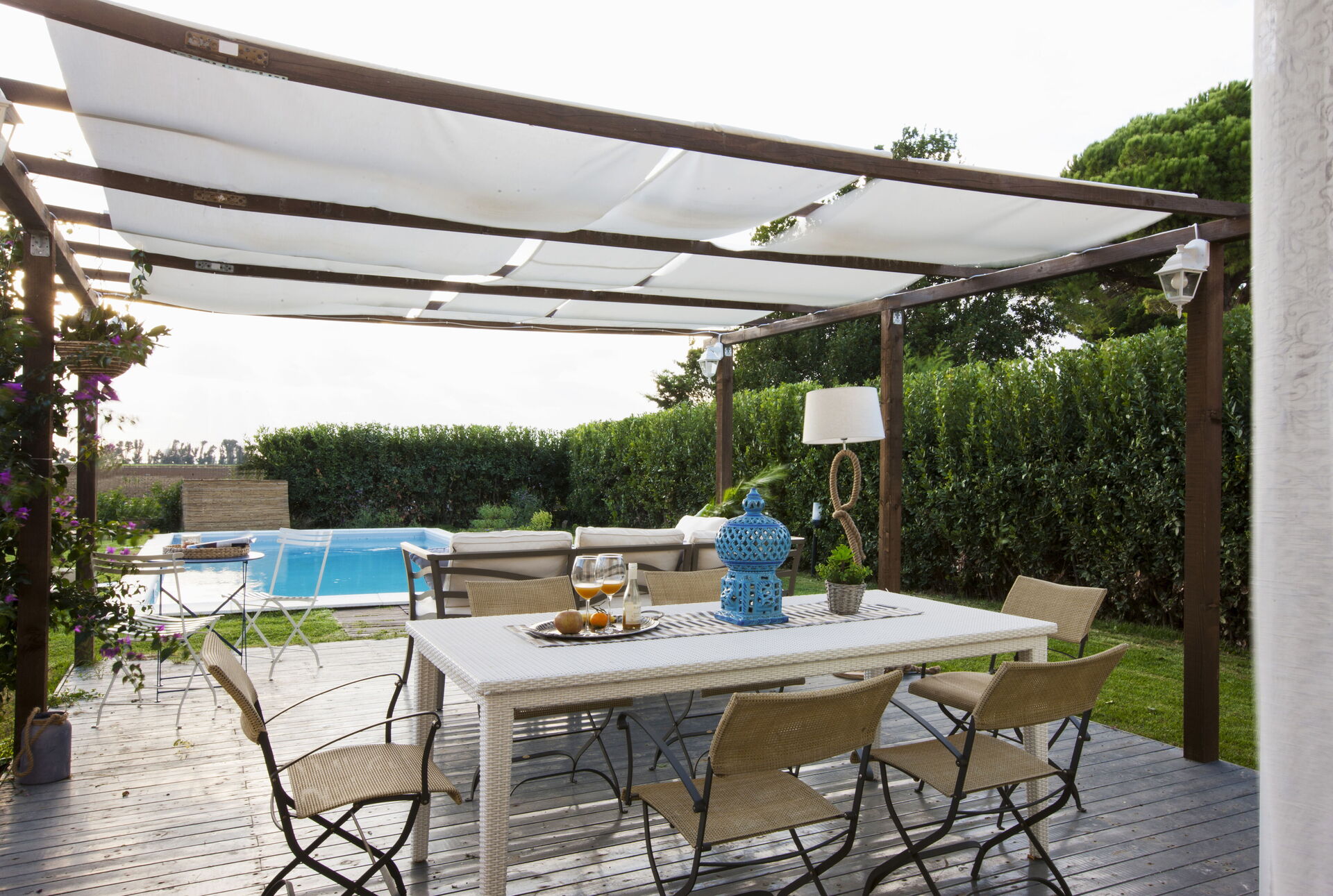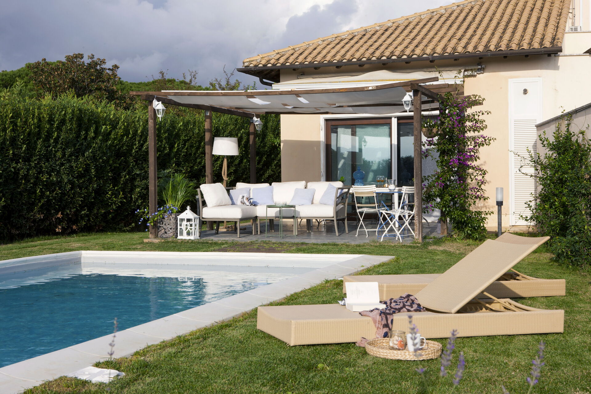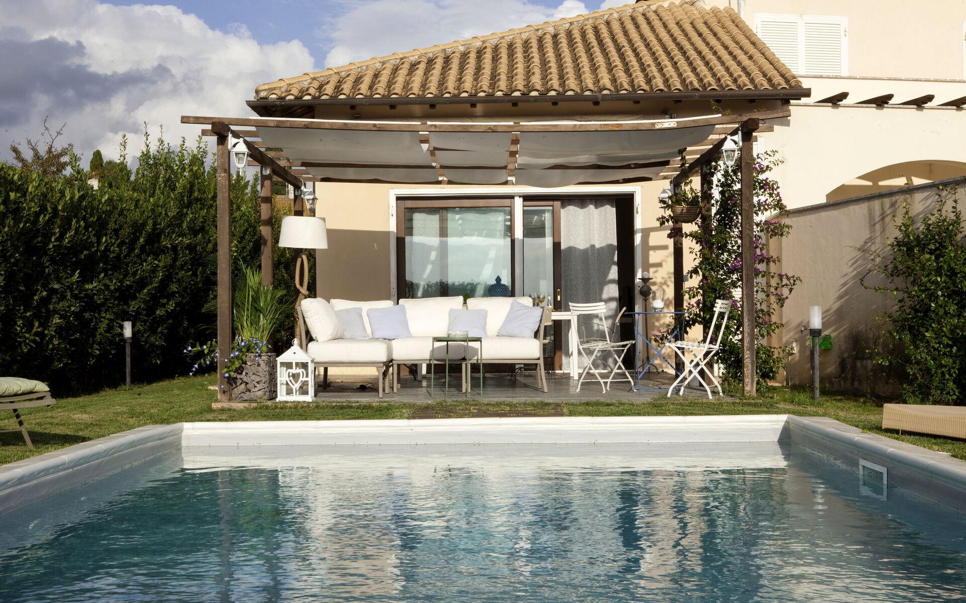 Garden: swimming pool (length: 9m, width: 4m, depth: 1.5m), al fresco dining, dining table, gazebo, garden furniture, terrace furniture, sunbed, enclosed property.