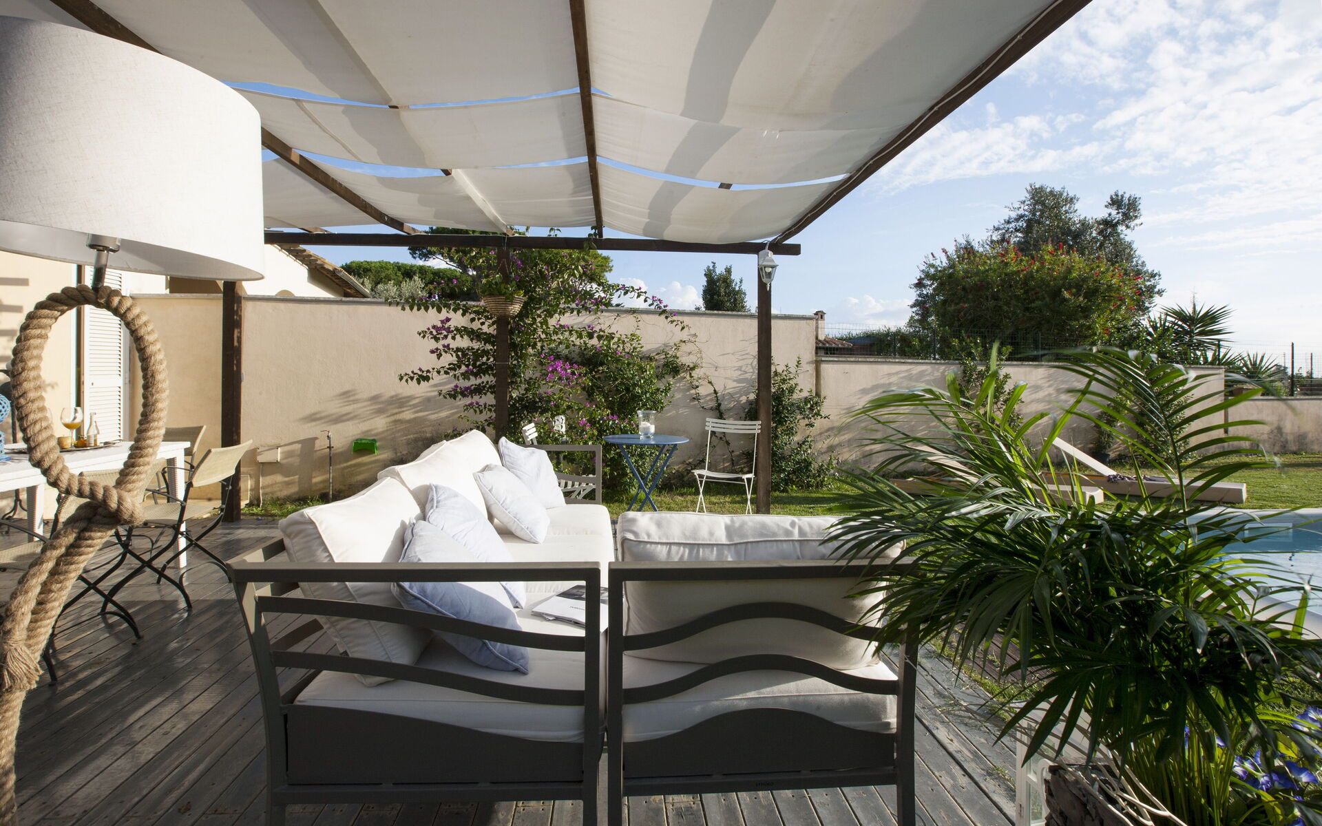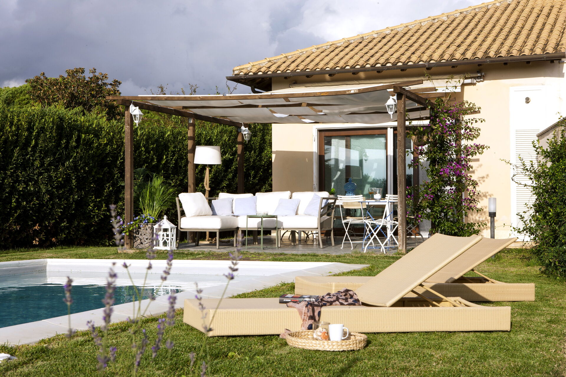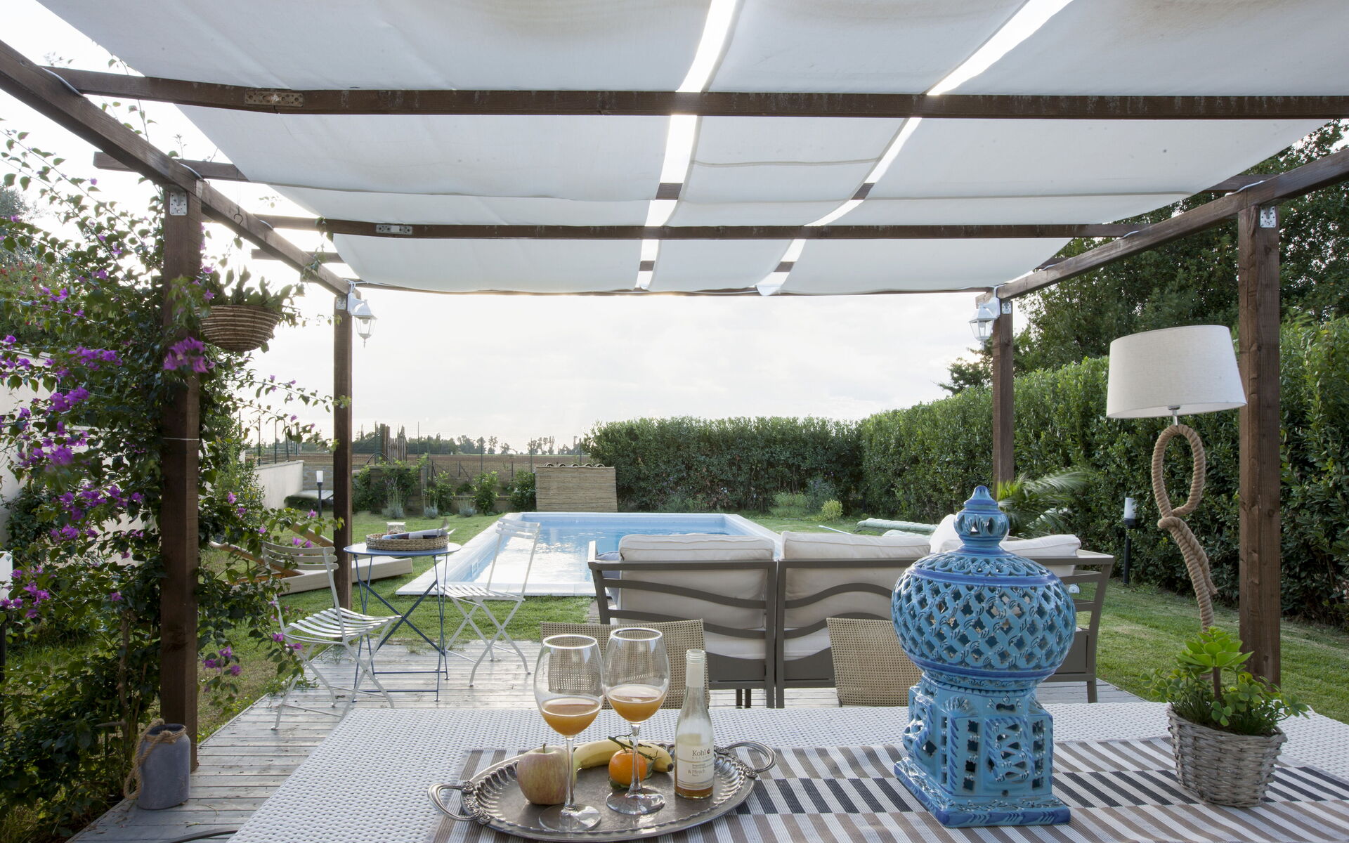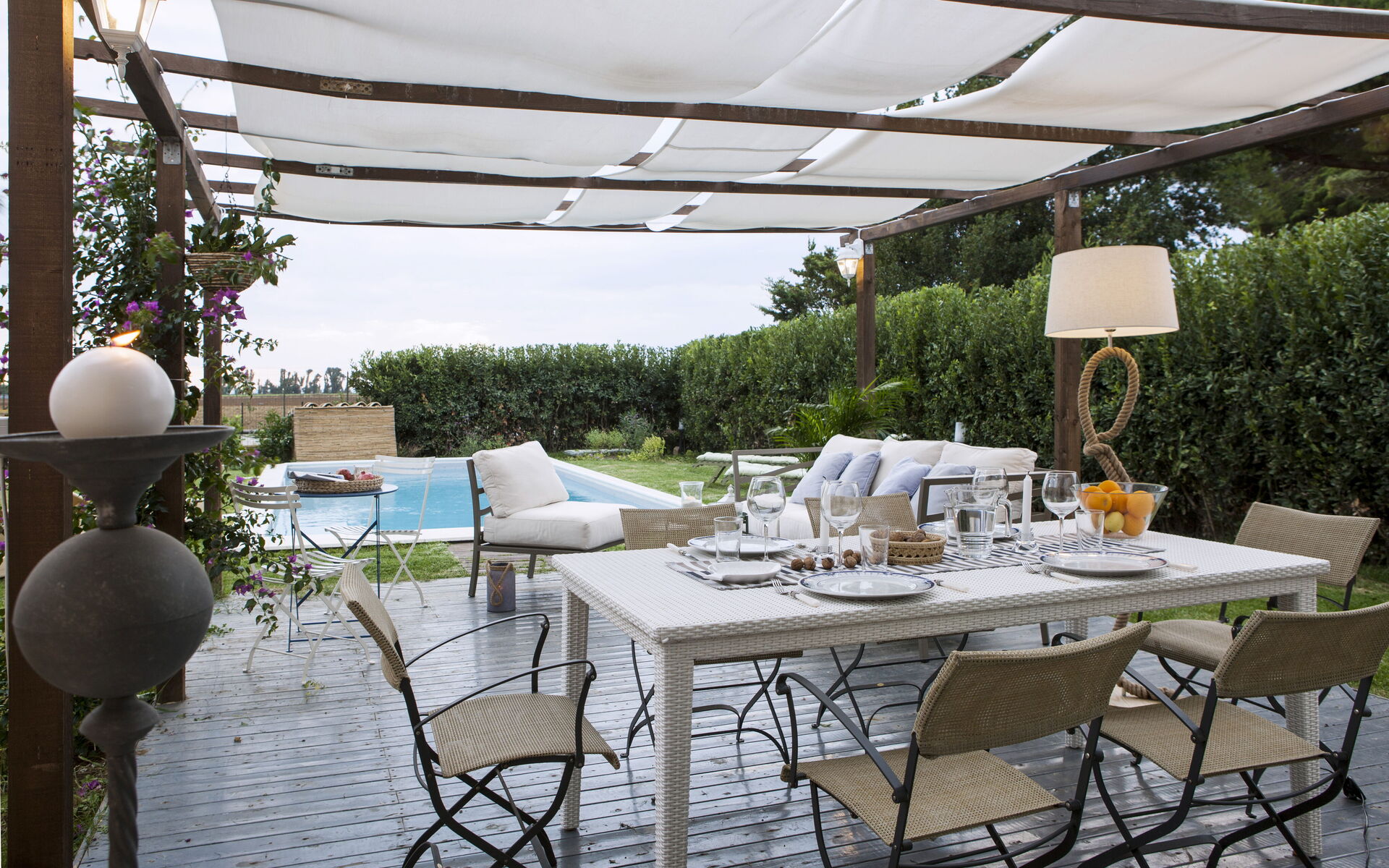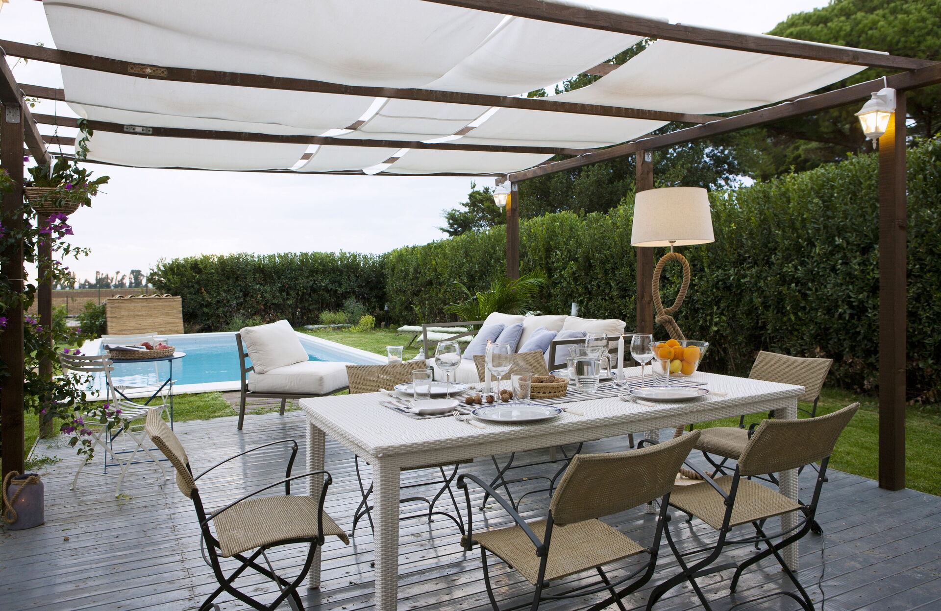 Garden: swimming pool (length: 9m, width: 4m, depth: 1.5m), al fresco dining, dining table, gazebo, garden furniture, terrace furniture, sunbed, enclosed property.