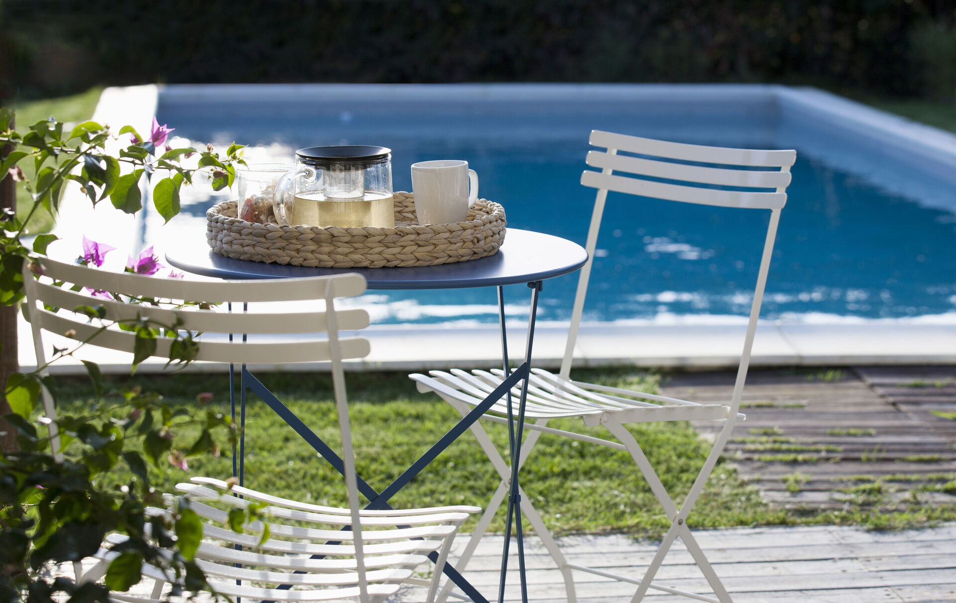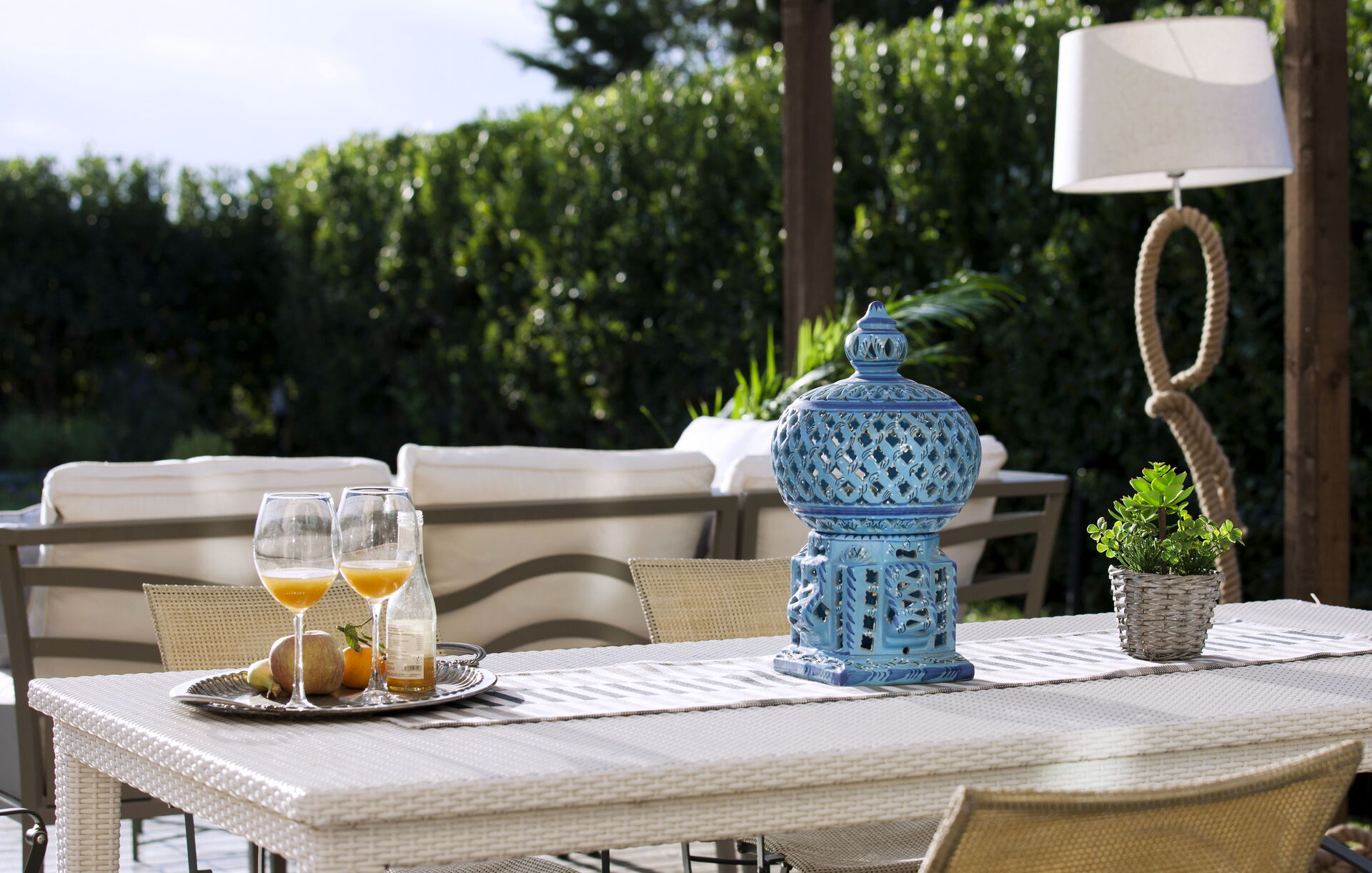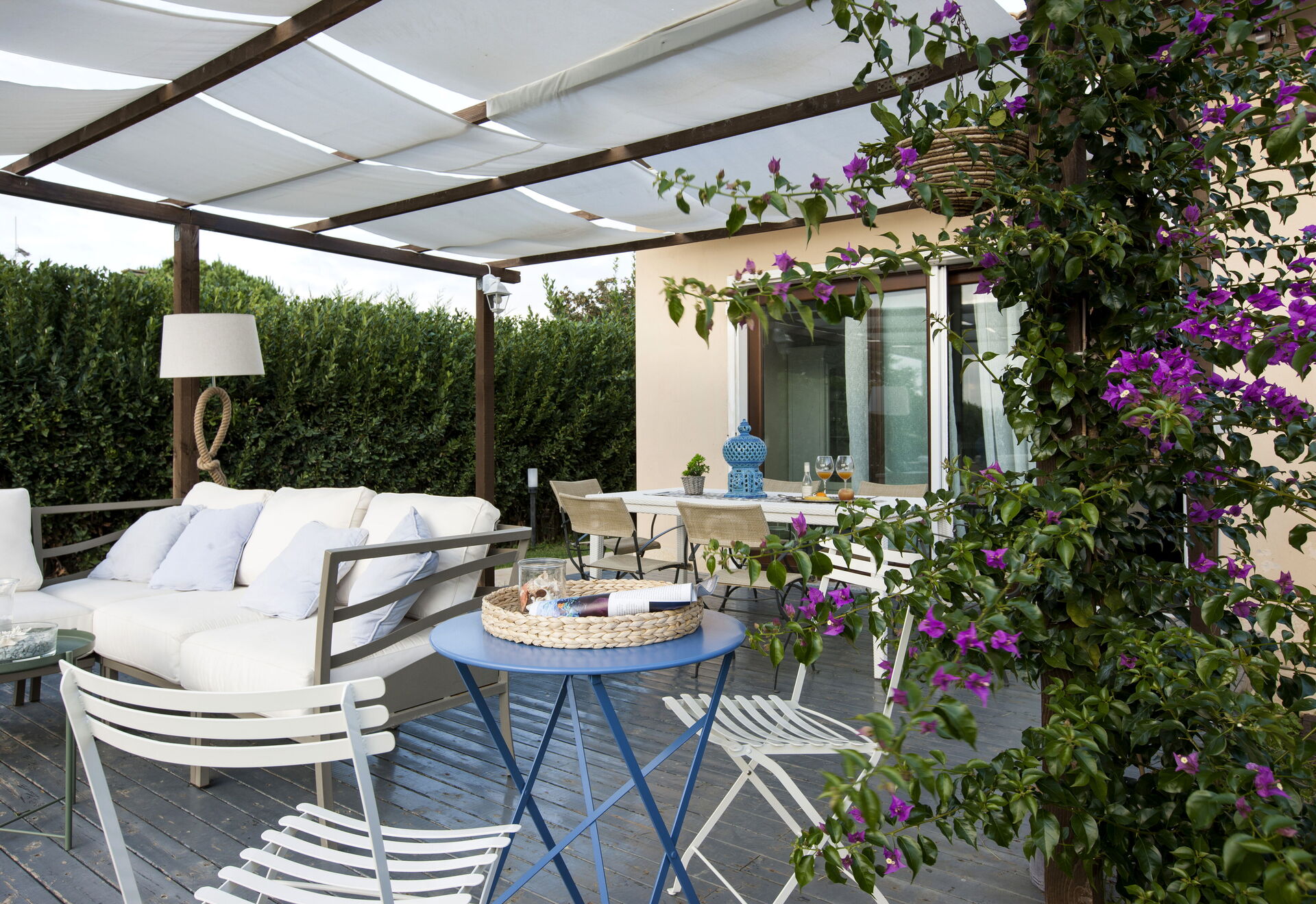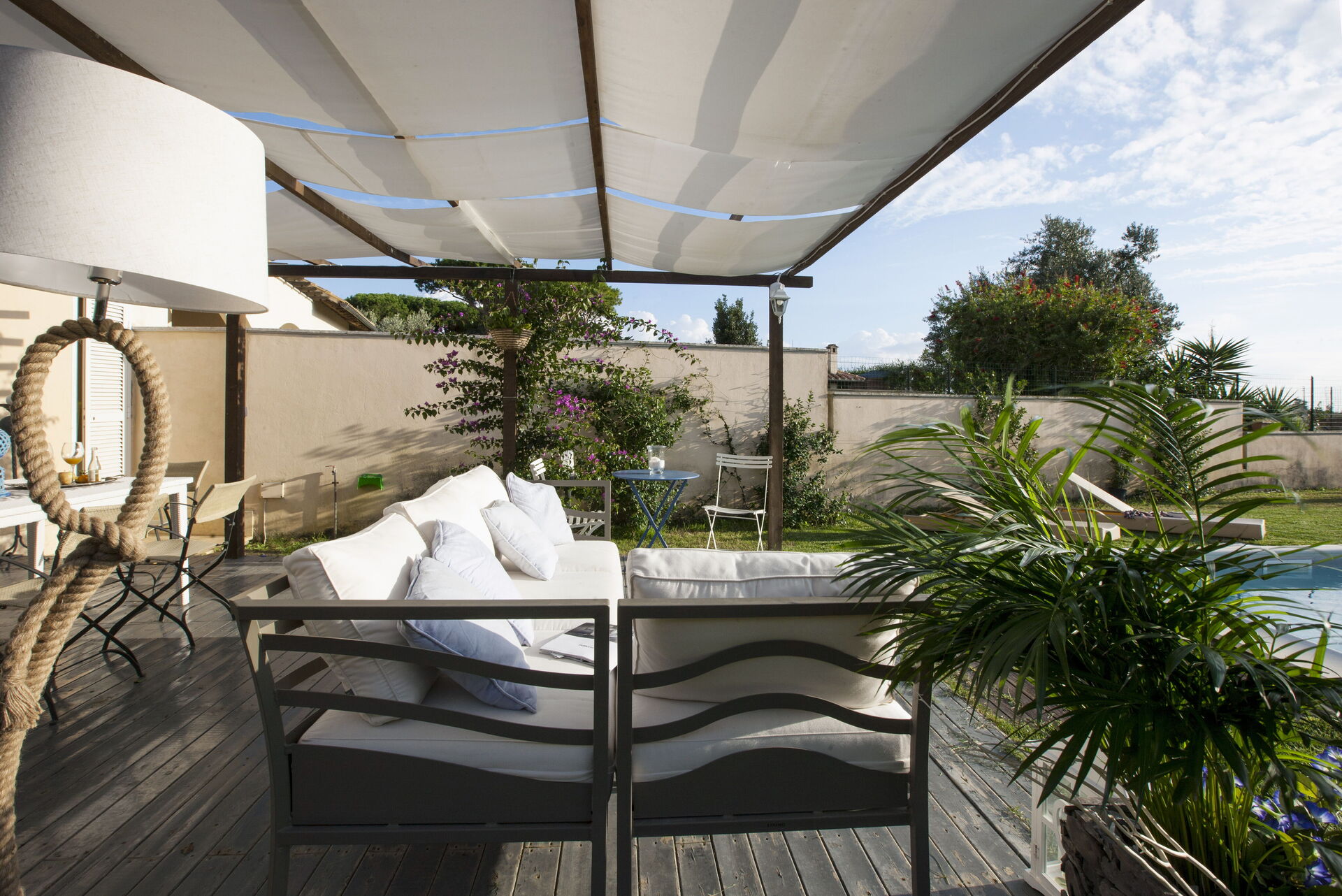 Garden: swimming pool (length: 9m, width: 4m, depth: 1.5m), al fresco dining, dining table, gazebo, garden furniture, terrace furniture, sunbed, enclosed property.
