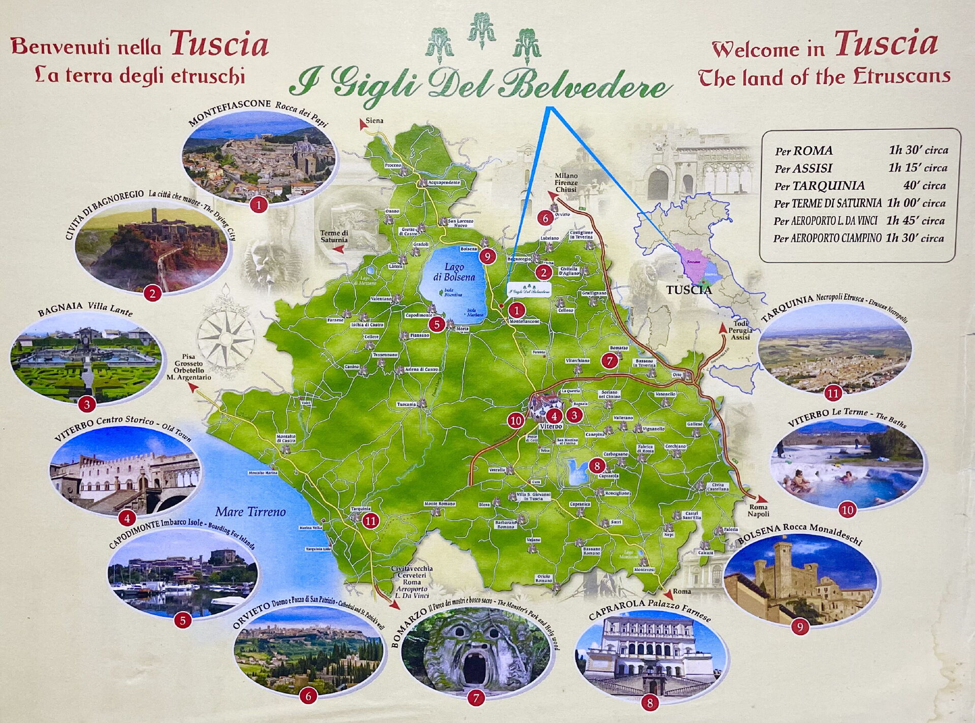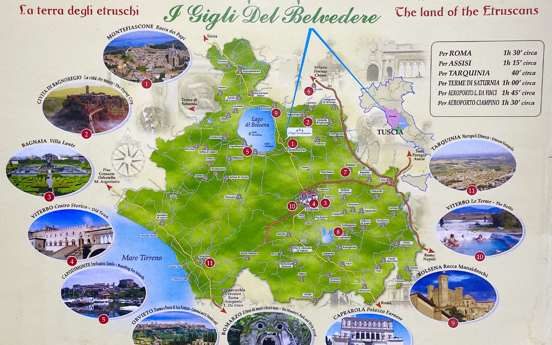 Other places to visit: Civita di Bagnoregio Km 13, Lake Bolsena Km 5, Orvieto Km 25, Tarquinia Km 40.