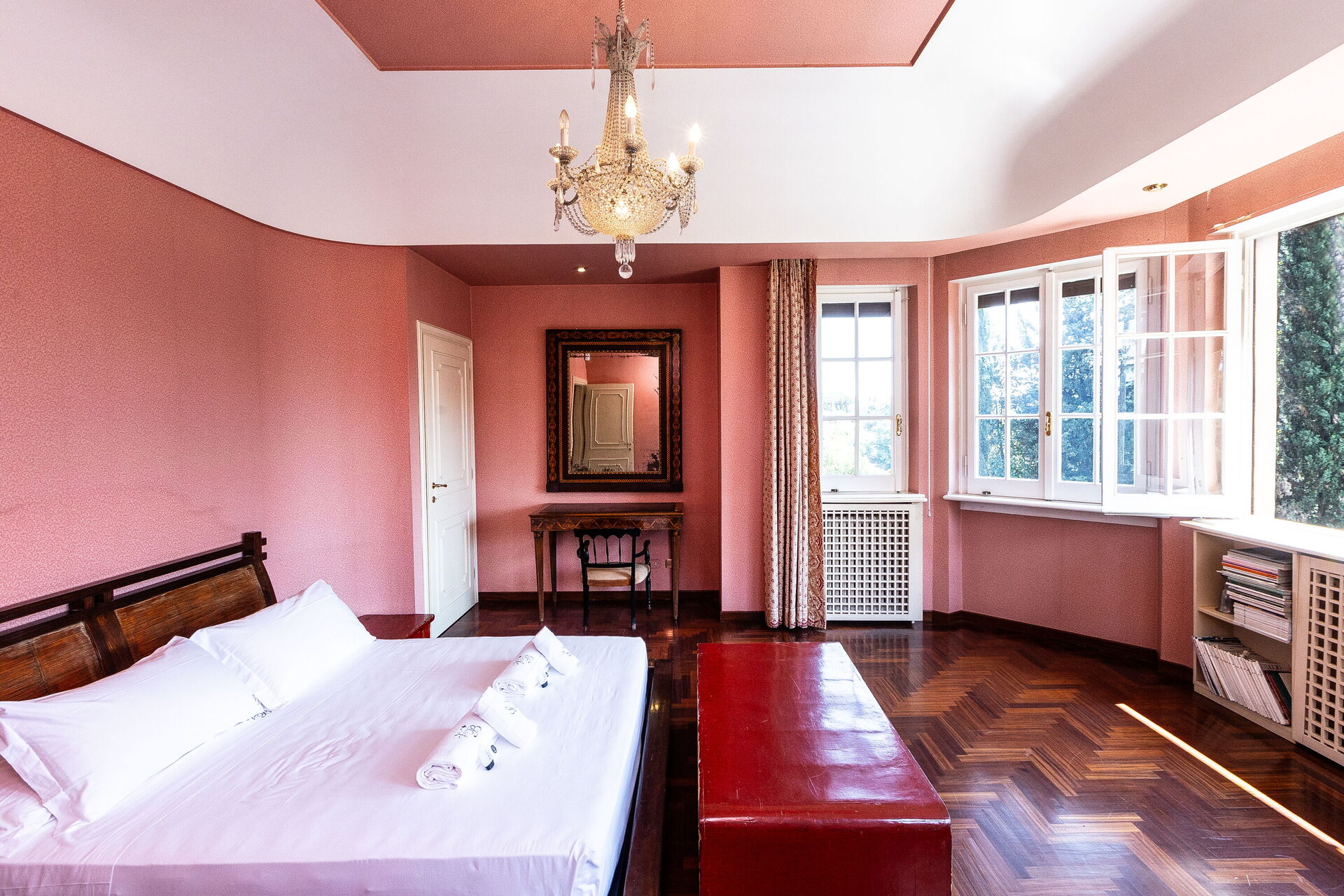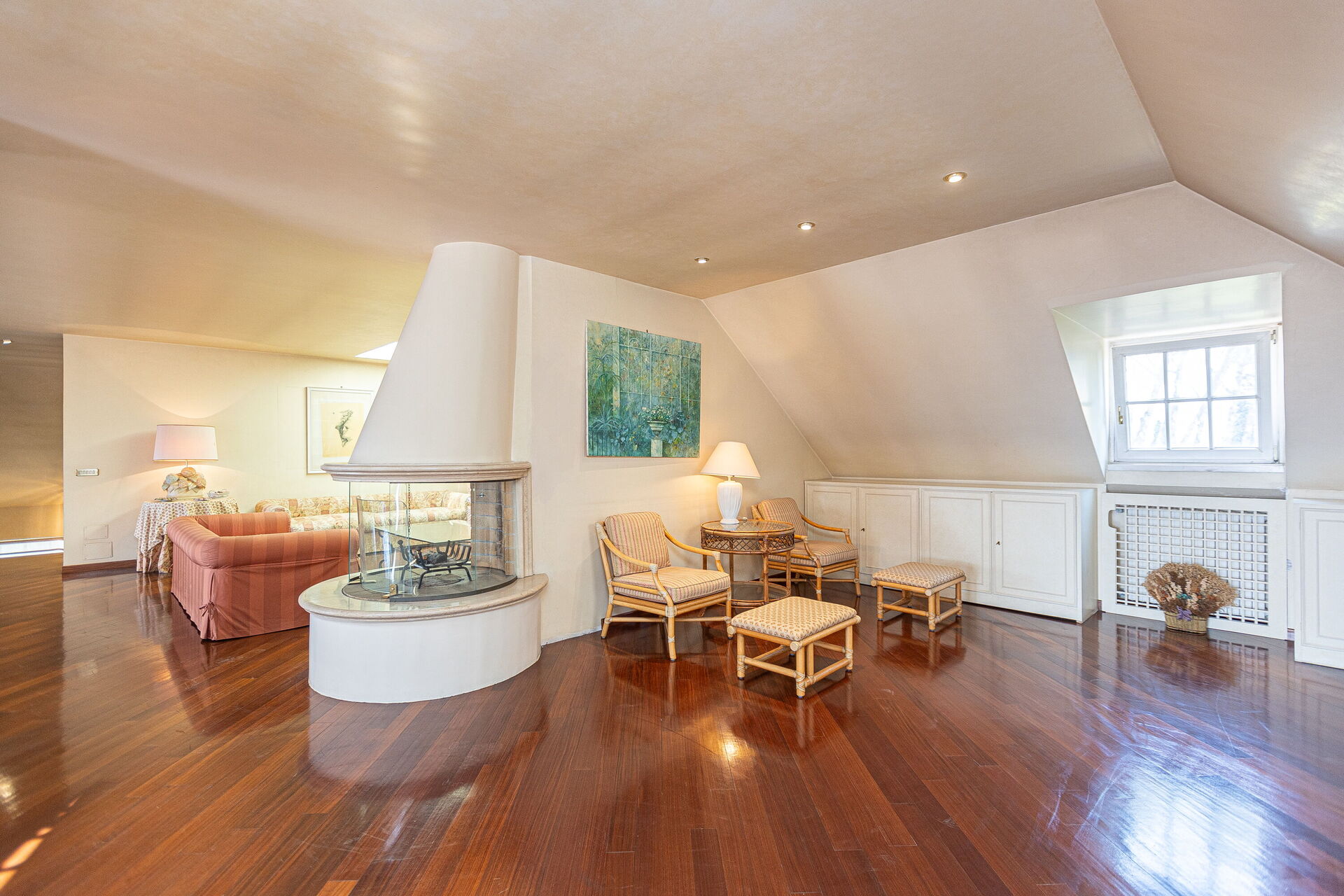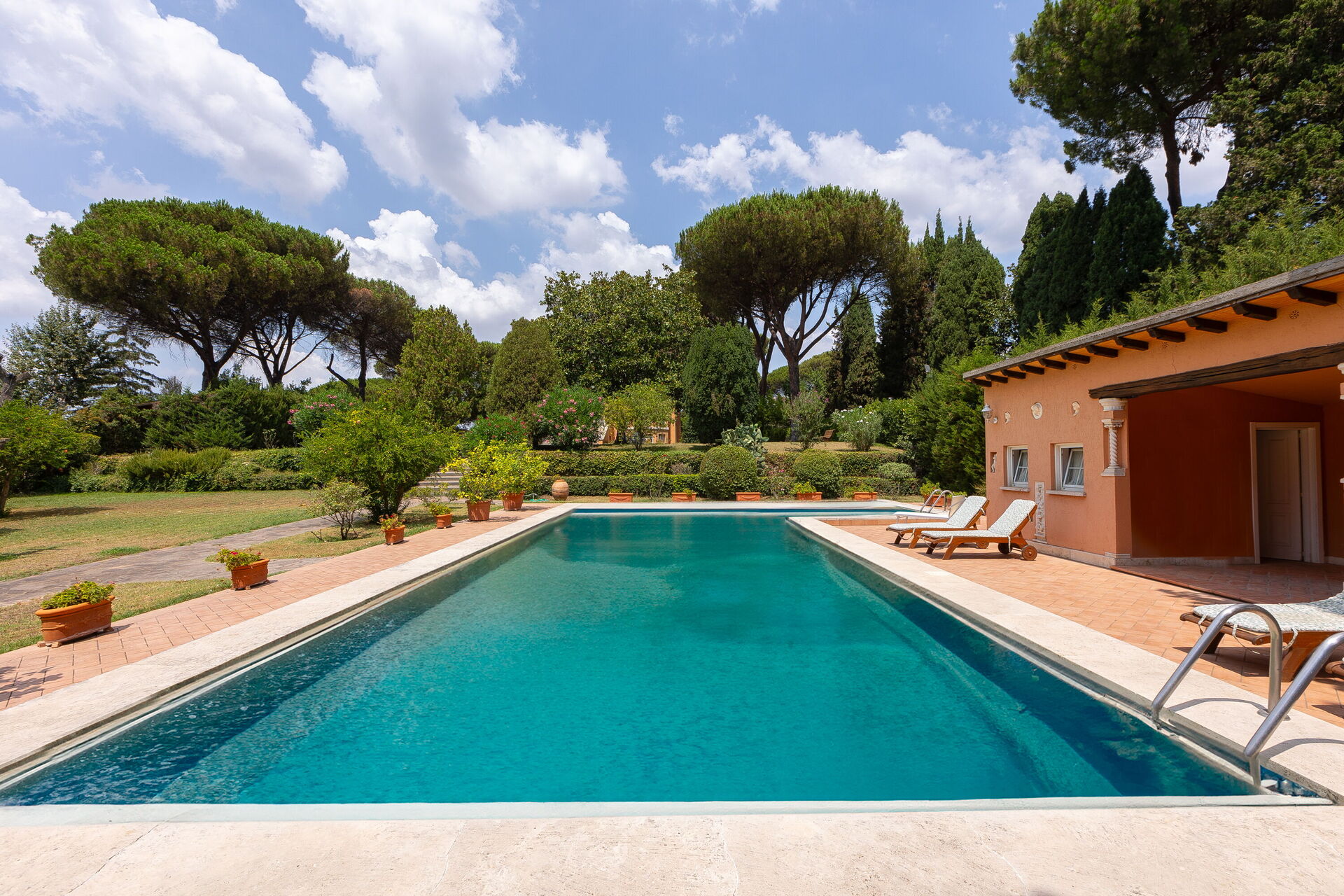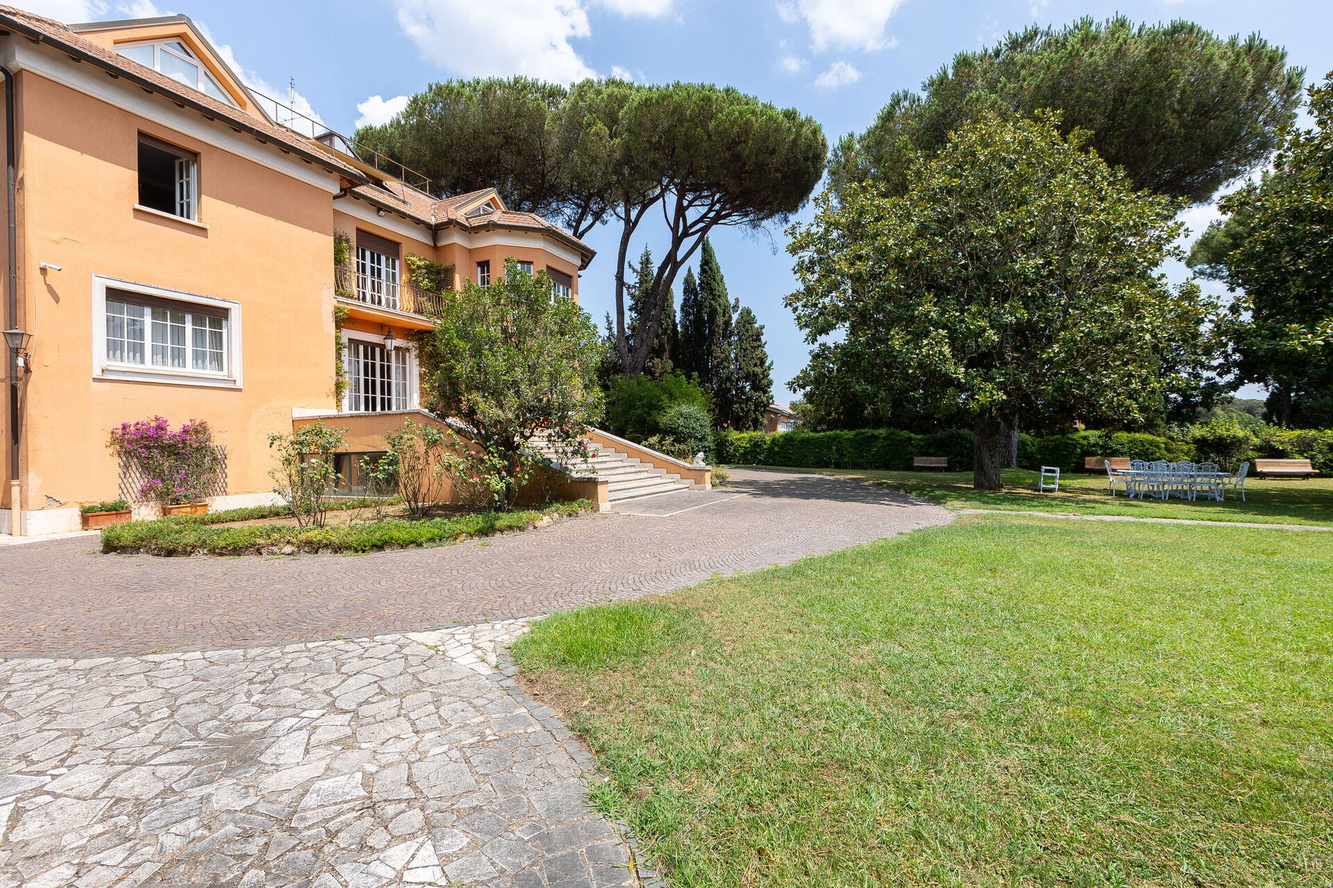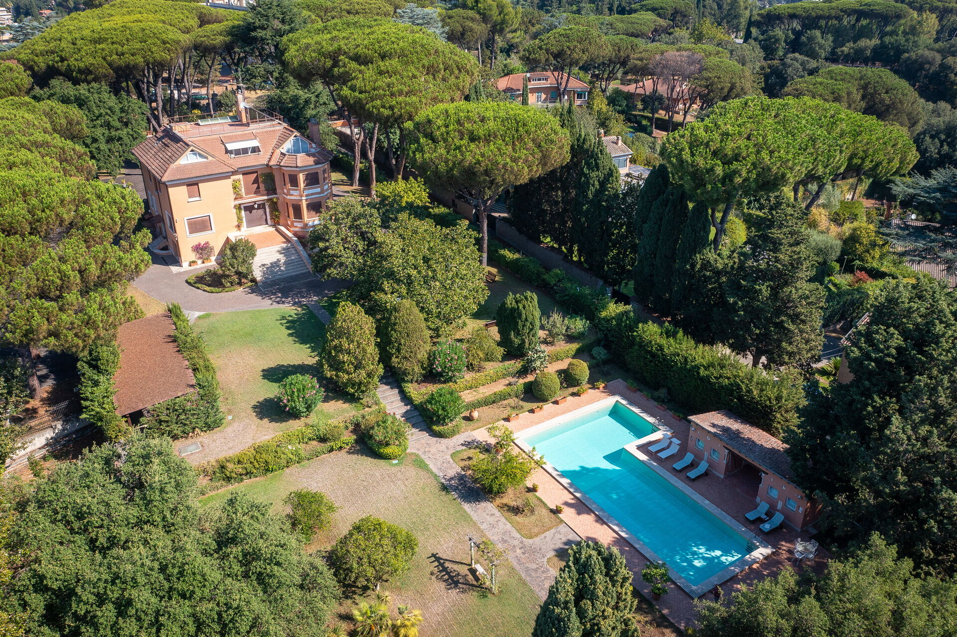 Wonderful villa located in Via della Camilluccia, a short distance from the historic center of Rome. Located in an exclusive residential area, surrounded by high-end properties and several embassy offices. The villa was built in the 50s by Aldo Gucci, creator of the company of the same name, as his Roman residence. The entire property is spread over a large park of about 7,000 square meters, with centuries-old pine trees, magnolia trees and a well-kept garden furnished with outdoor sofas and a dining table. The property also includes a large swimming pool with sun loungers and changing room. The Villa was built in English style and furnished with a mix of Tuscan style, making it certainly unique in its kind, with its bow-windows and several fireplaces in the large interior spaces. It is spread over four floors connected by stairs and an internal elevator. On the ground floor there is a large fully equipped kitchen, a laundry area and a beautiful billiard room with fireplace. On the first floor, entering the majestic entrance with a wonderful staircase that connects the upper floors, there is the highly prestigious reception area, consisting of a triple living room, dining room, a study, a music room with a grand piano, all very bright rooms, thanks to the large windows with a view and direct access to the garden. From the entrance staircase you access the second floor, where there is the sleeping area consisting of 4 double bedrooms with 4 en suite bathrooms, a double bedroom with en suite bathroom. All the bedrooms are furnished in a high-level classic style. The third floor consists of a large area with sofas and smart TV, as well as a double bedroom with en suite bathroom From the top floor you can enjoy a breathtaking view by accessing the terrace, where you can admire the altar of the homeland of Piazza Venezia, a famous monument in the historic center of Rome. The villa offers every type of comfort, air conditioning, wi fi, alarm system, laundry area and much more. The location is certainly unique in its kind and the very high historical importance, the exclusivity of this villa is perfect for families or groups of friends who want to spend a short or medium-term stay a stone's throw from the historic center of Rome without giving up the relaxation and elegance that this place can grant.