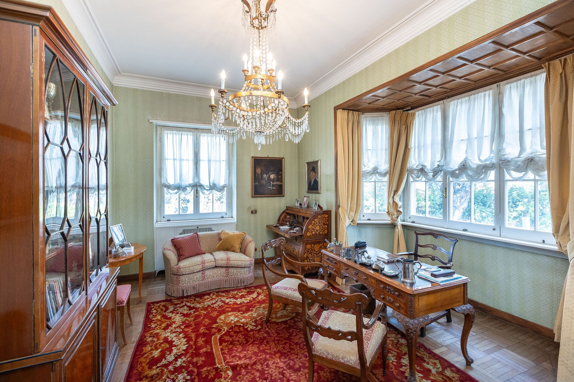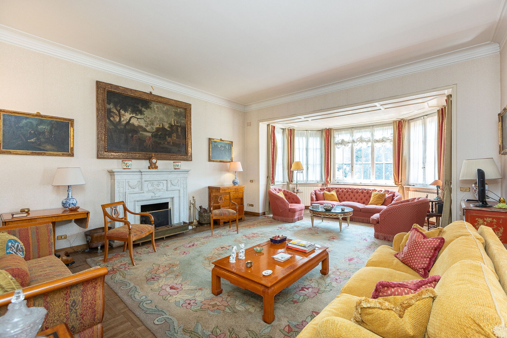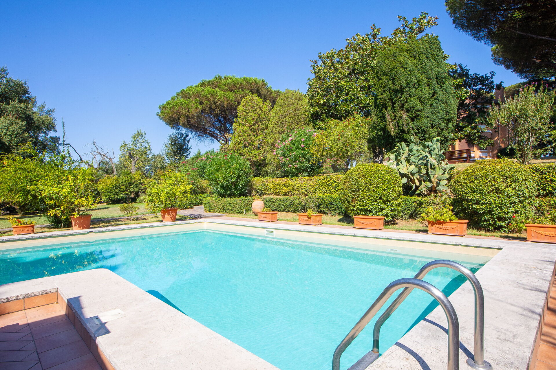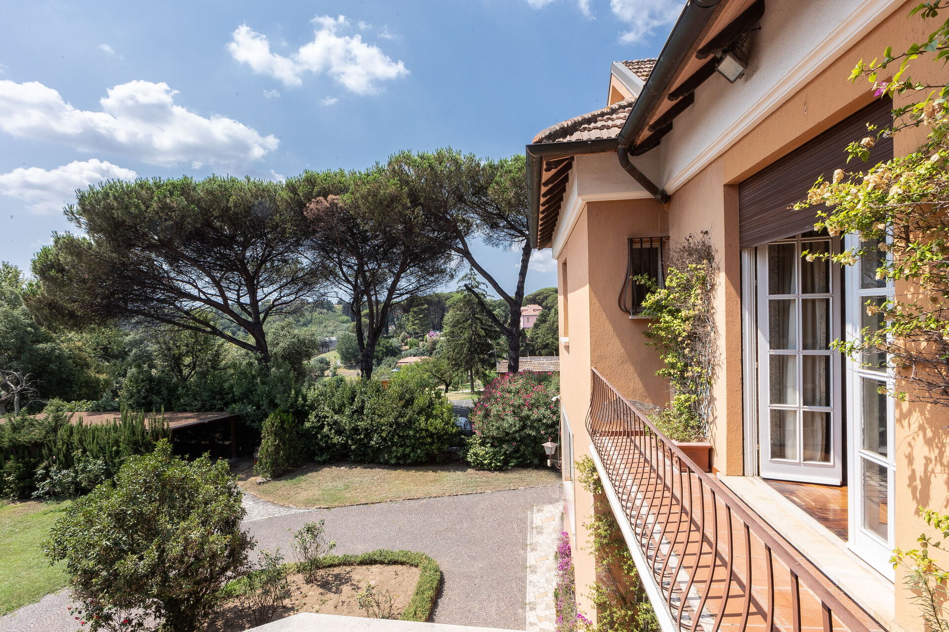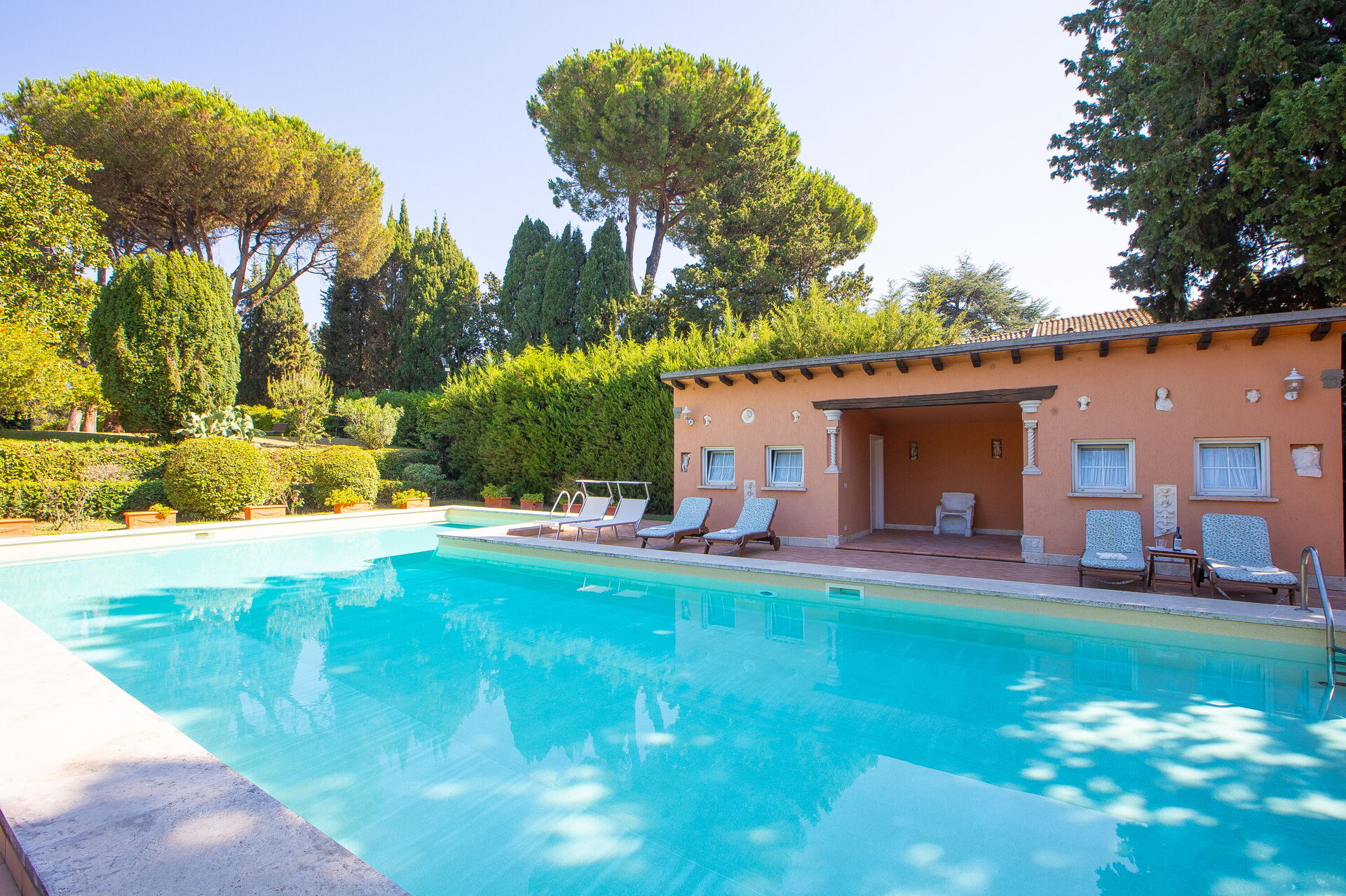 Wonderful villa located in Via della Camilluccia, a short distance from the historic center of Rome. Located in an exclusive residential area, surrounded by high-end properties and several embassy offices. The villa was built in the 50s by Aldo Gucci, creator of the company of the same name, as his Roman residence. The entire property is spread over a large park of about 7,000 square meters, with centuries-old pine trees, magnolia trees and a well-kept garden furnished with outdoor sofas and a dining table. The property also includes a large swimming pool with sun loungers and changing room. The Villa was built in English style and furnished with a mix of Tuscan style, making it certainly unique in its kind, with its bow-windows and several fireplaces in the large interior spaces. It is spread over four floors connected by stairs and an internal elevator. On the ground floor there is a large fully equipped kitchen, a laundry area and a beautiful billiard room with fireplace. On the first floor, entering the majestic entrance with a wonderful staircase that connects the upper floors, there is the highly prestigious reception area, consisting of a triple living room, dining room, a study, a music room with a grand piano, all very bright rooms, thanks to the large windows with a view and direct access to the garden. From the entrance staircase you access the second floor, where there is the sleeping area consisting of 4 double bedrooms with 4 en suite bathrooms, a double bedroom with en suite bathroom. All the bedrooms are furnished in a high-level classic style. The third floor consists of a large area with sofas and smart TV, as well as a double bedroom with en suite bathroom From the top floor you can enjoy a breathtaking view by accessing the terrace, where you can admire the altar of the homeland of Piazza Venezia, a famous monument in the historic center of Rome. The villa offers every type of comfort, air conditioning, wi fi, alarm system, laundry area and much more. The location is certainly unique in its kind and the very high historical importance, the exclusivity of this villa is perfect for families or groups of friends who want to spend a short or medium-term stay a stone's throw from the historic center of Rome without giving up the relaxation and elegance that this place can grant.
