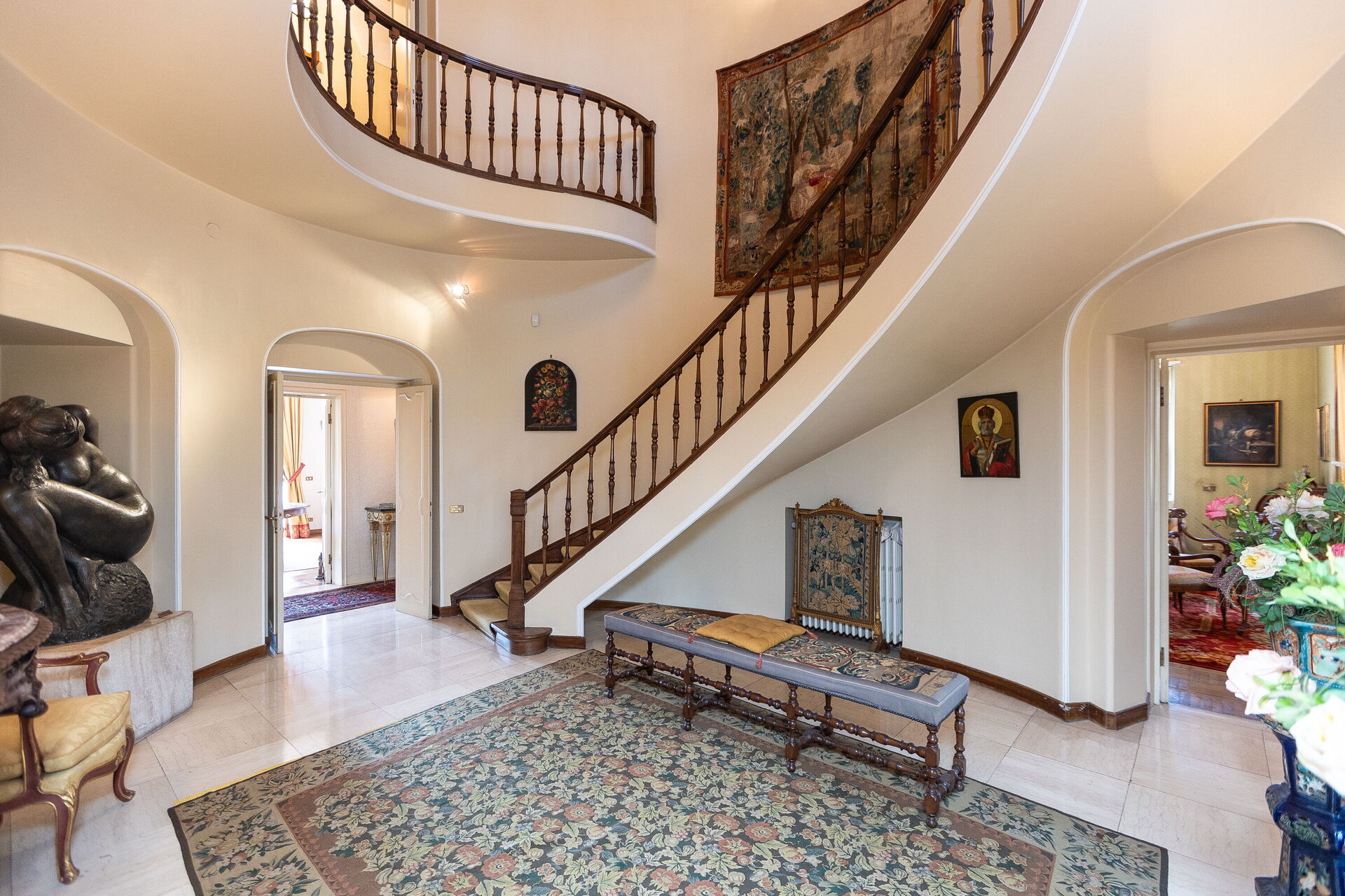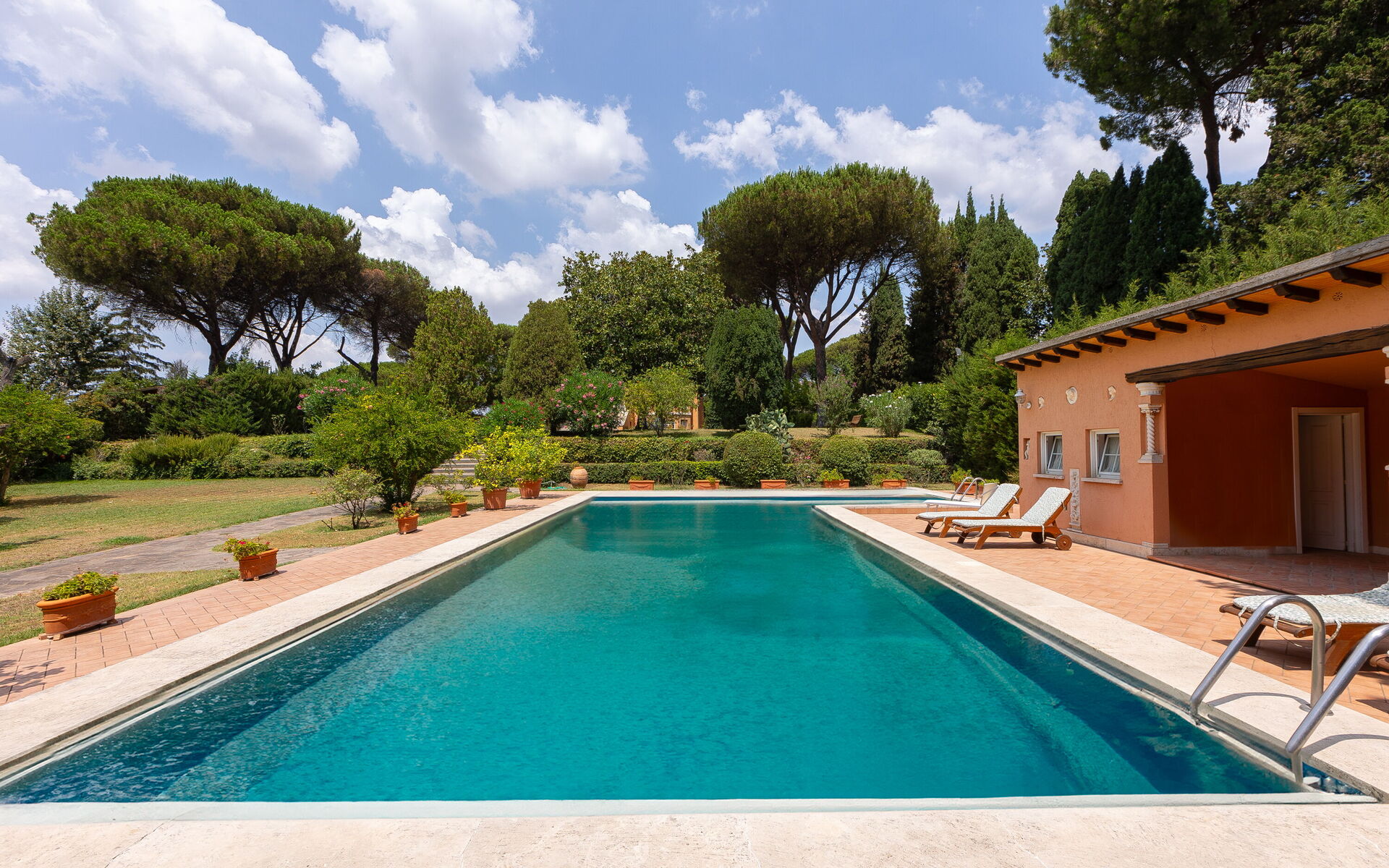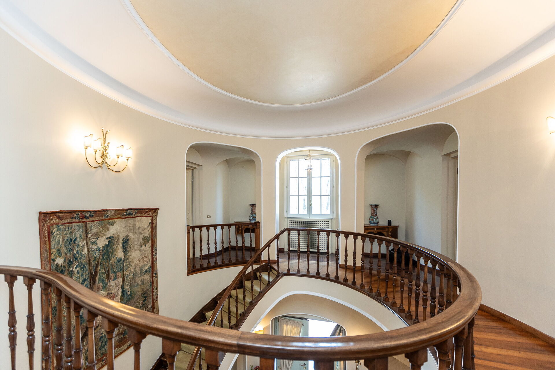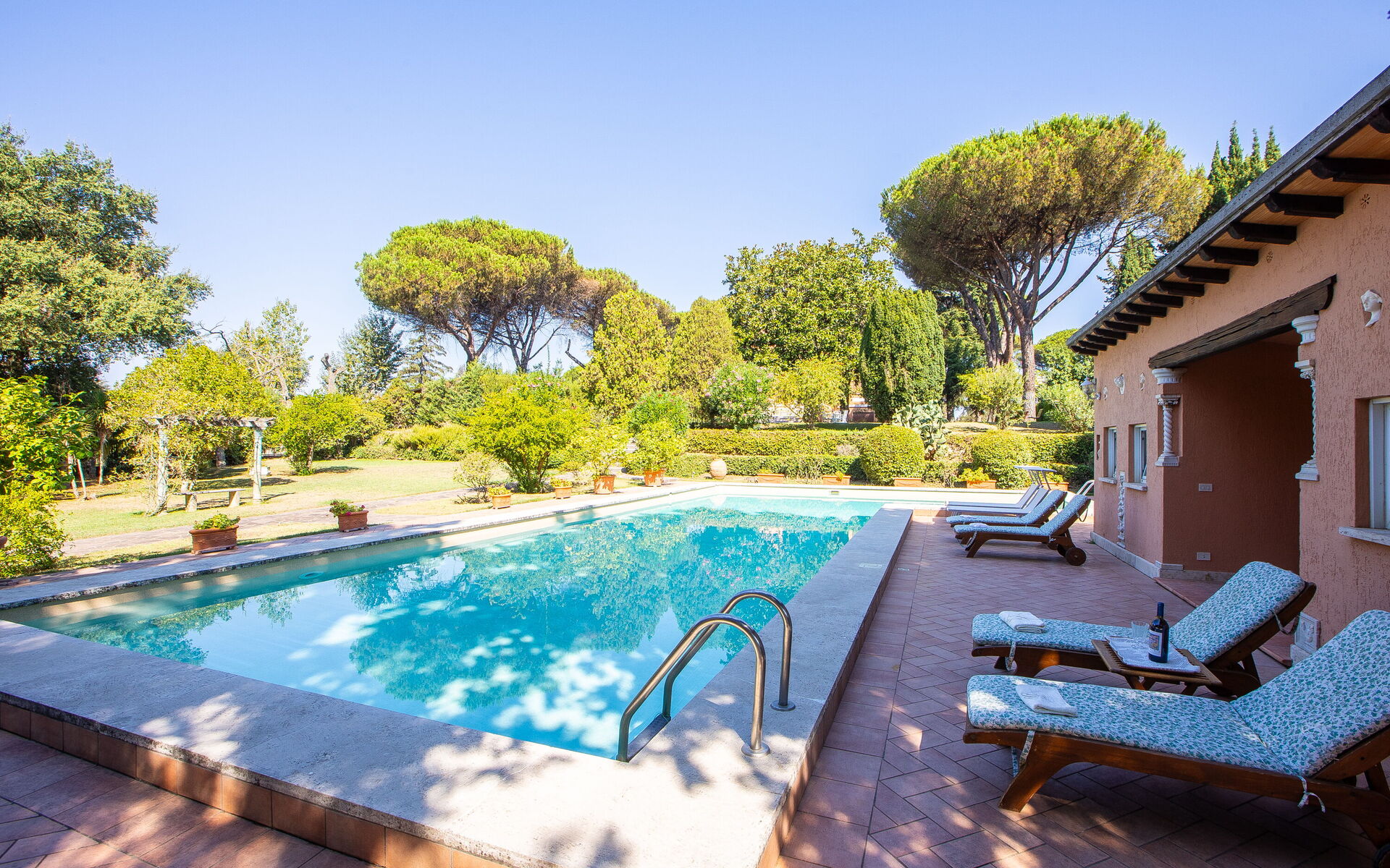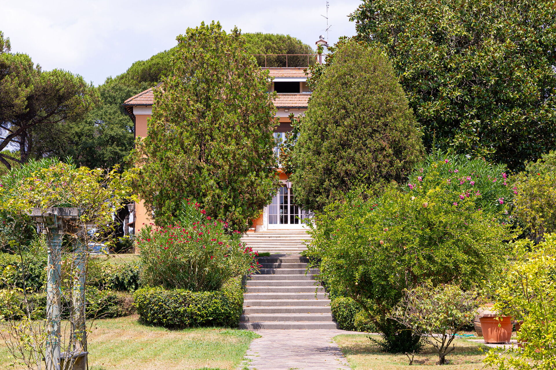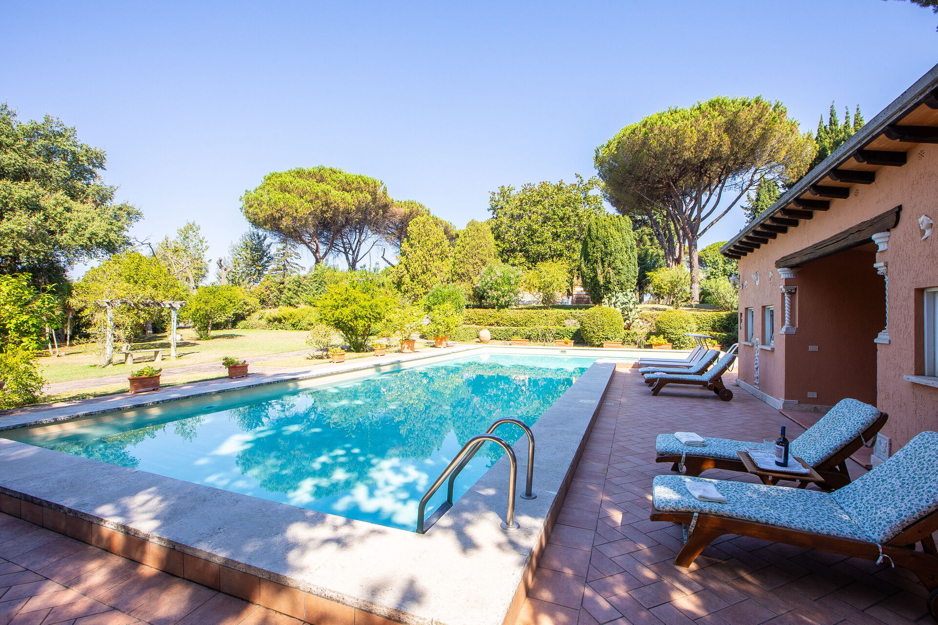 Wonderful villa located in Via della Camilluccia, a short distance from the historic center of Rome. Located in an exclusive residential area, surrounded by high-end properties and several embassy offices. The villa was built in the 50s by Aldo Gucci, creator of the company of the same name, as his Roman residence. The entire property is spread over a large park of about 7,000 square meters, with centuries-old pine trees, magnolia trees and a well-kept garden furnished with outdoor sofas and a dining table. The property also includes a large swimming pool with sun loungers and changing room. The Villa was built in English style and furnished with a mix of Tuscan style, making it certainly unique in its kind, with its bow-windows and several fireplaces in the large interior spaces. It is spread over four floors connected by stairs and an internal elevator. On the ground floor there is a large fully equipped kitchen, a laundry area and a beautiful billiard room with fireplace. On the first floor, entering the majestic entrance with a wonderful staircase that connects the upper floors, there is the highly prestigious reception area, consisting of a triple living room, dining room, a study, a music room with a grand piano, all very bright rooms, thanks to the large windows with a view and direct access to the garden. From the entrance staircase you access the second floor, where there is the sleeping area consisting of 4 double bedrooms with 4 en suite bathrooms, a double bedroom with en suite bathroom. All the bedrooms are furnished in a high-level classic style. The third floor consists of a large area with sofas and smart TV, as well as a double bedroom with en suite bathroom From the top floor you can enjoy a breathtaking view by accessing the terrace, where you can admire the altar of the homeland of Piazza Venezia, a famous monument in the historic center of Rome. The villa offers every type of comfort, air conditioning, wi fi, alarm system, laundry area and much more. The location is certainly unique in its kind and the very high historical importance, the exclusivity of this villa is perfect for families or groups of friends who want to spend a short or medium-term stay a stone's throw from the historic center of Rome without giving up the relaxation and elegance that this place can grant.