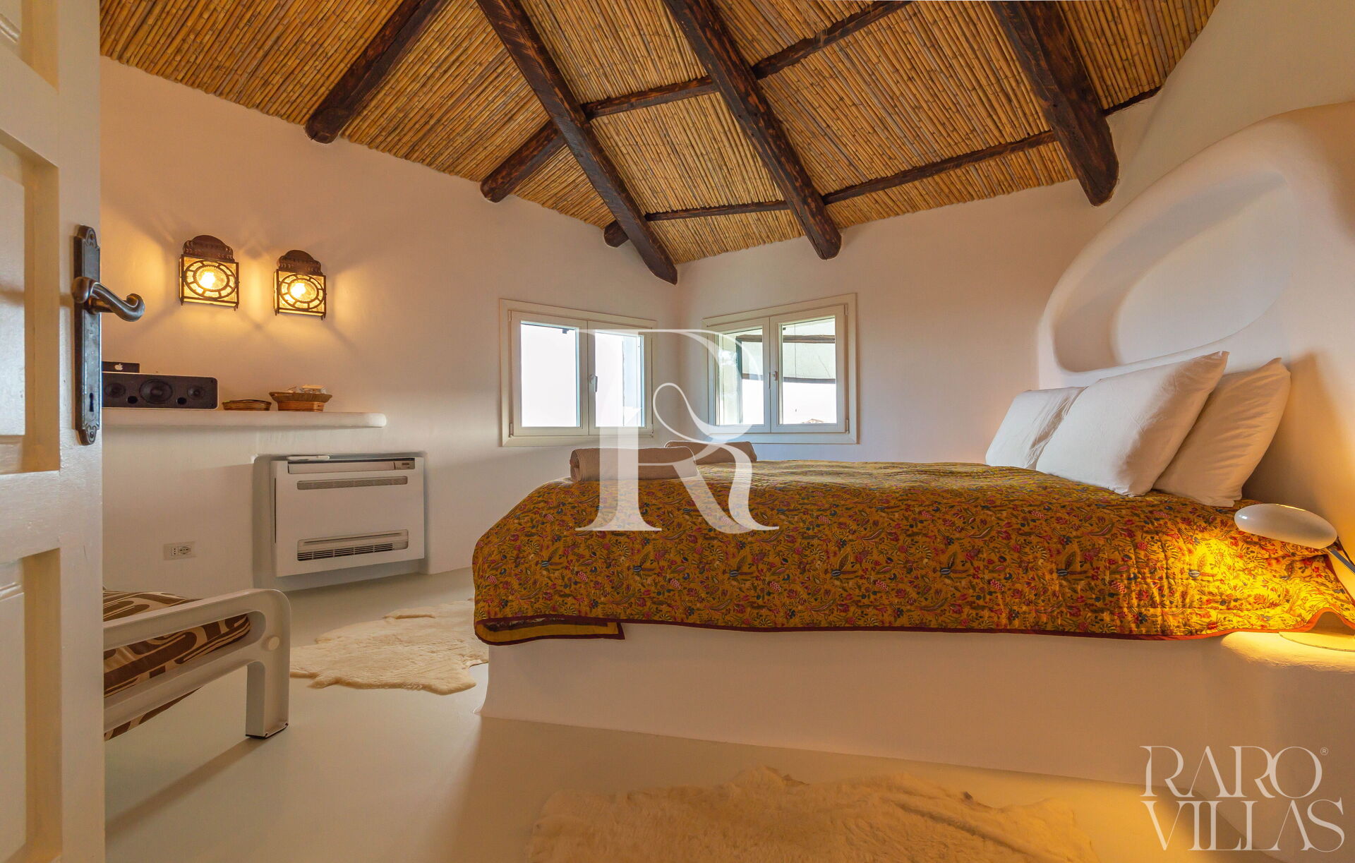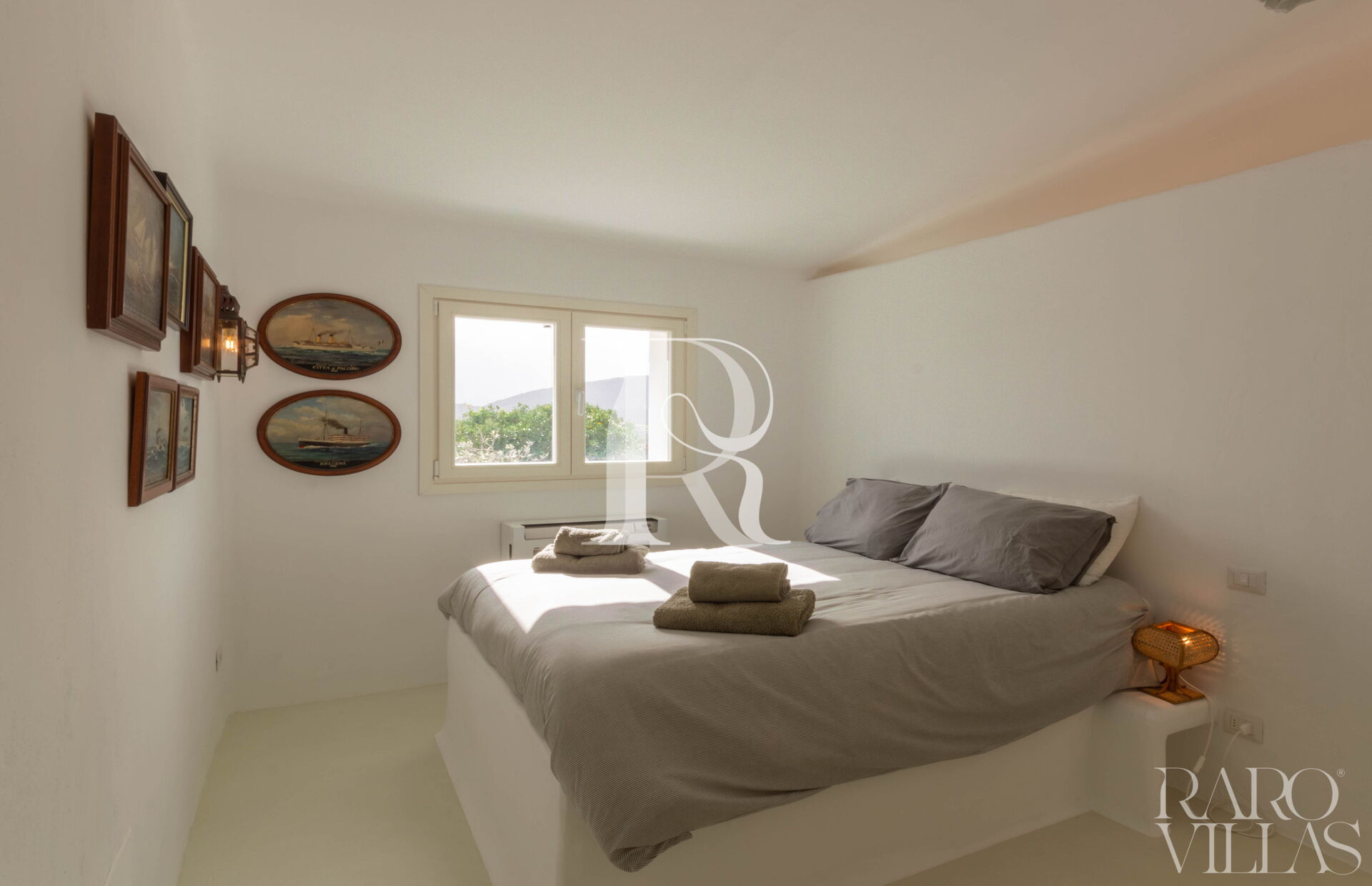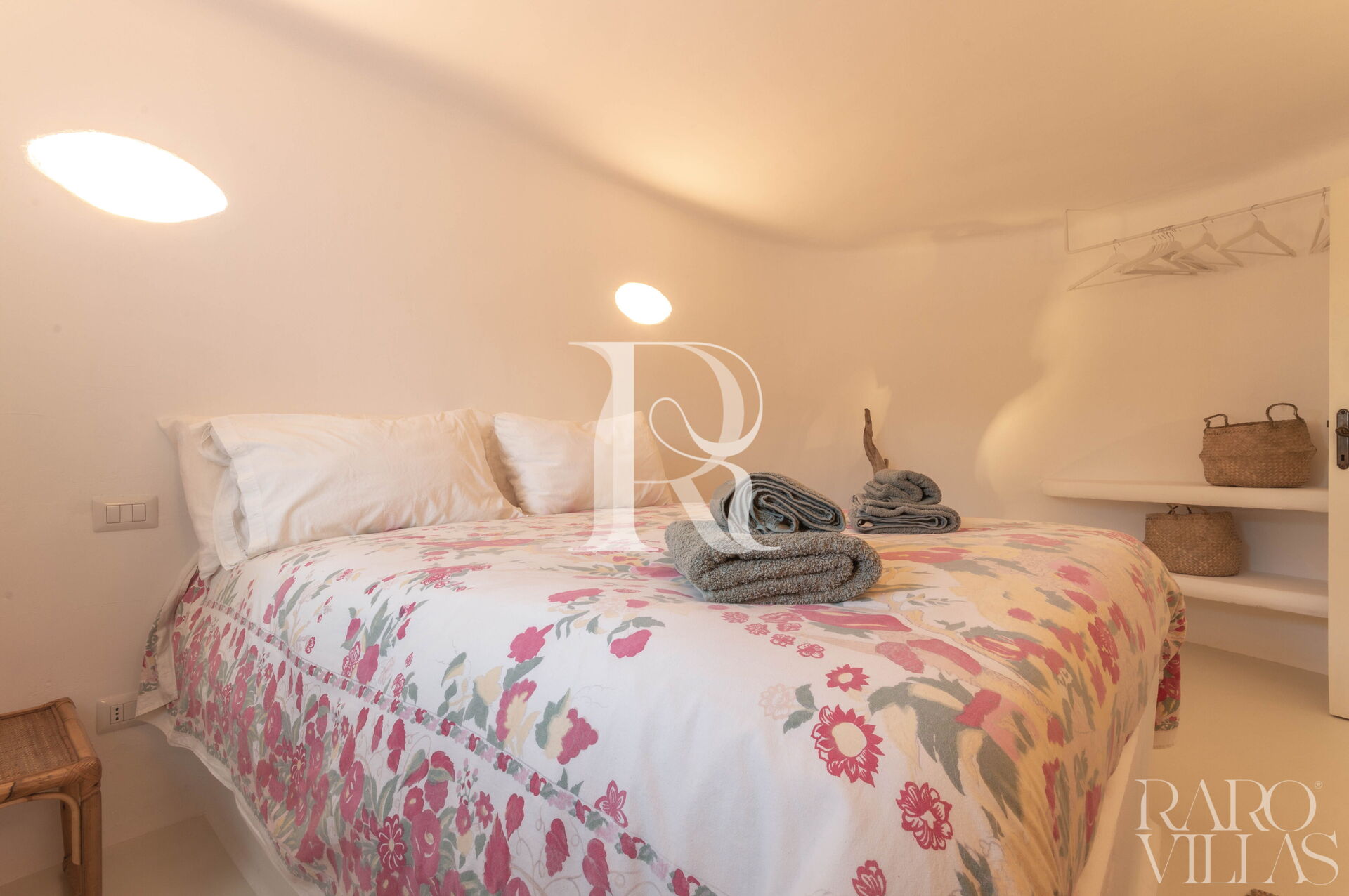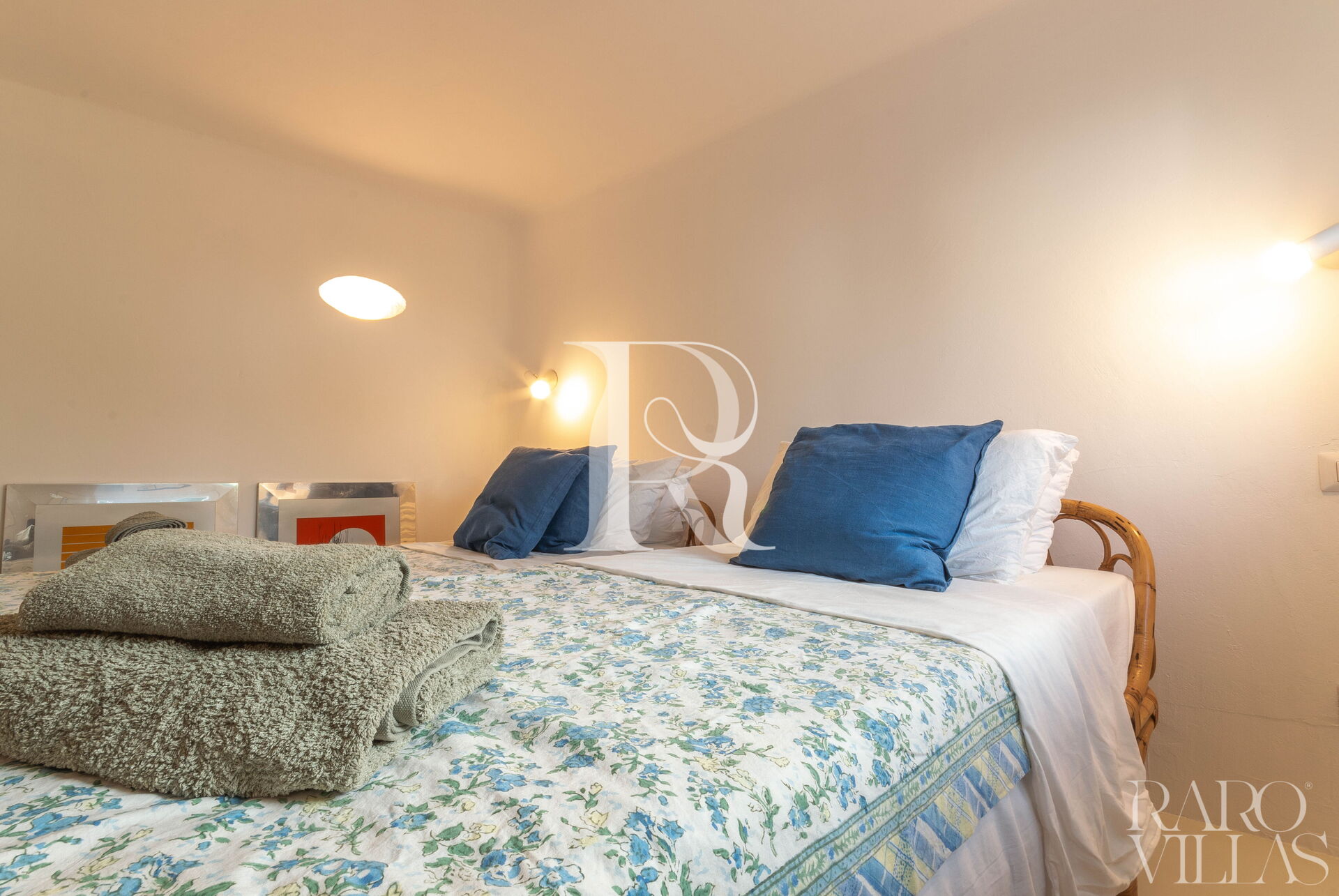 The sleeping area of the villa offers three double bedrooms, two with ensuite bathroom and one twin bedroom with shared bathroom, all air-conditioned, furnished with style and elegance.