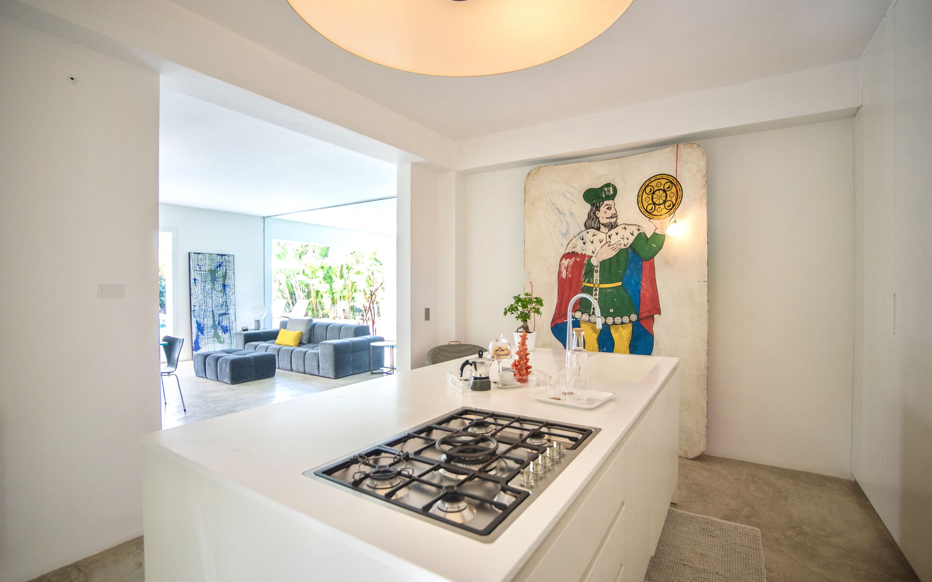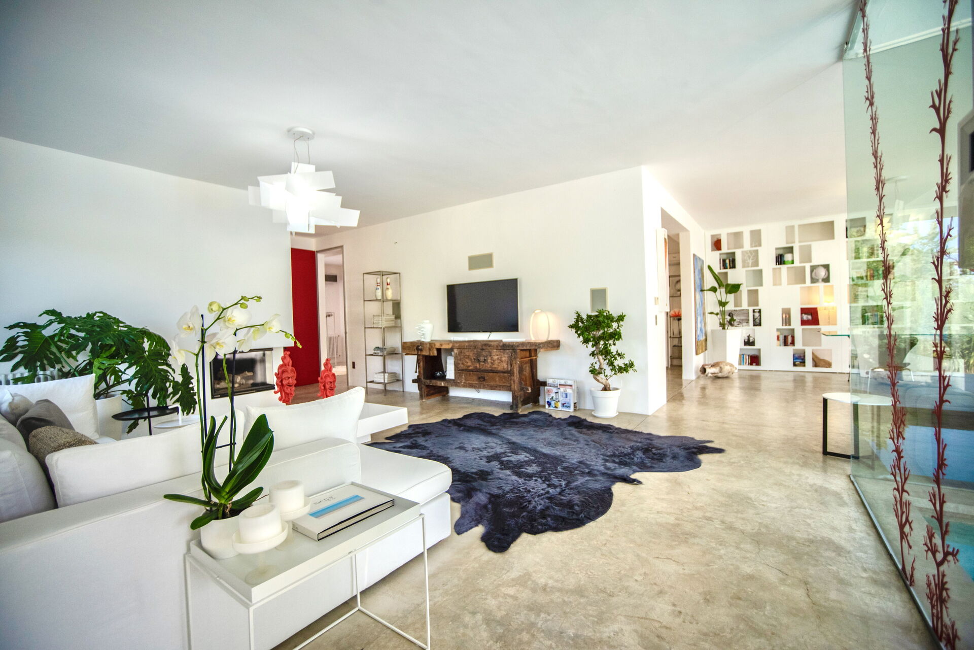 The large living area comprises living room, dining room and kitchen creating a fluid open-plan space, emphasized by the natural concrete floor and the large windows that redefine the interior space so that it becomes one with the outside.