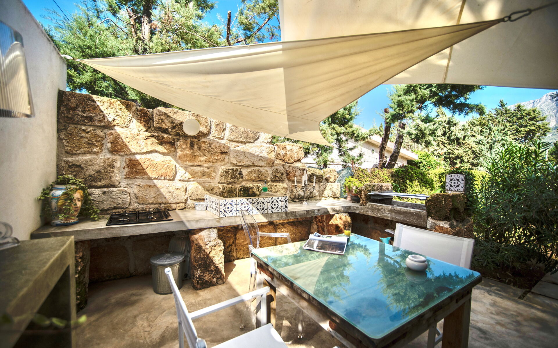 In a corner of the garden, the BBQ area is surrounded by the Mediterranean marquis and