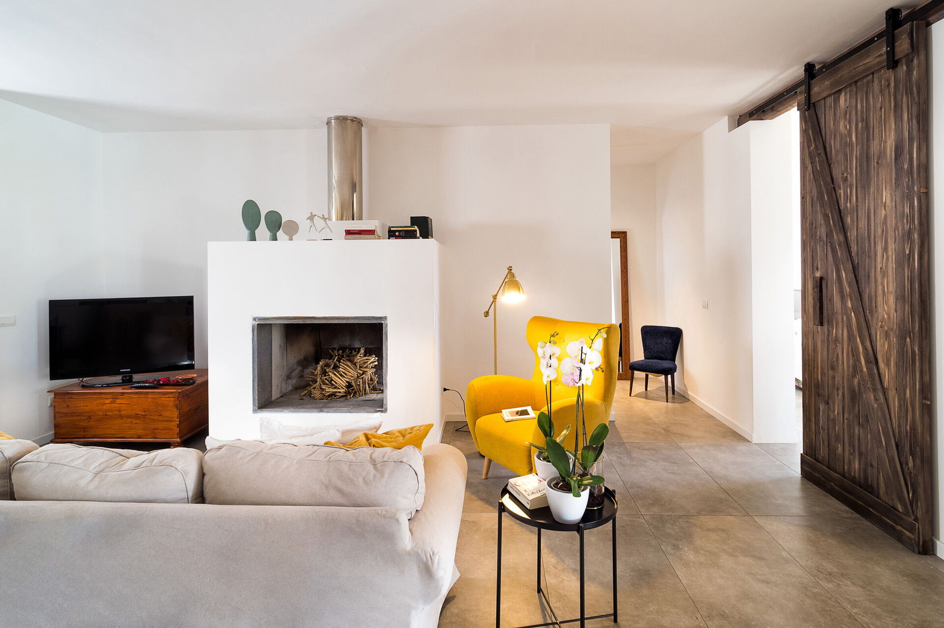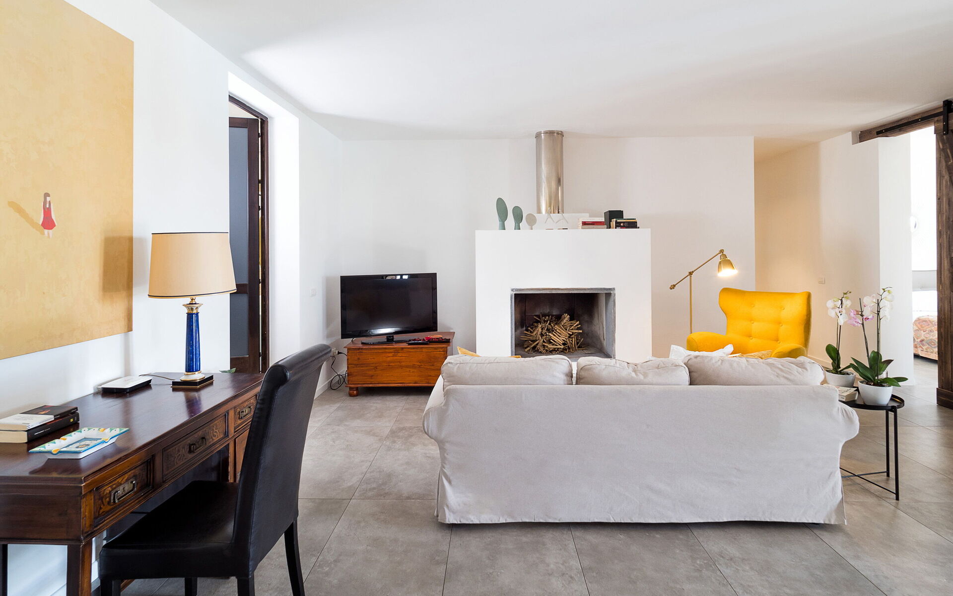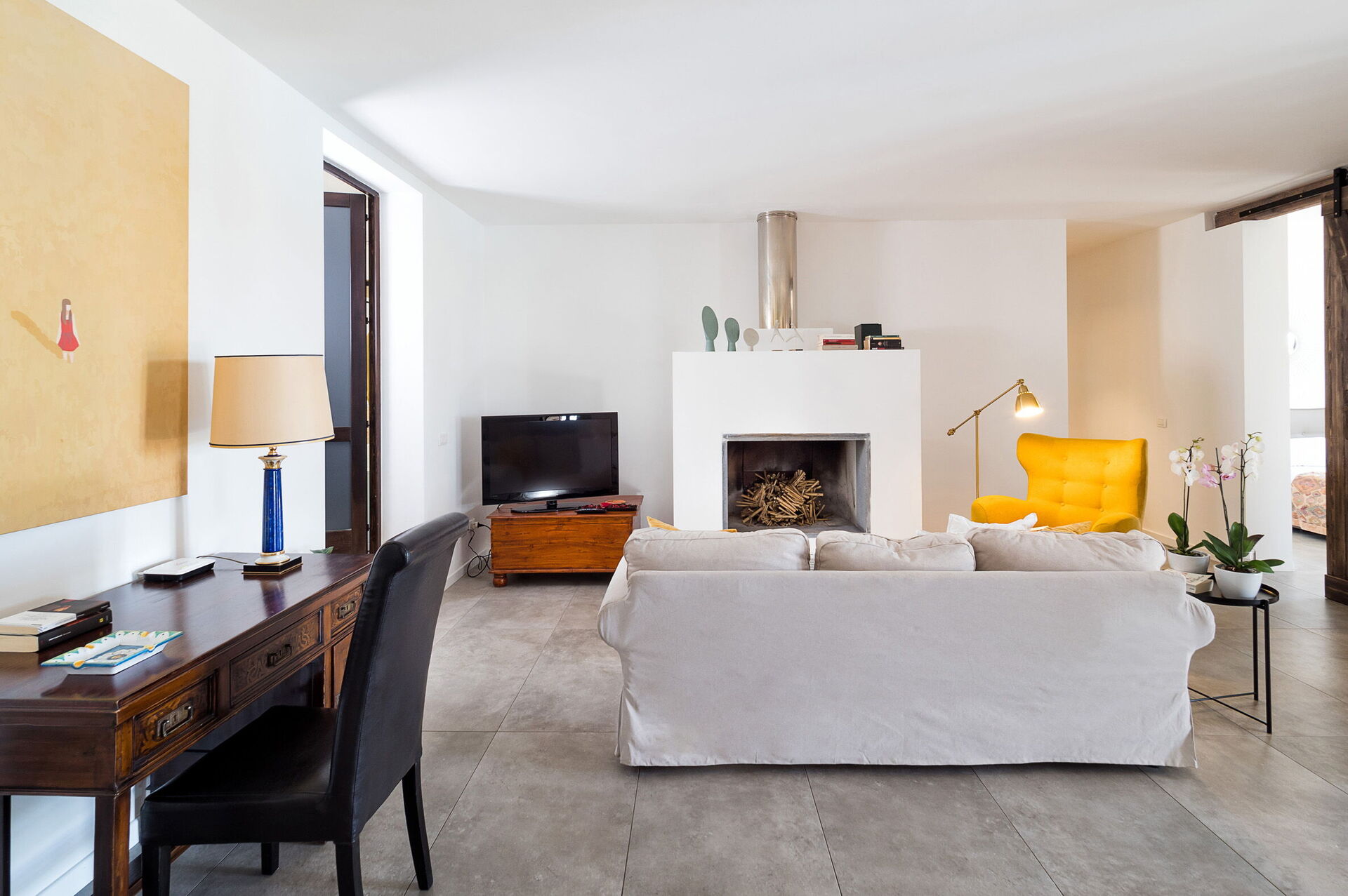 Living room: sofa (people: 3), armchair, working desk, fireplace, dining table (people: 6), WIFI internet, internet, television, mosquito net, exit to the terrace.