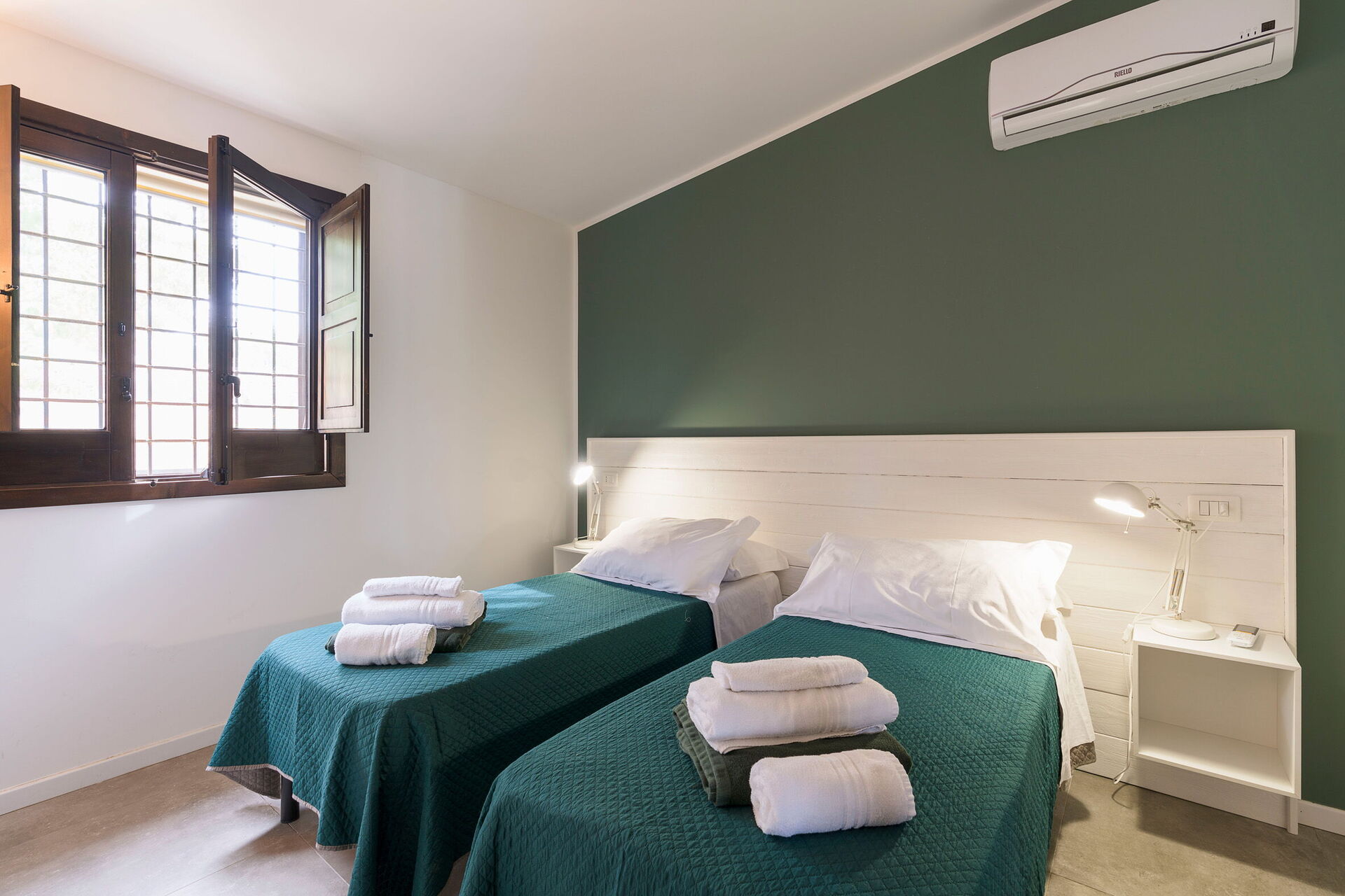 Bedroom + Ensuite Bathroom: two single beds, WIFI internet, internet, air conditioning, mosquito net, television, basin, toilet, bidet, shower.