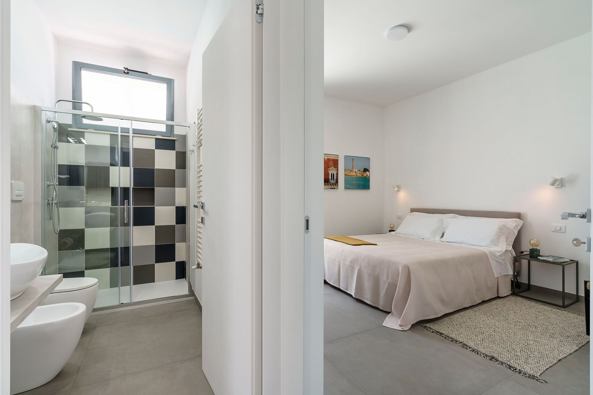 Bedroom + Ensuite Bathroom: double bed, baby crib, WIFI internet, internet, air conditioning, mosquito net, satellite tv, basin, toilet, bidet, shower, hairdryer, exit to the terrace.