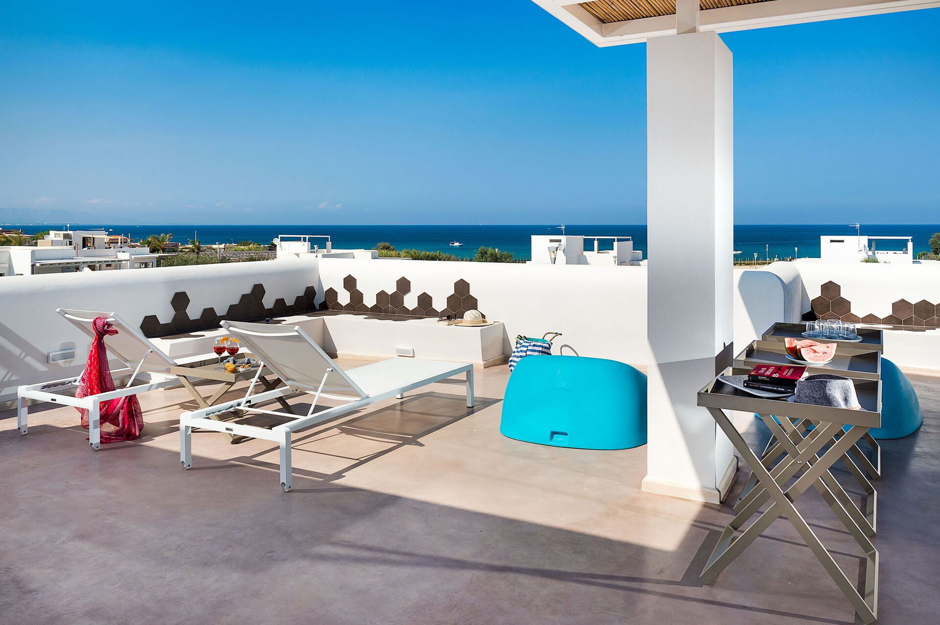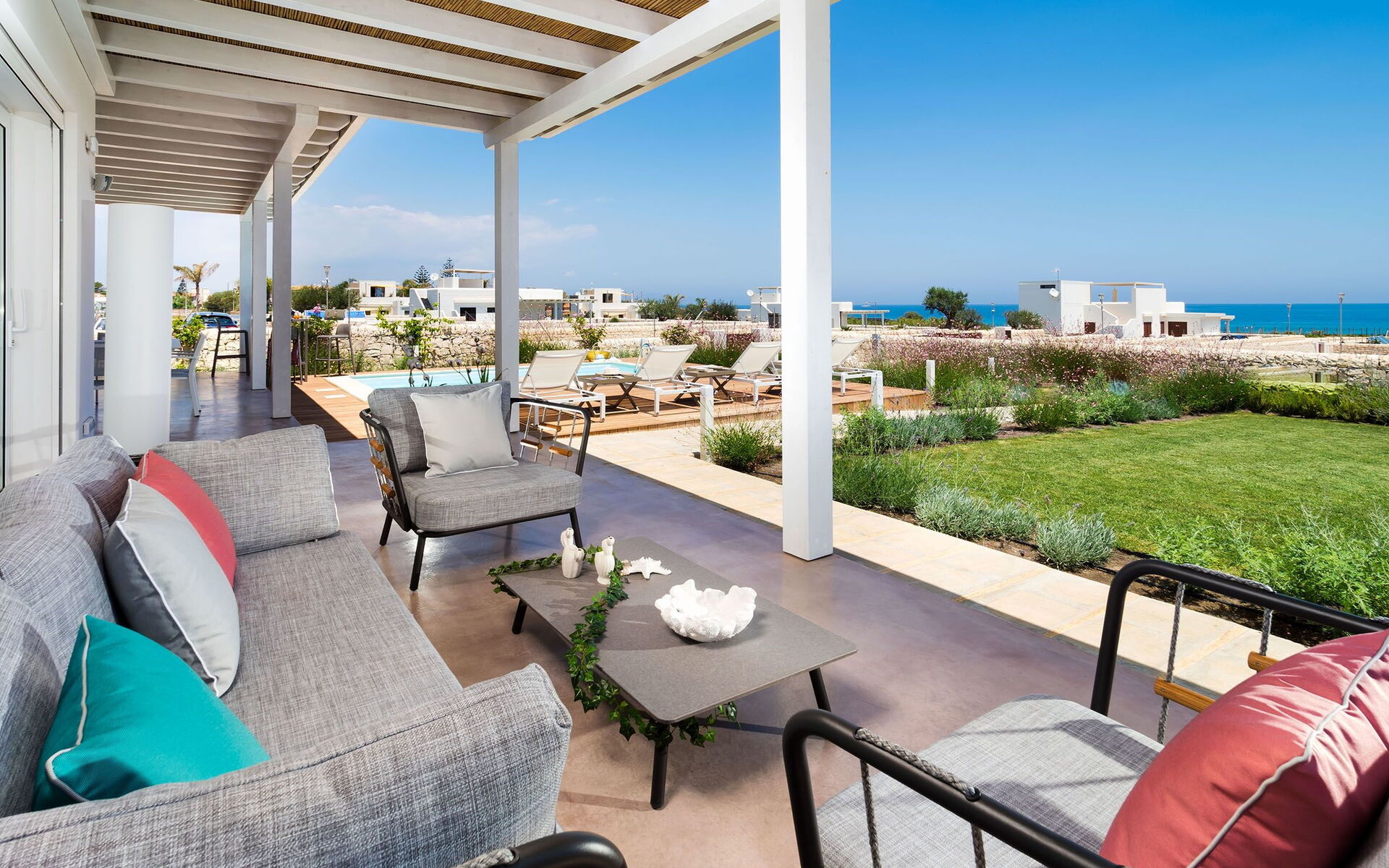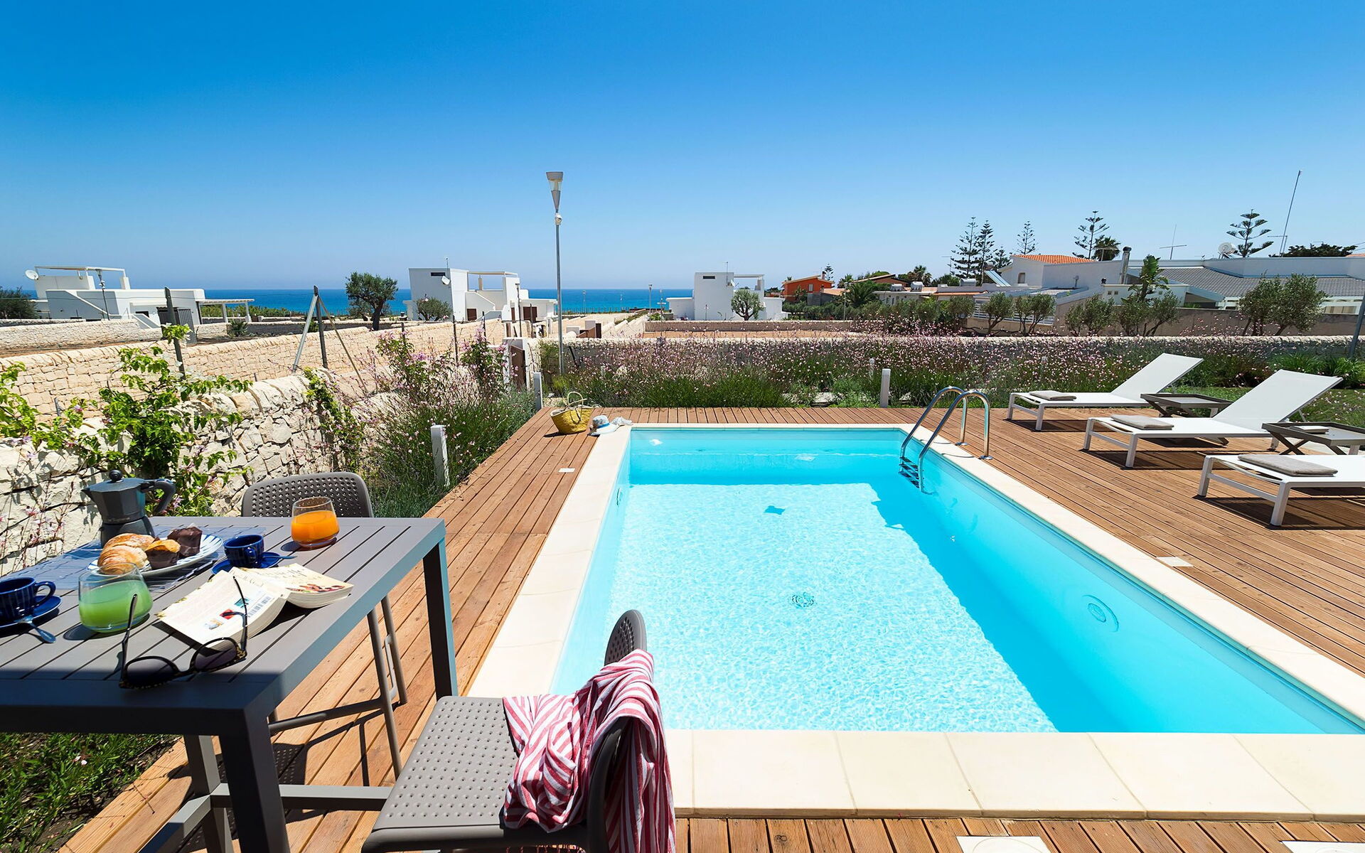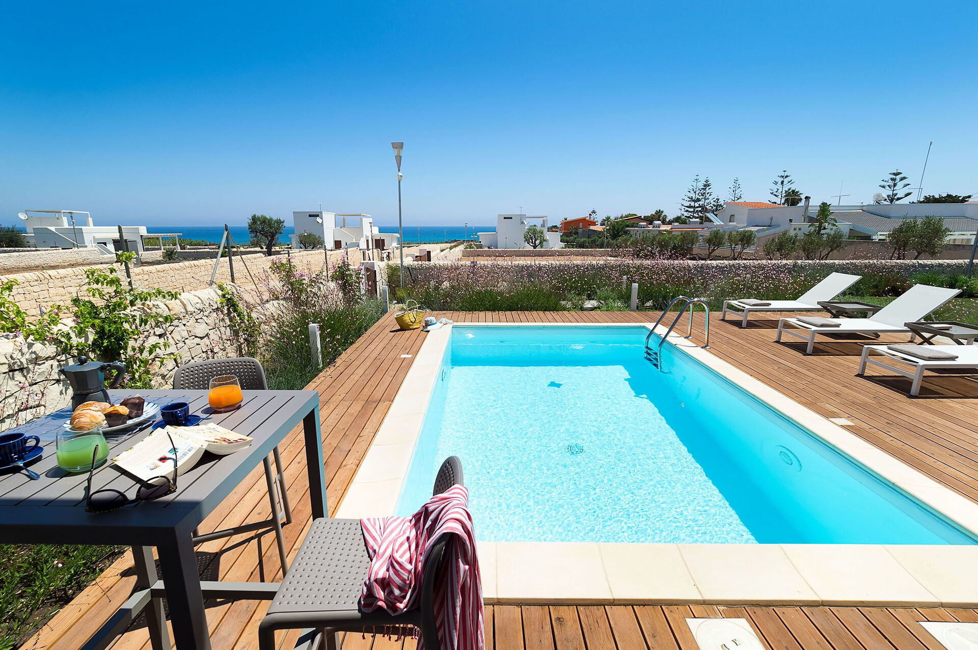 Upon arrival at Villa Pachino you’ll find a beautiful clean well-maintained property with views of the sea ideal for a relaxing vacation in Sicily. After a hectic day of visiting museums, spend some time with friends and family poolside enjoying a glass of wine - a perfect way to unwind at the end the day. Outside you will also find a hot tub and barbecue grill. Dining with friends and family is a huge part of the Italian culture. Take advantage of the kitchen to prepare meals using local produce while on your holiday. The kitchen includes coffee machine, microwave, toaster, stove and refrigerator, as well as, plenty of tableware and cutlery for up to eight people. Dine 'al fresco' like a real Italian, the fully furnished terrace is the ideal setting to enjoy food, family and the lovely Italian weather.