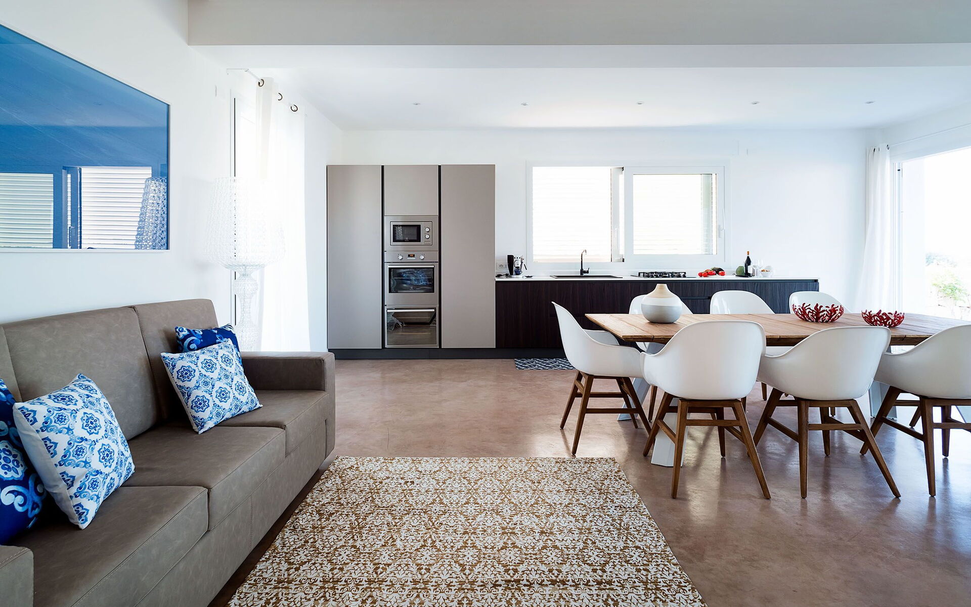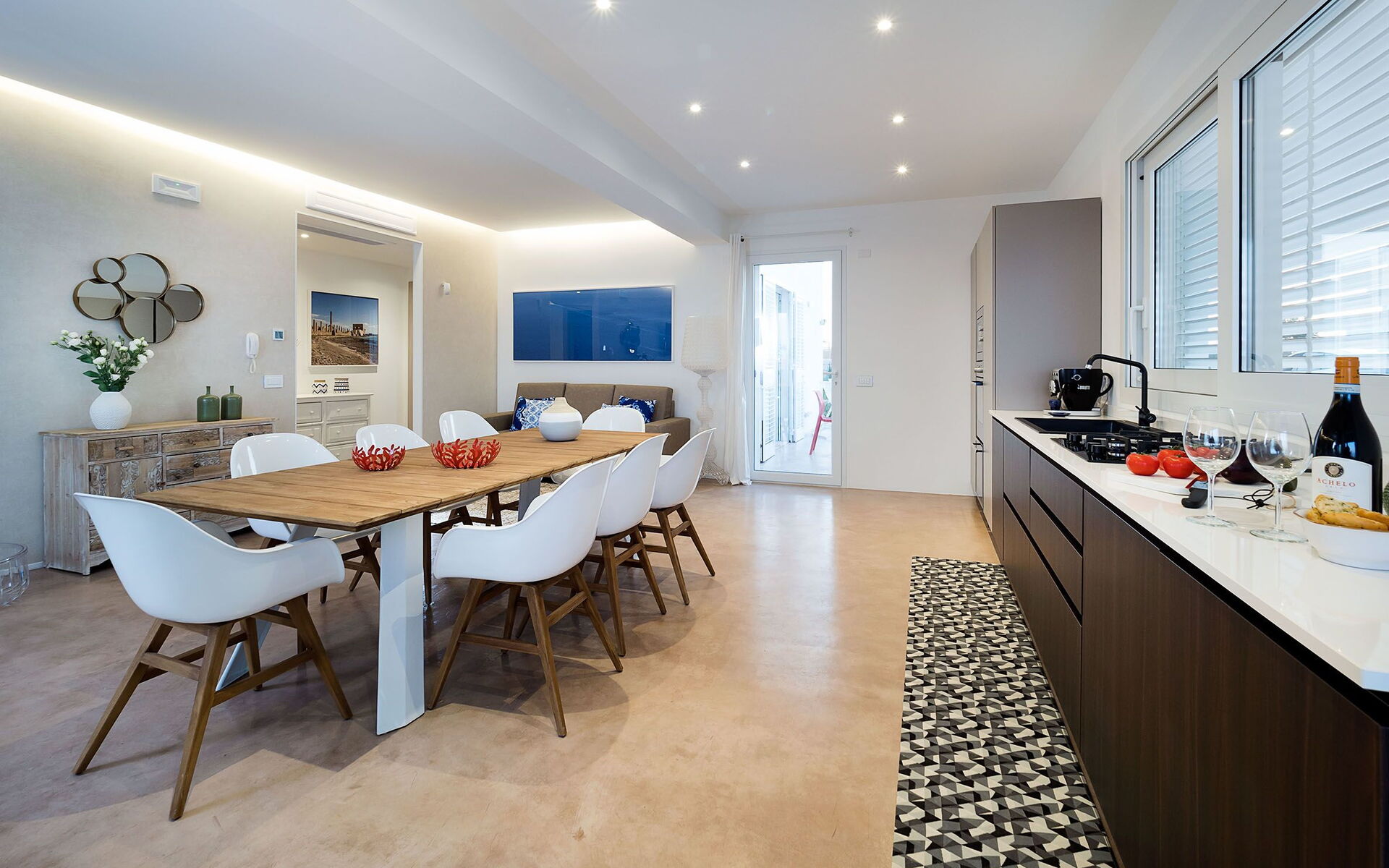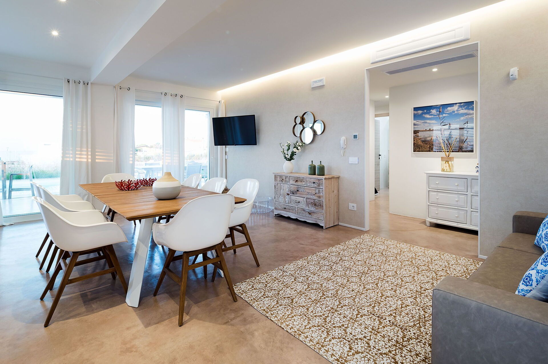 Kitchen + living room: dining table, dishwasher, fridge, freezer, microwave, stove top, oven, toaster, italian coffee machine, american coffee machine, sofa, WIFI internet, internet, air conditioning, satellite tv, television.