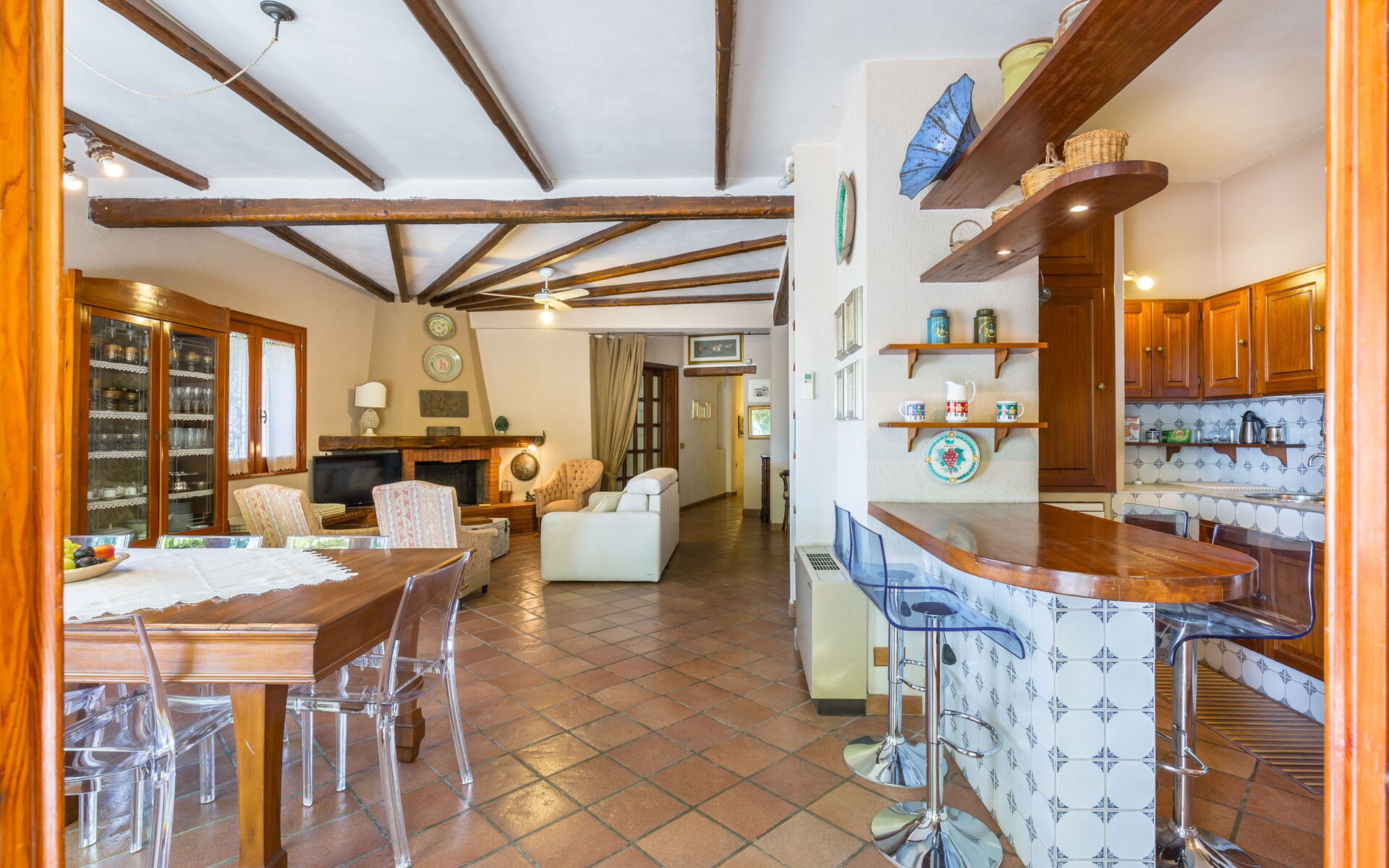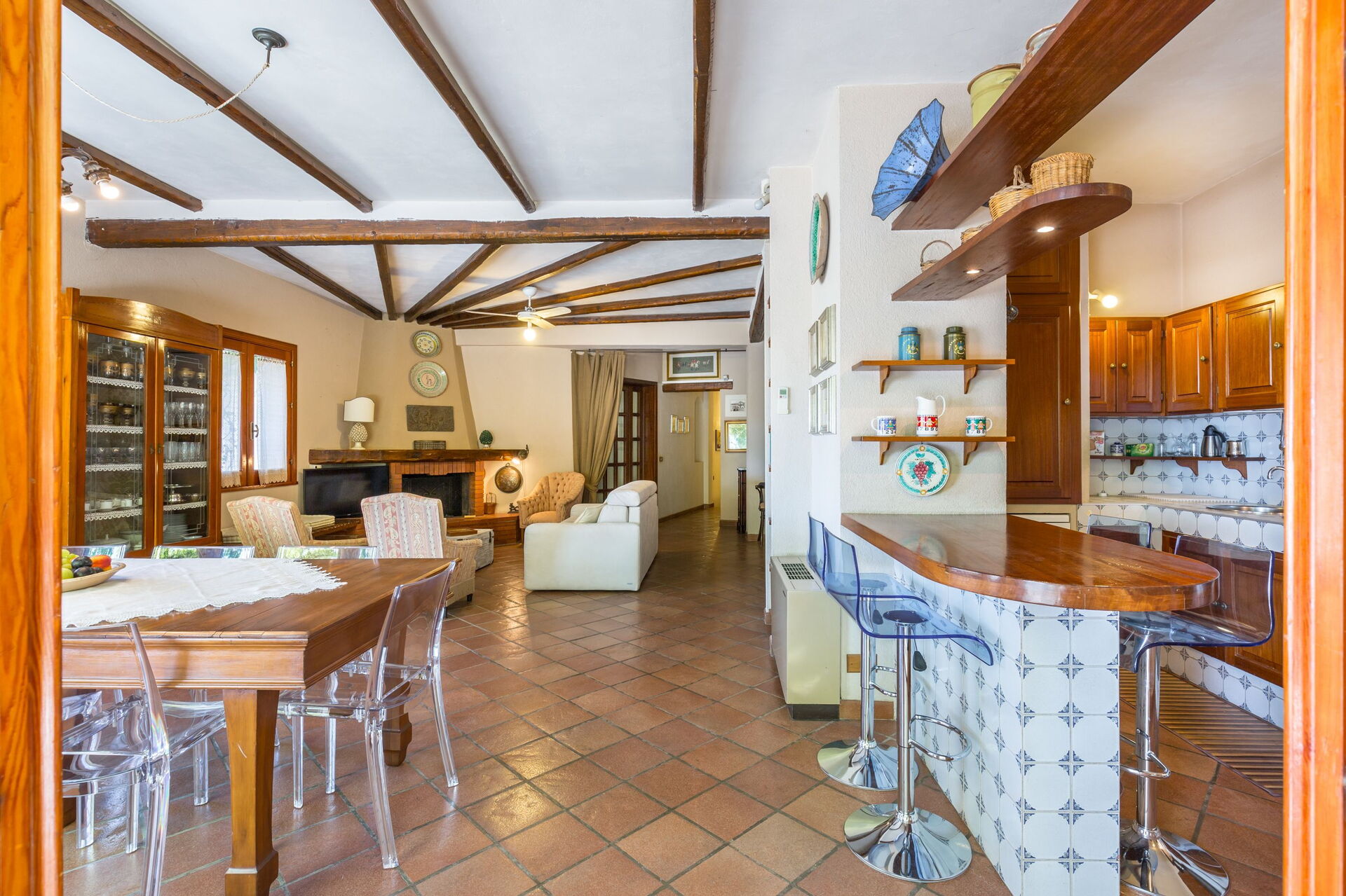 Ground floor: living area (air-conditioning) with fireplace and dining area, kitchen (fridge, freezer, toaster, oven), bathroom with shower, access to panoramic terrace (barbecue).
