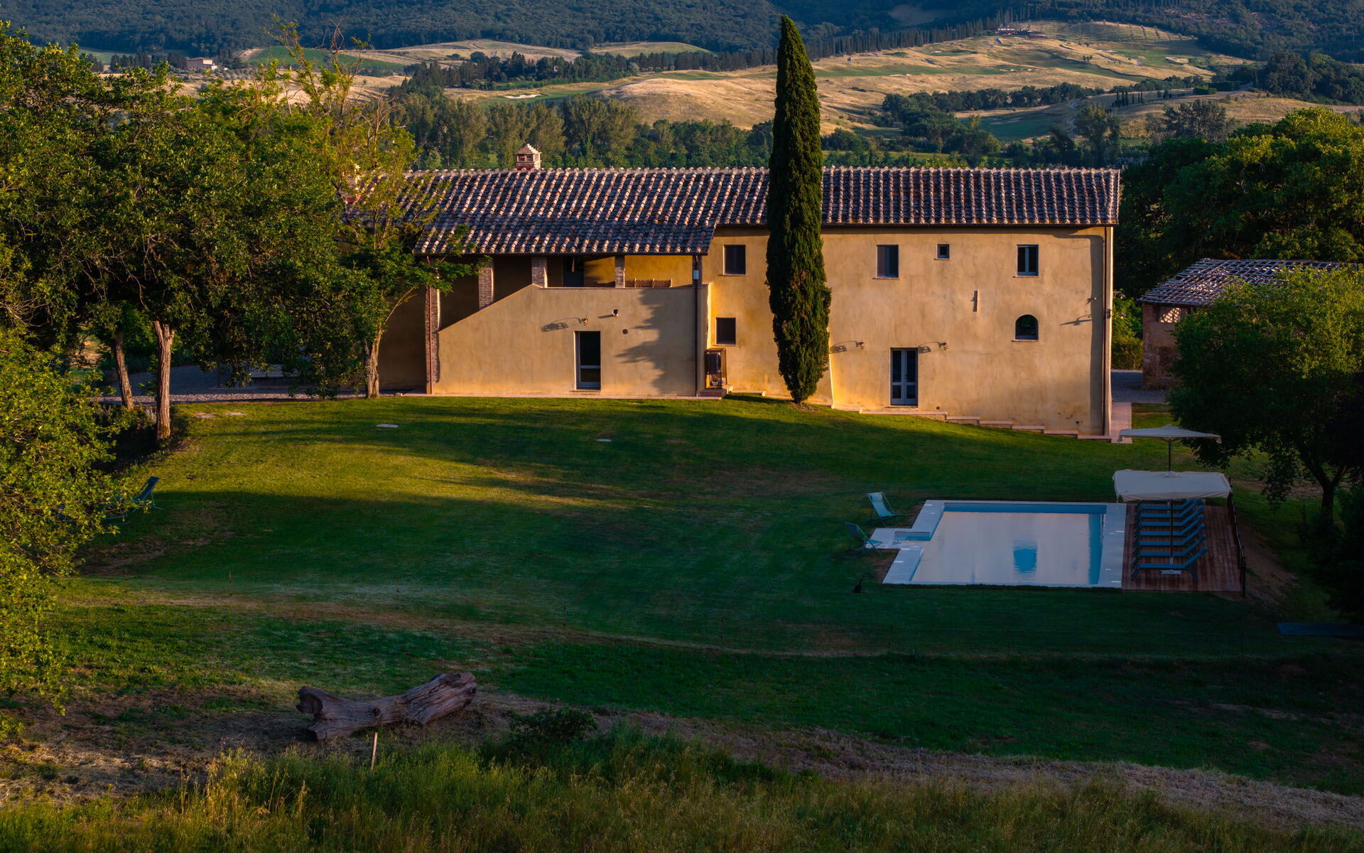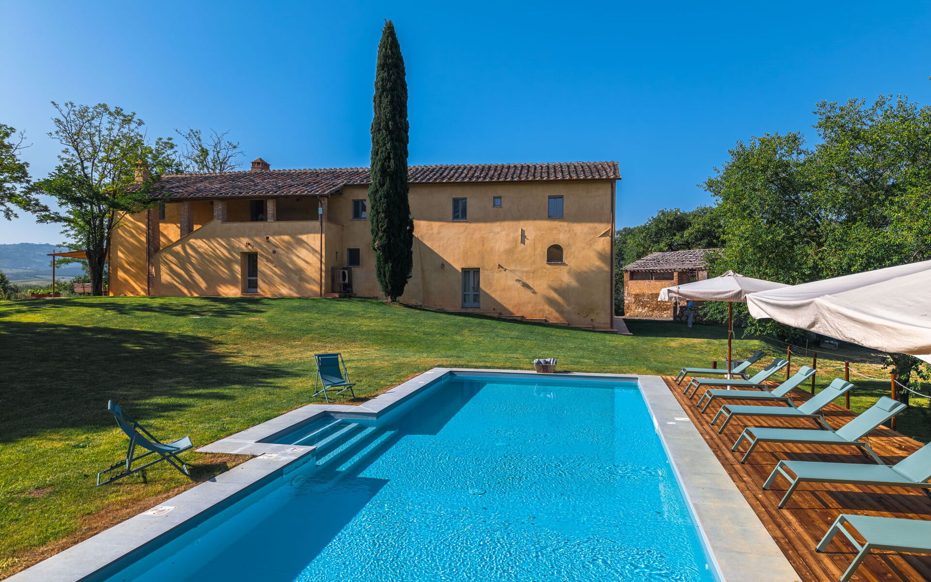 Conveniently located 2 km (1 mi) from Bibbiano, Italy in the tourist area "Orcia Valley" and only 21 km (13 mi) from Montalcino. Property Villa Aiale is a beautiful property (500 sq m) that includes private pool, WiFi internet and air conditioning. The property can accommodate up to 14 people comfortably in seven bedrooms with eight bathrooms.