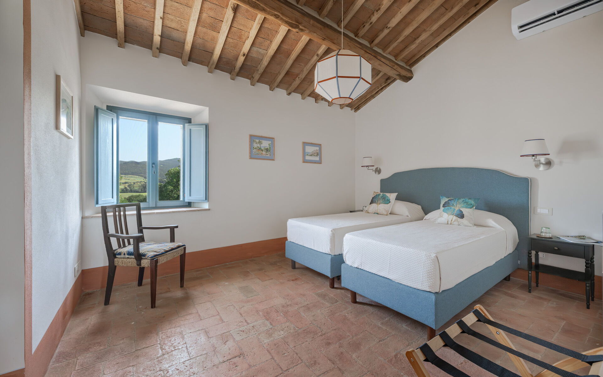 Bedroom + Ensuite Bathroom 5: two single beds, air conditioning, mosquito net, basin, toilet, bidet, shower, hairdryer.