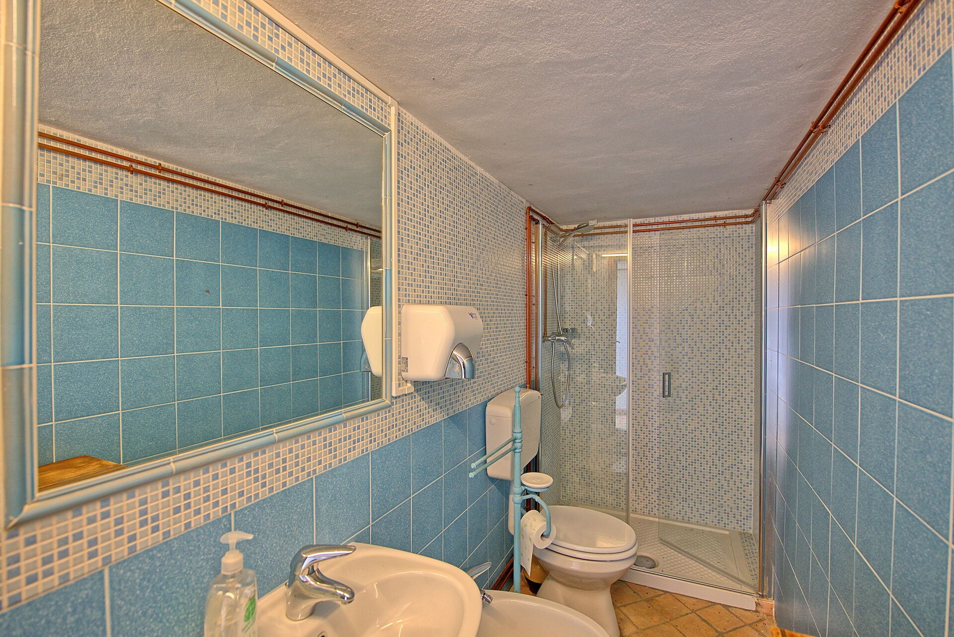 Lower floor: twin bedroom (this bedroom as a high window), WC, studio flat with double bedroom, bathroom with shower and living area with kitchenette (dishwasher, oven fridge-freezer) and dining area. There is direct access to outside from this floor (to the side of the swimming pool).
