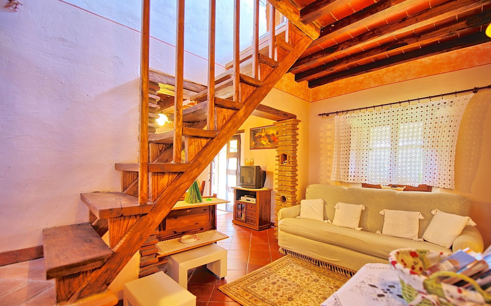 Ground floor: living-room (satellite TV) with fireplace, dining area and kitchen corner (oven, freezer, dishwasher, microwaves, American coffee maker), 2 double bedrooms, bathroom with shower.