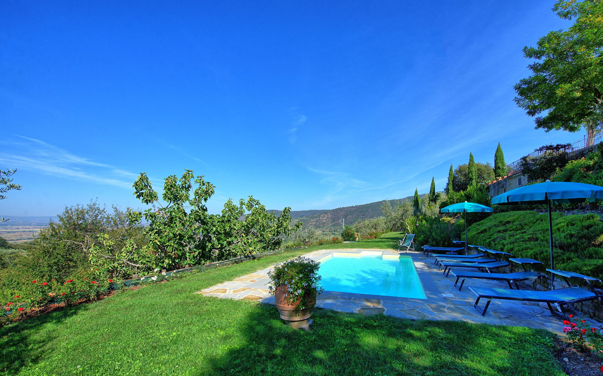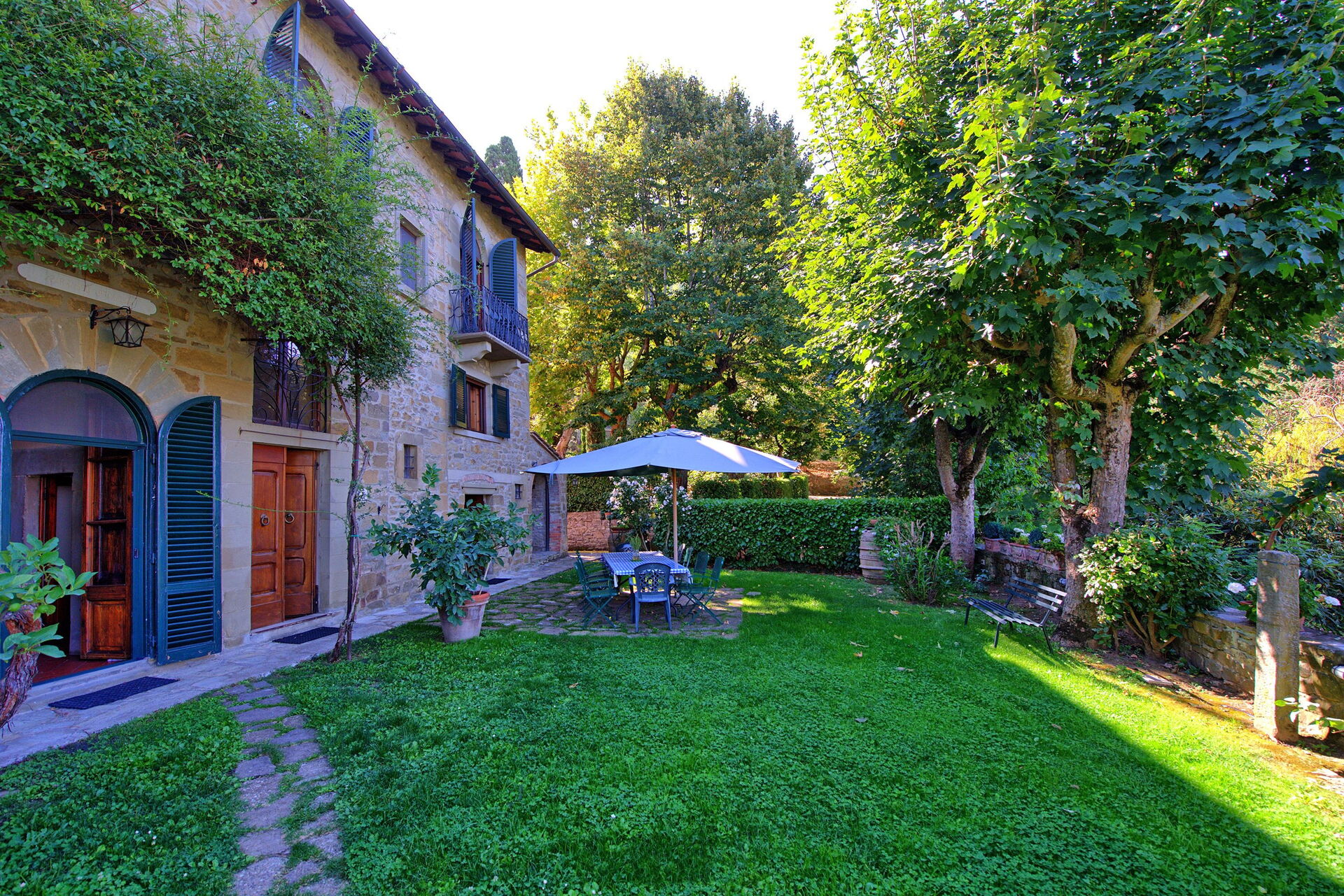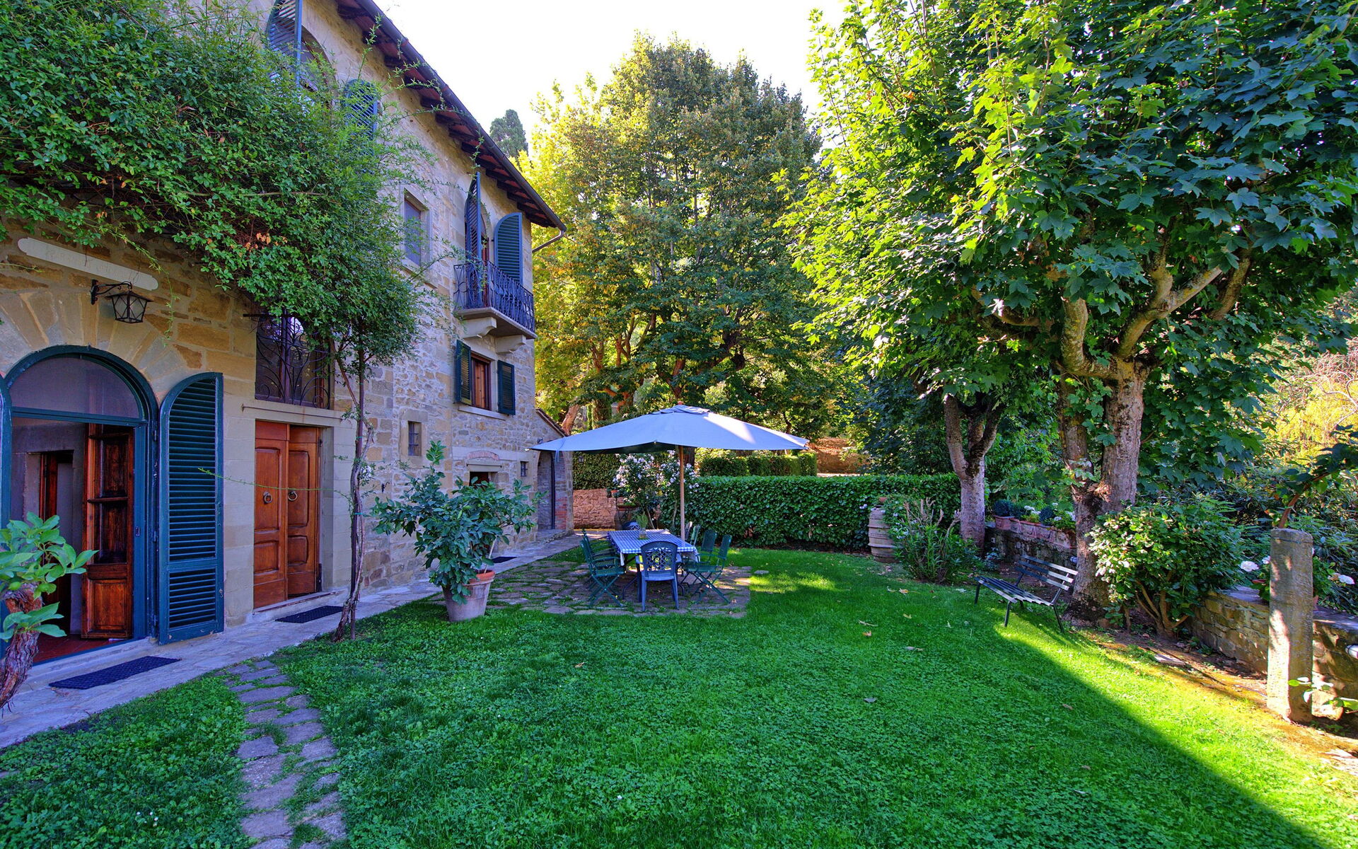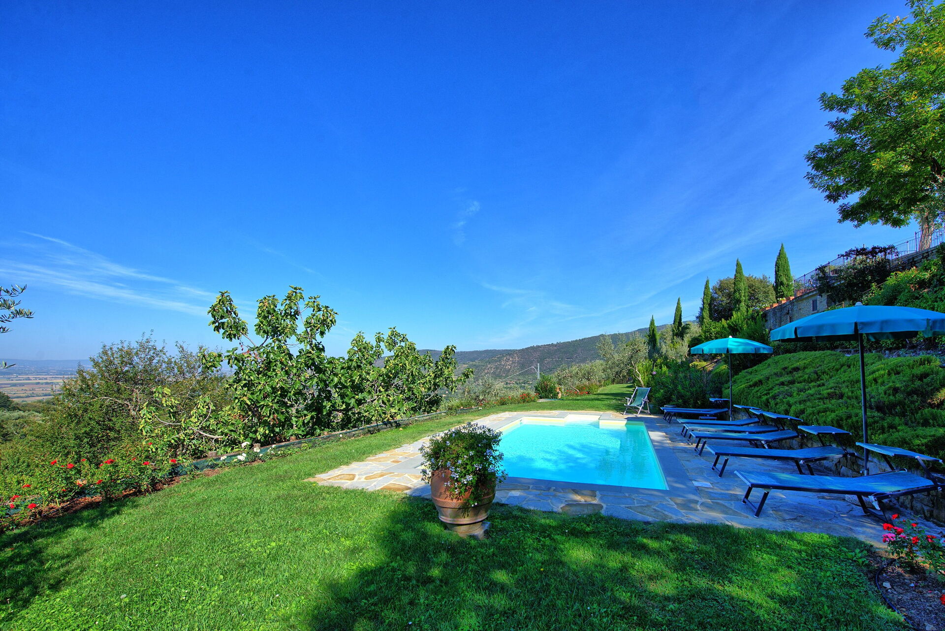 Both the villa and the farmhouse open out through large French doors (all with insect screen) onto the front garden unfolding with terracings and lawns.