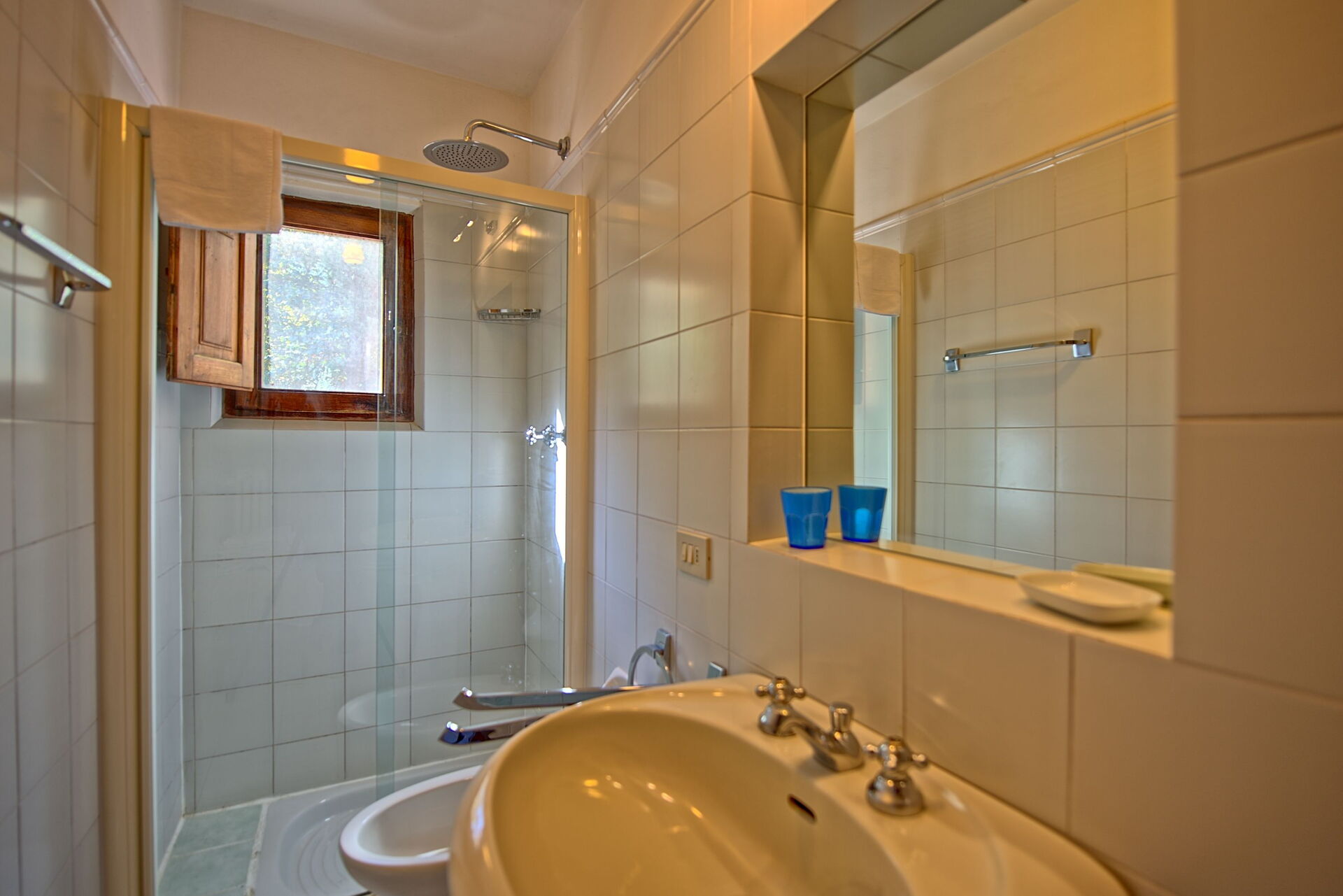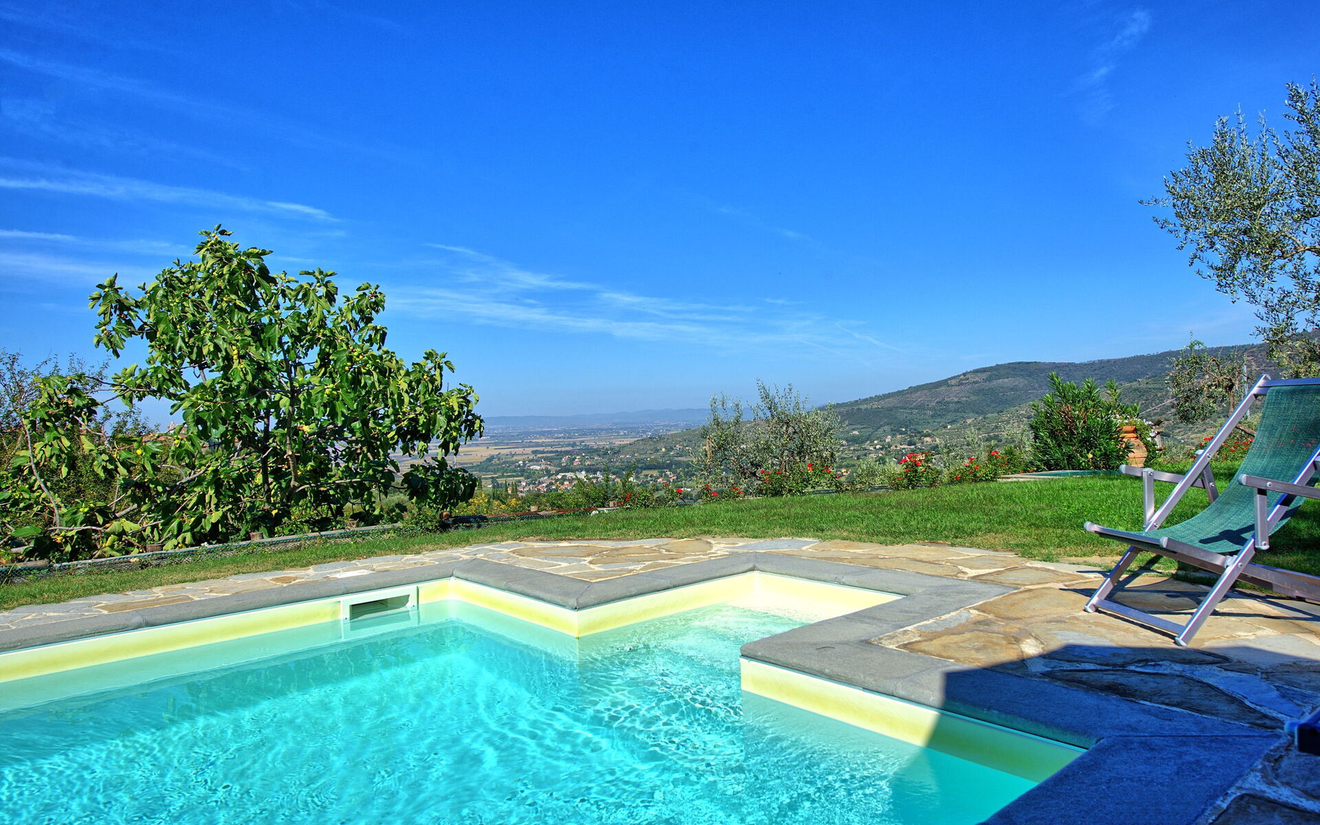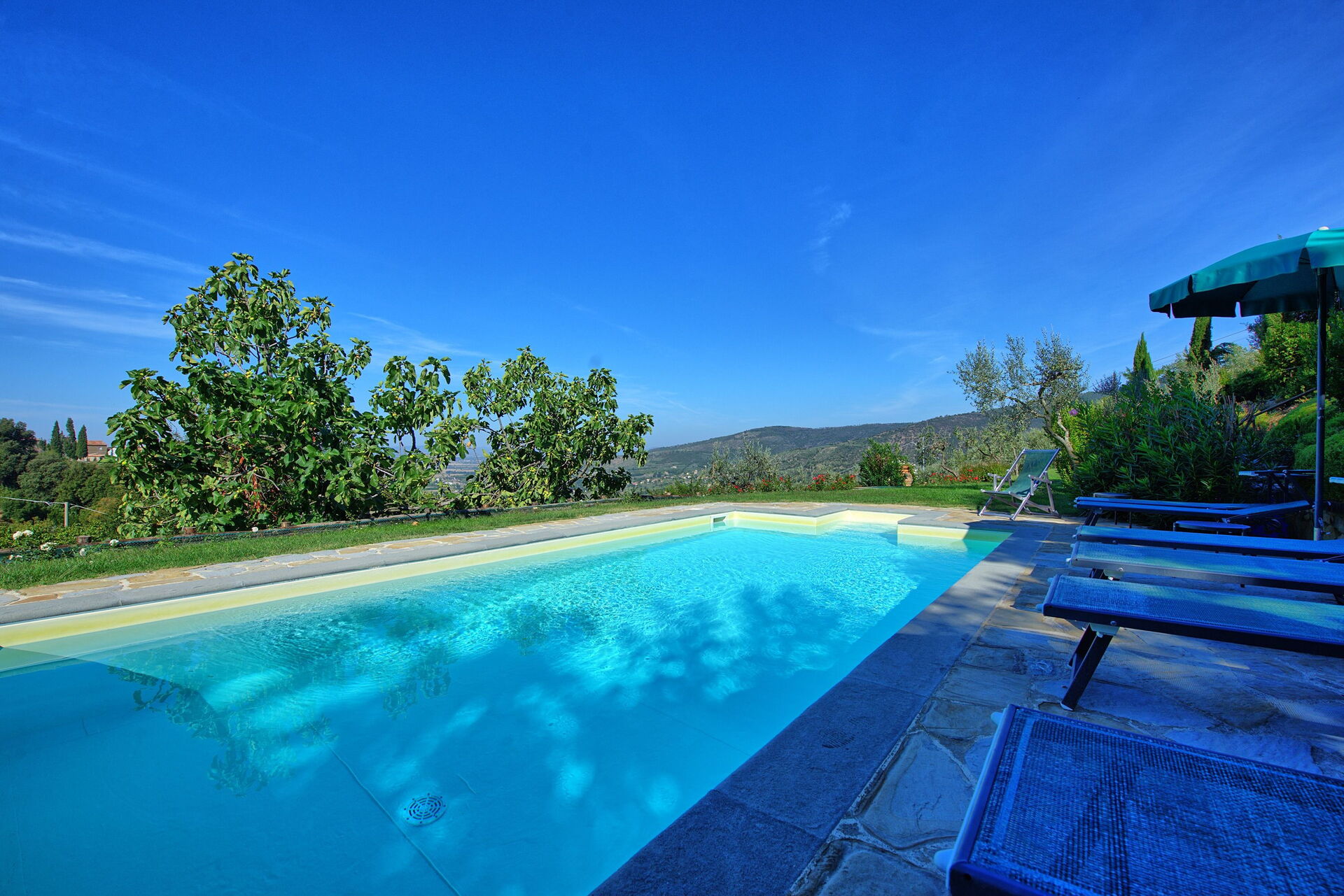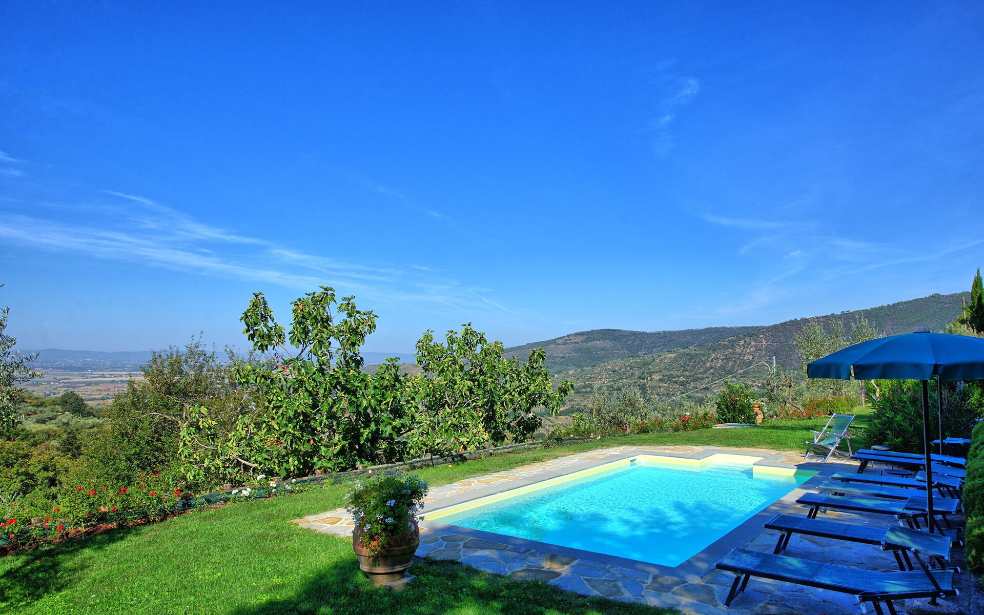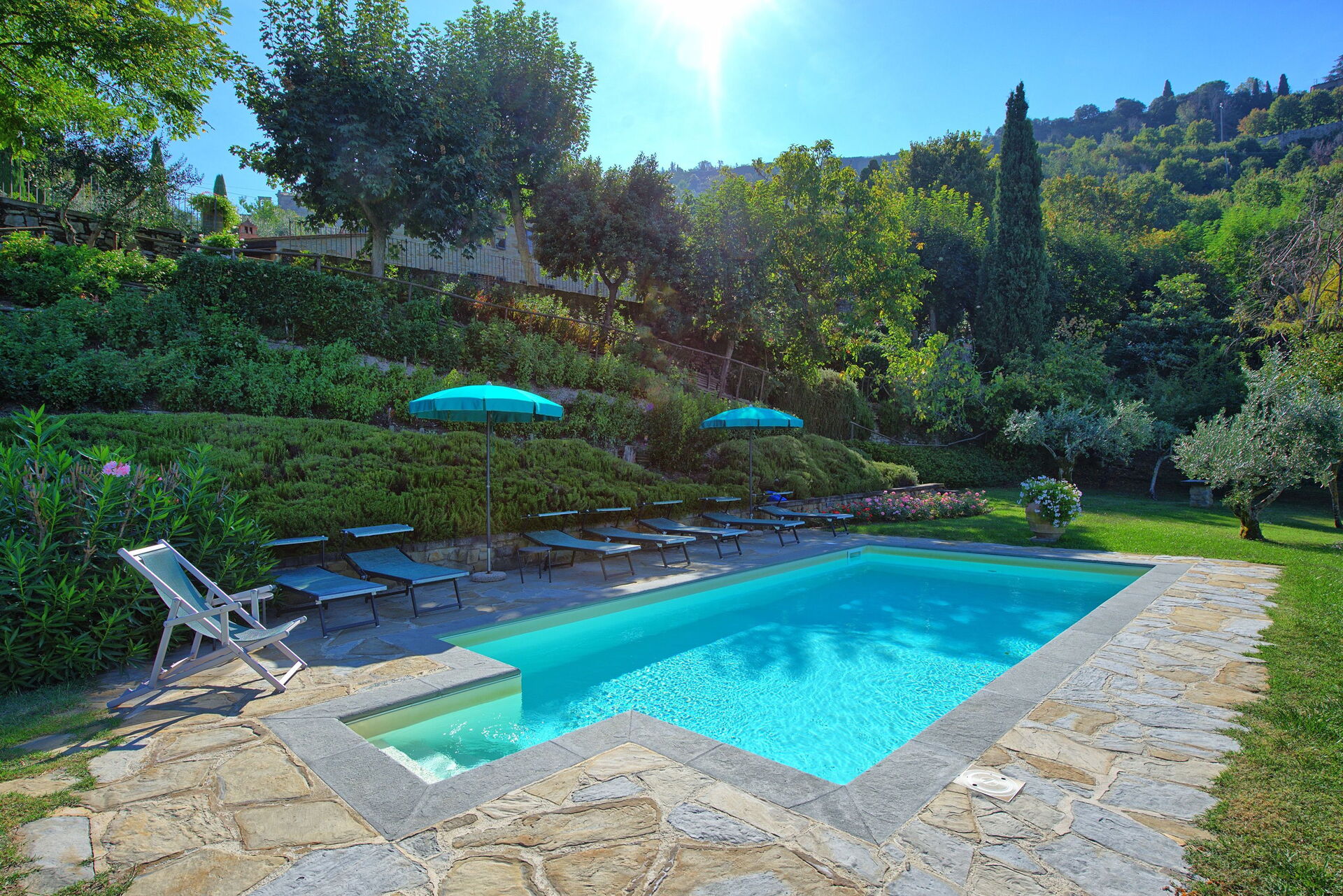 Both the villa and the farmhouse open out through large French doors (all with insect screen) onto the front garden unfolding with terracings and lawns.