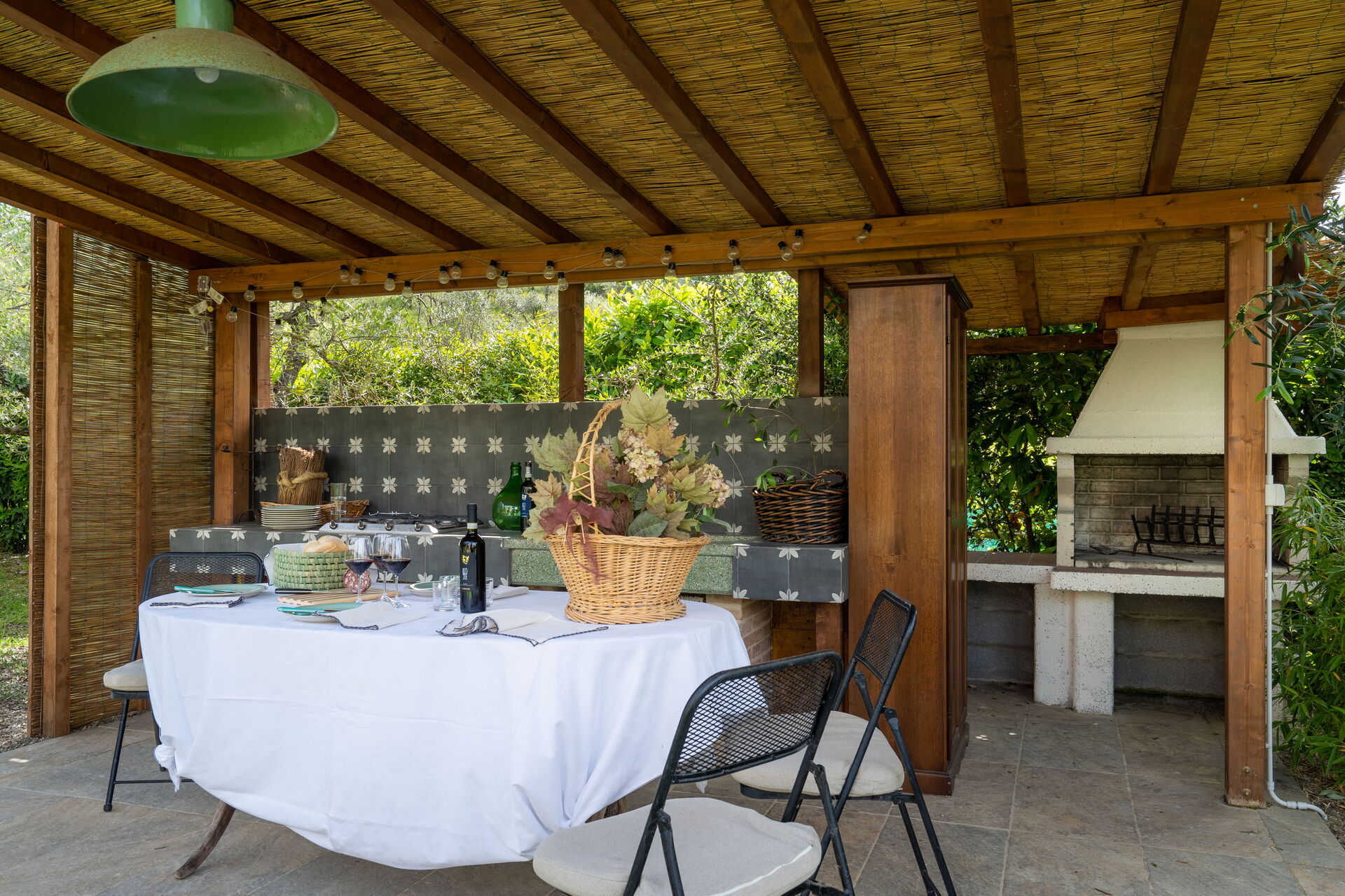 On the ground floor: large living / dining room of 37sqm. with fireplace and satellite TV flat screen with access to the covered loggia equipped for outdoor dining; small kitchen of 8 sqm with five burners, oven, microwave, fridge freezer, dishwasher; 1 bathroom with shower (toilet).