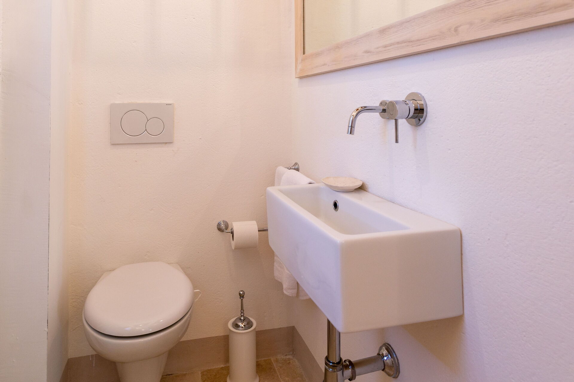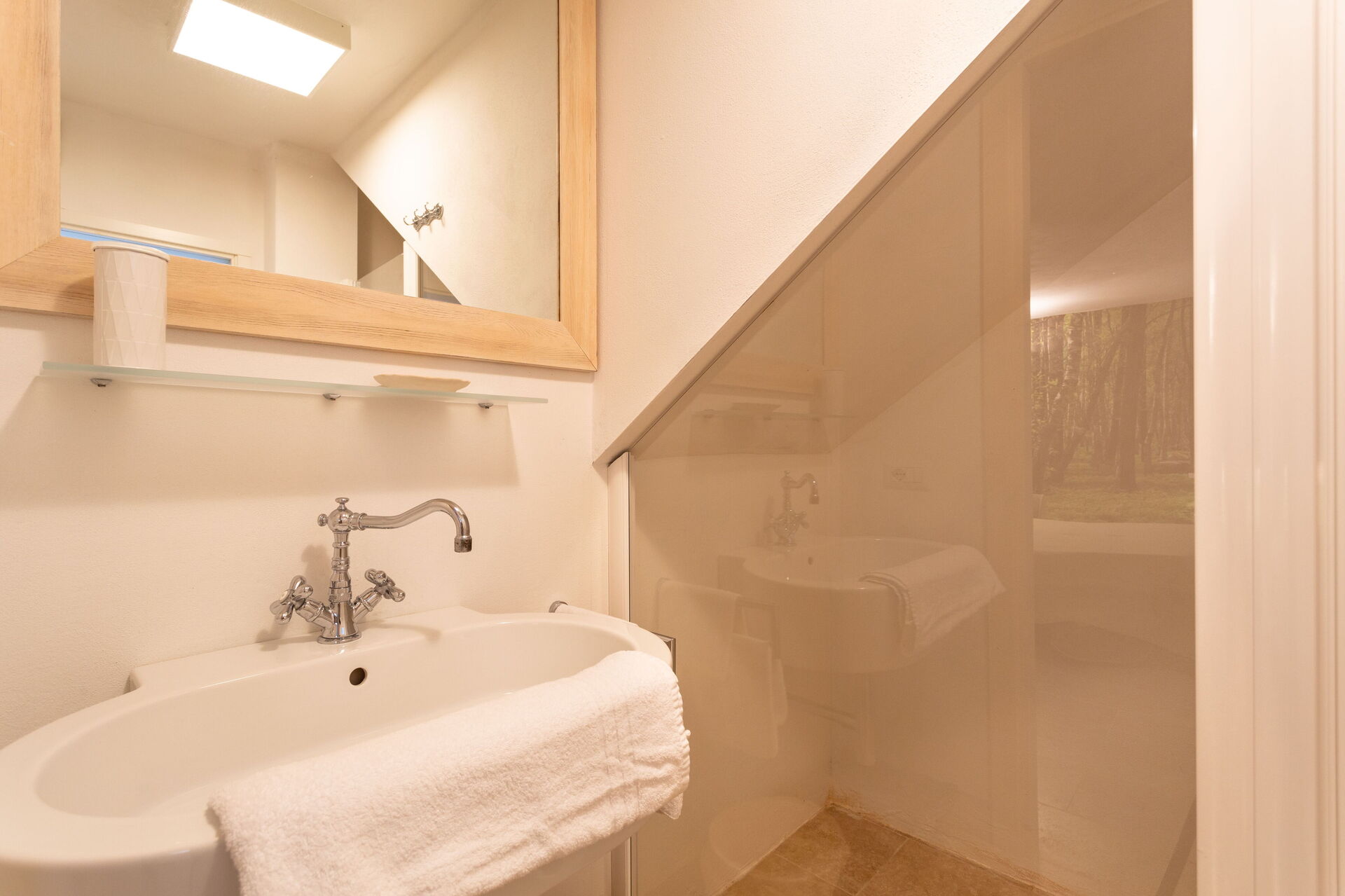 Downstairs: 1 large bedroom with a double bed and a sofa; 1 bathroom with shower (toilet / bidet). On the first floor: 2 double bedrooms each with private bathroom with shower (toilet / bidet).