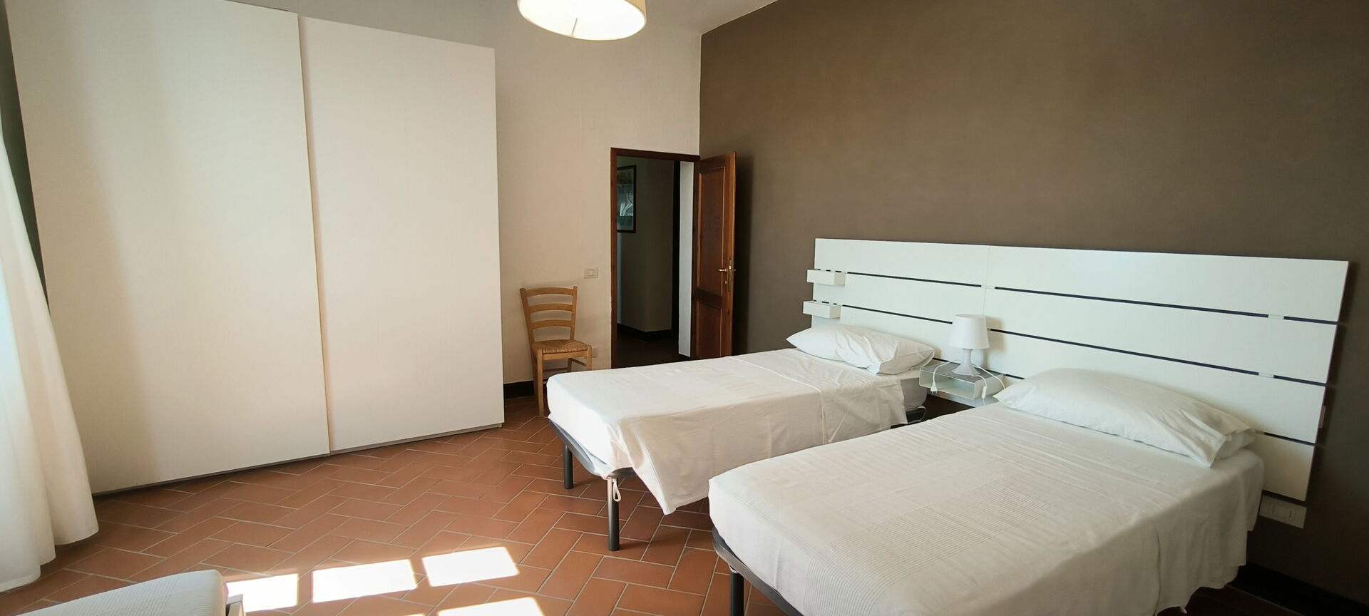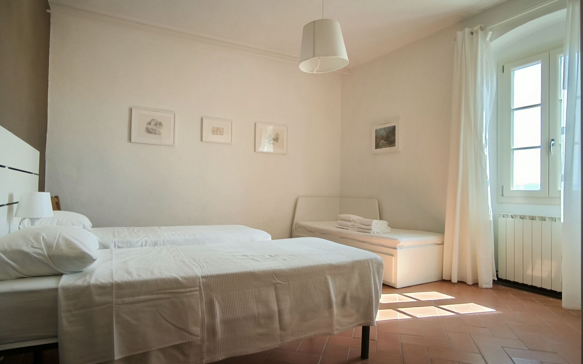 Bedroom 3 (20 m2): three single beds, mosquito net, portable fan.