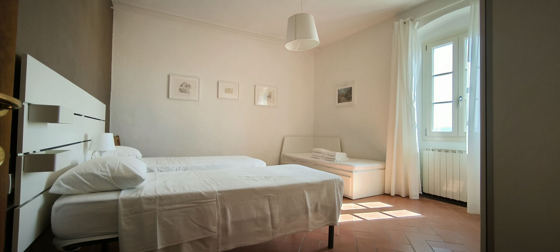 Bedroom 1 (20 m2): two single beds, sofa bed double, mosquito net, portable fan.