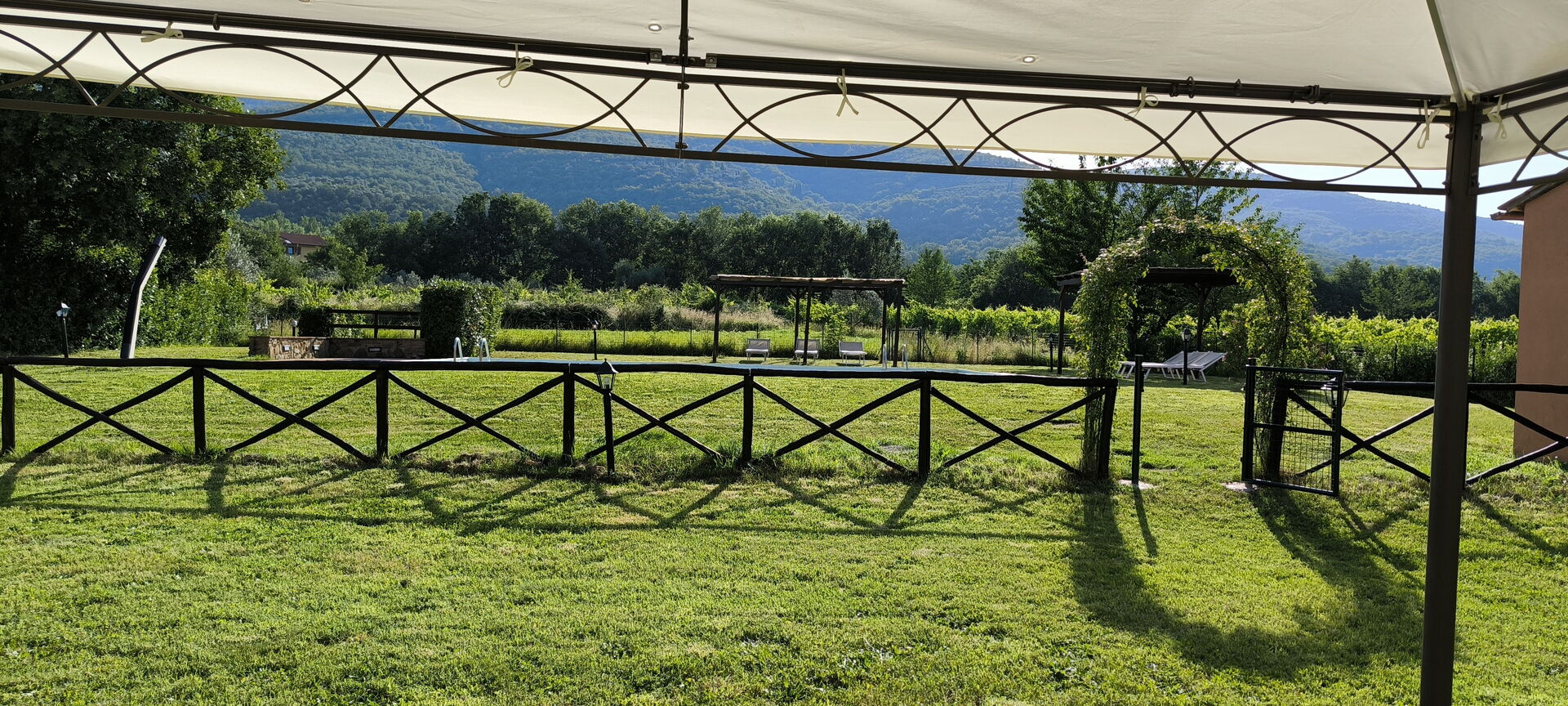 Garden: swimming pool (fenced), barbecue, al fresco dining, dining table (people: 12), gazebo, garden furniture, sunbed, fenced, enclosed property, children's playground (fenced).
