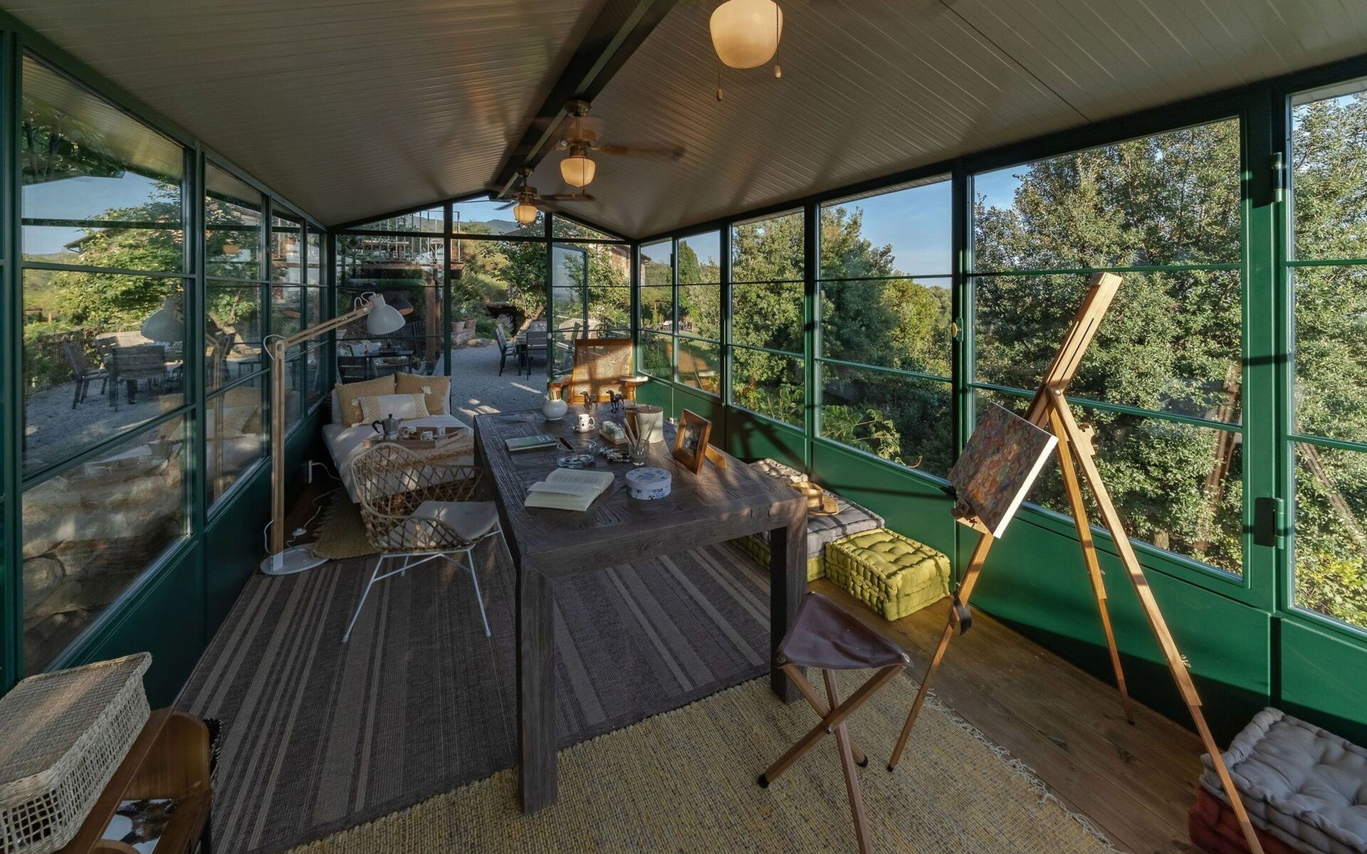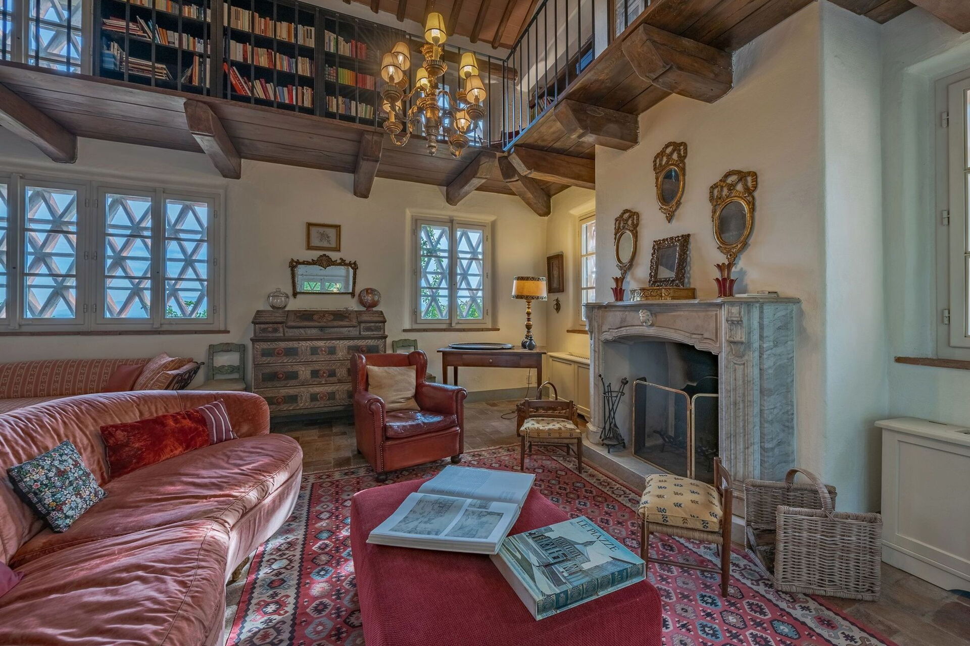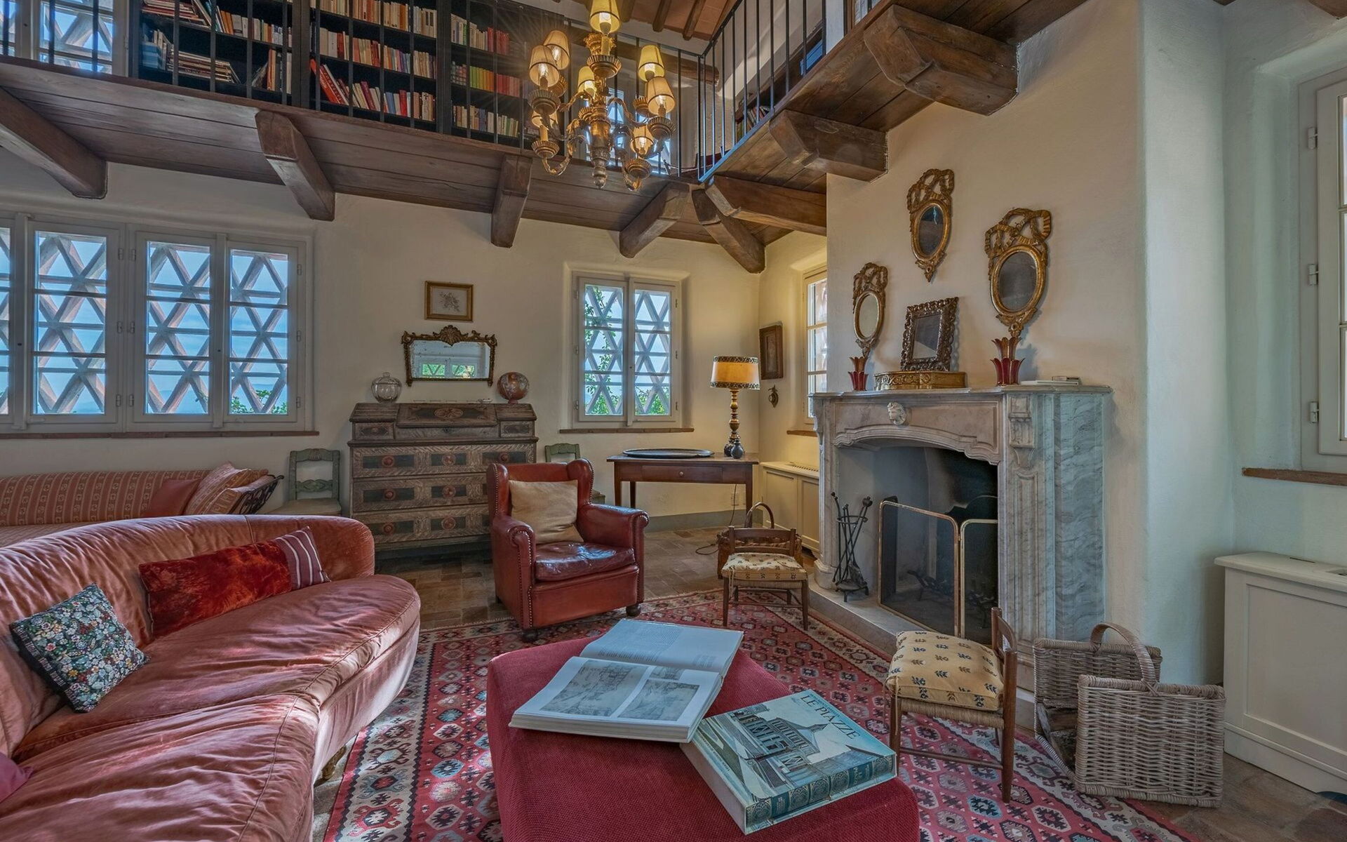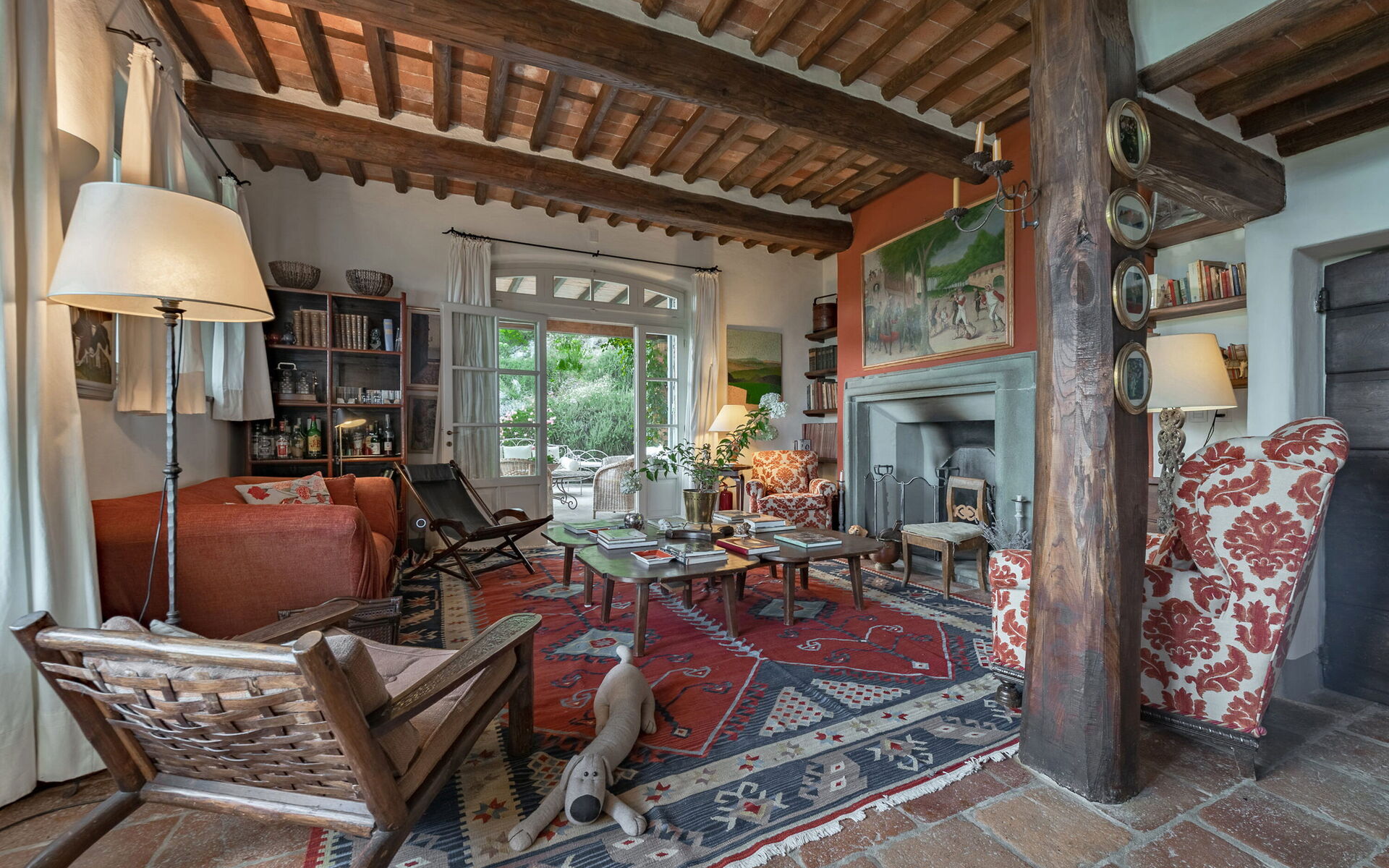 Ground floor: Two elegant living rooms welcome us: the first living room is furnished with sofa, card table and piano; the second one, larger, has a fireplace, tv, sofa, and direct access to the outdoor patio with lounge area and dining area.