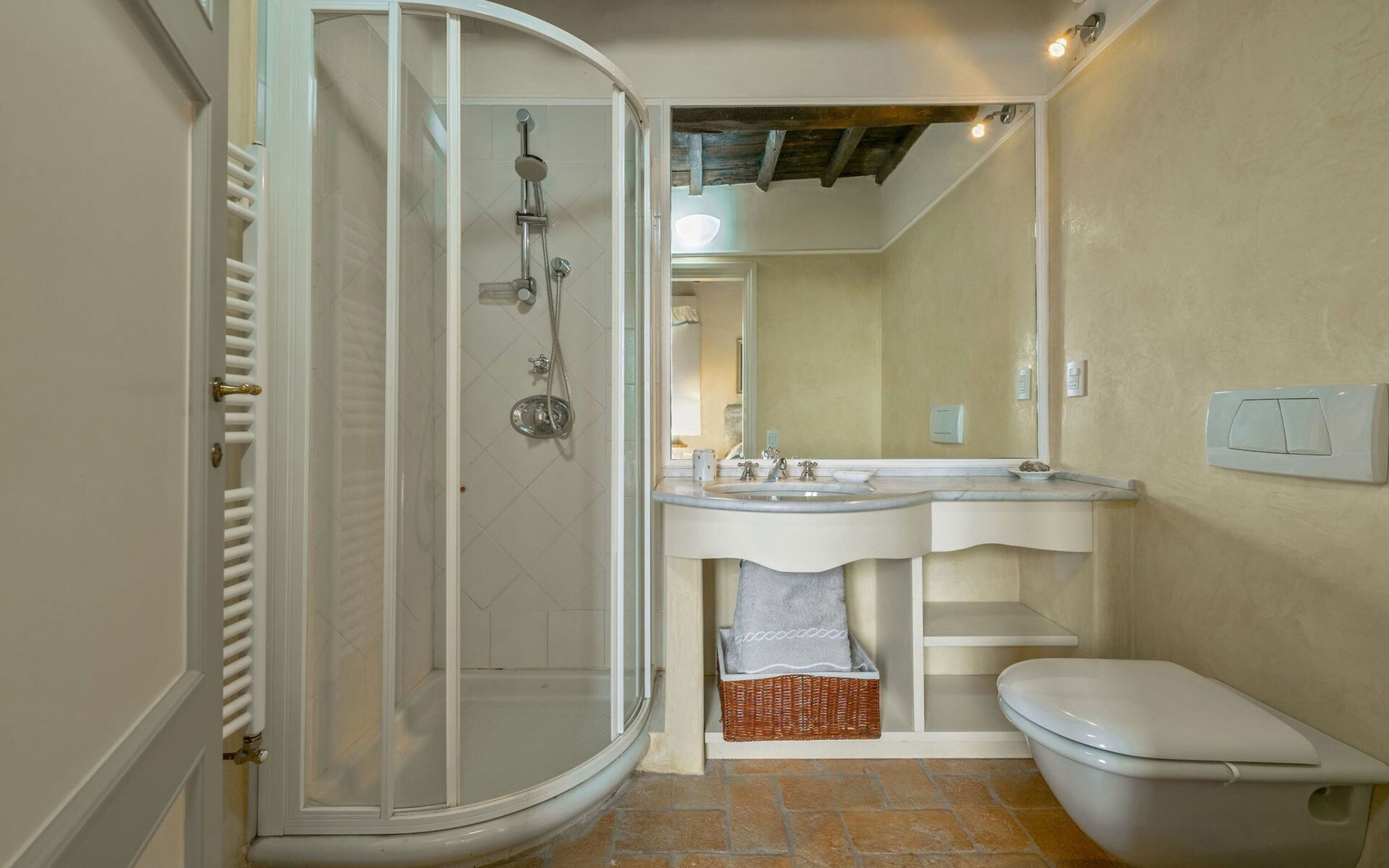 First floor: The upper floor houses the sleeping area with 5 bedrooms divided as follows: 1 double bedroom with ensuite bathroom (with bathtub); 1 twin with ensuite bathroom (with shower); 1 twin with ensuite bathroom (with bathtub); 1 double with private terrace and 1 twin sharing access to a bathroom with shower.
