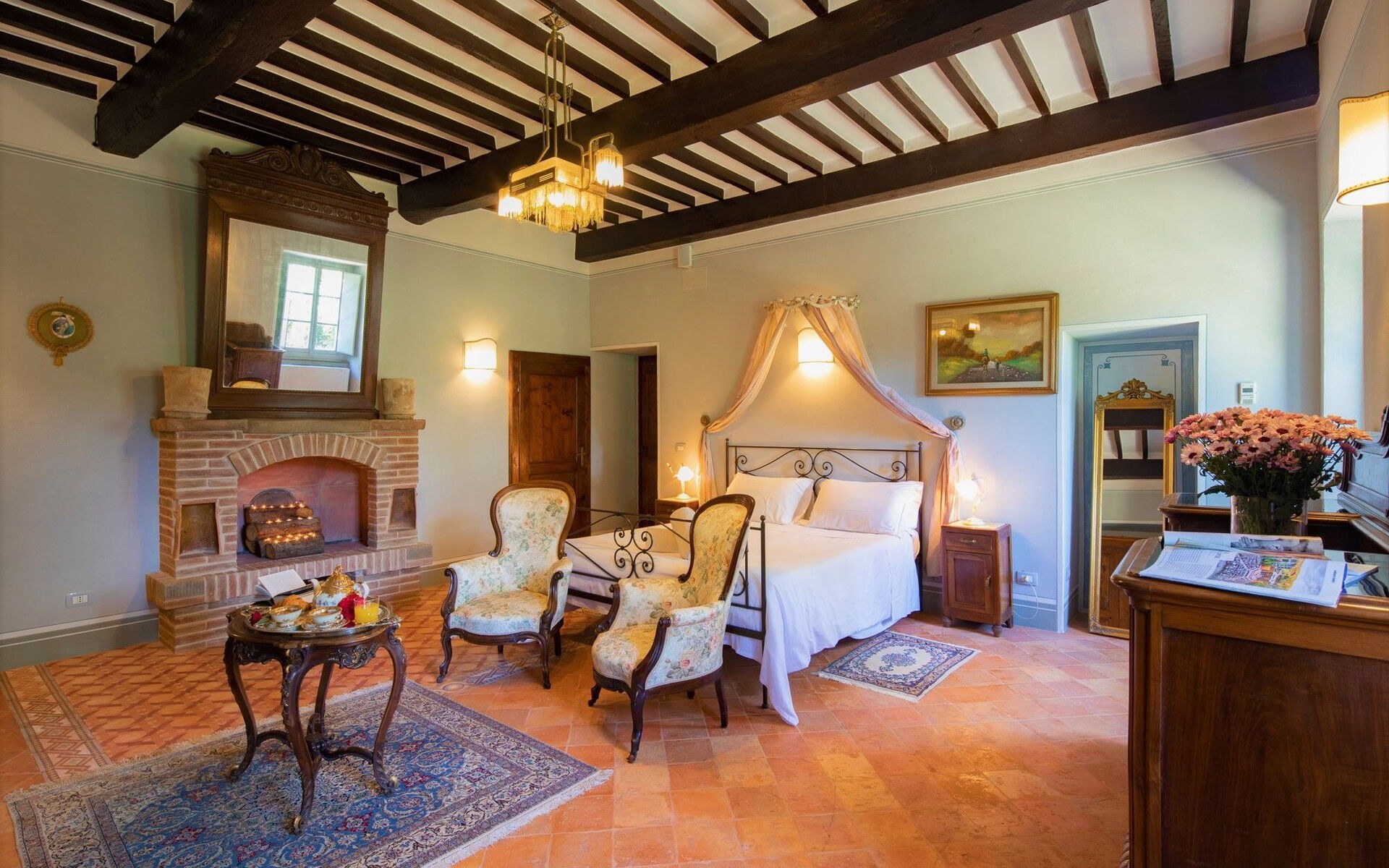 Bedroom + Ensuite Bathroom 5: king size bed (length: 200m, width: 165m), WIFI internet, internet, air conditioning, mosquito net, satellite tv, television, sofa, two armchairs, fireplace, basin, toilet, bidet, shower, hairdryer.