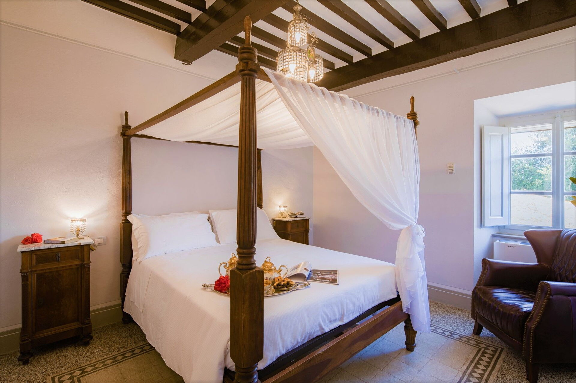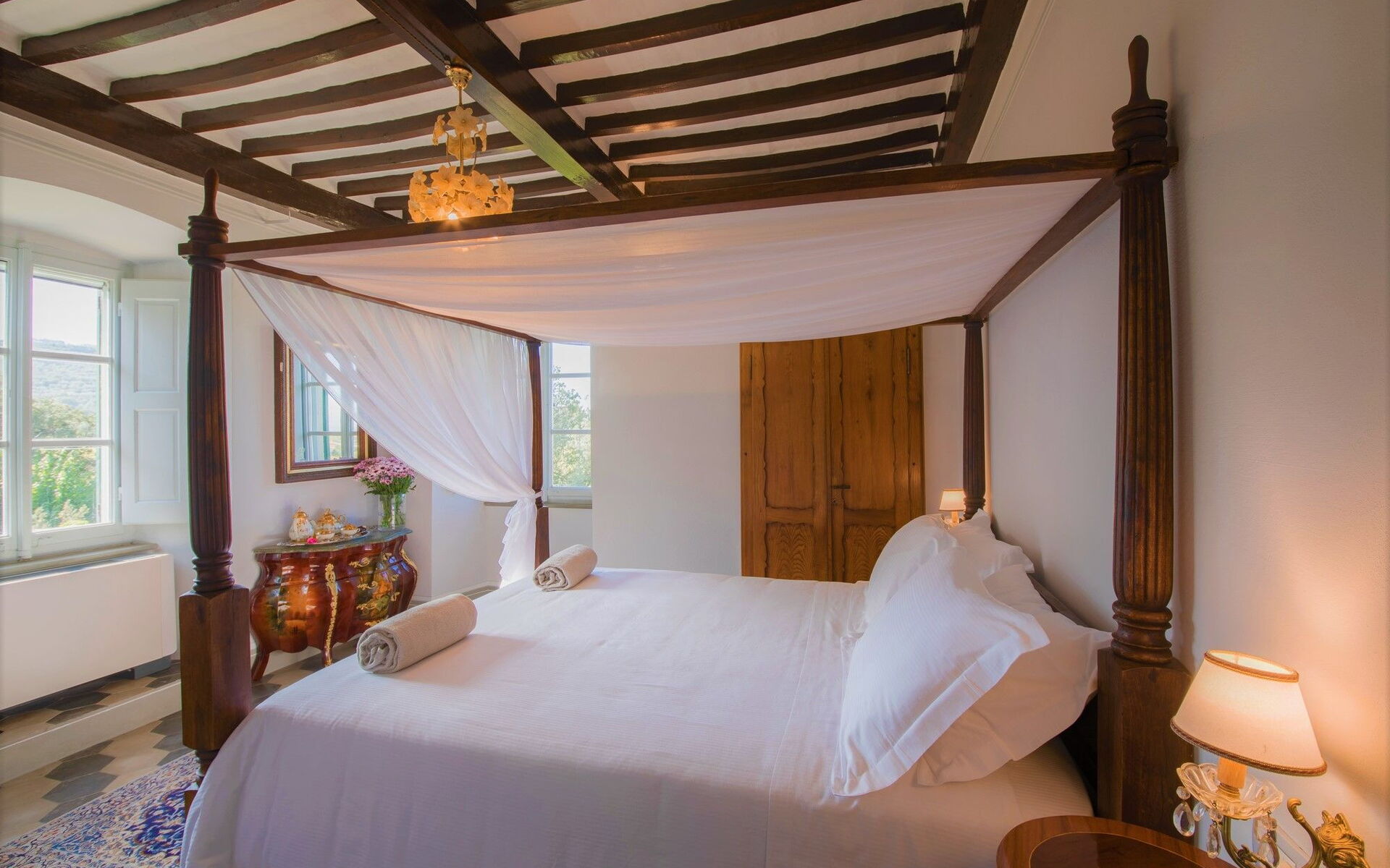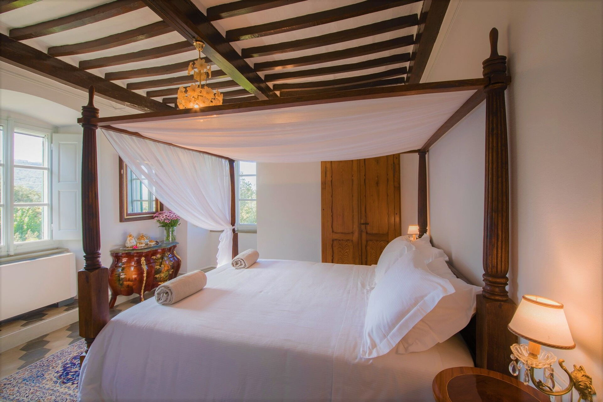 Bedroom + Ensuite Bathroom 4: king size bed (length: 200m, width: 165m), WIFI internet, internet, air conditioning, mosquito net, satellite tv, television, sofa, two armchairs, fireplace, basin, toilet, bidet, shower, hairdryer.