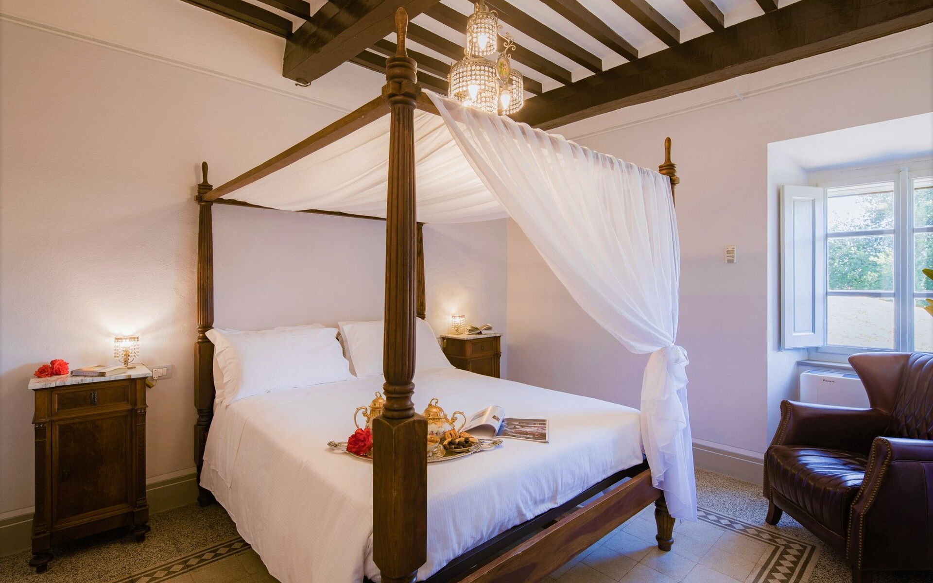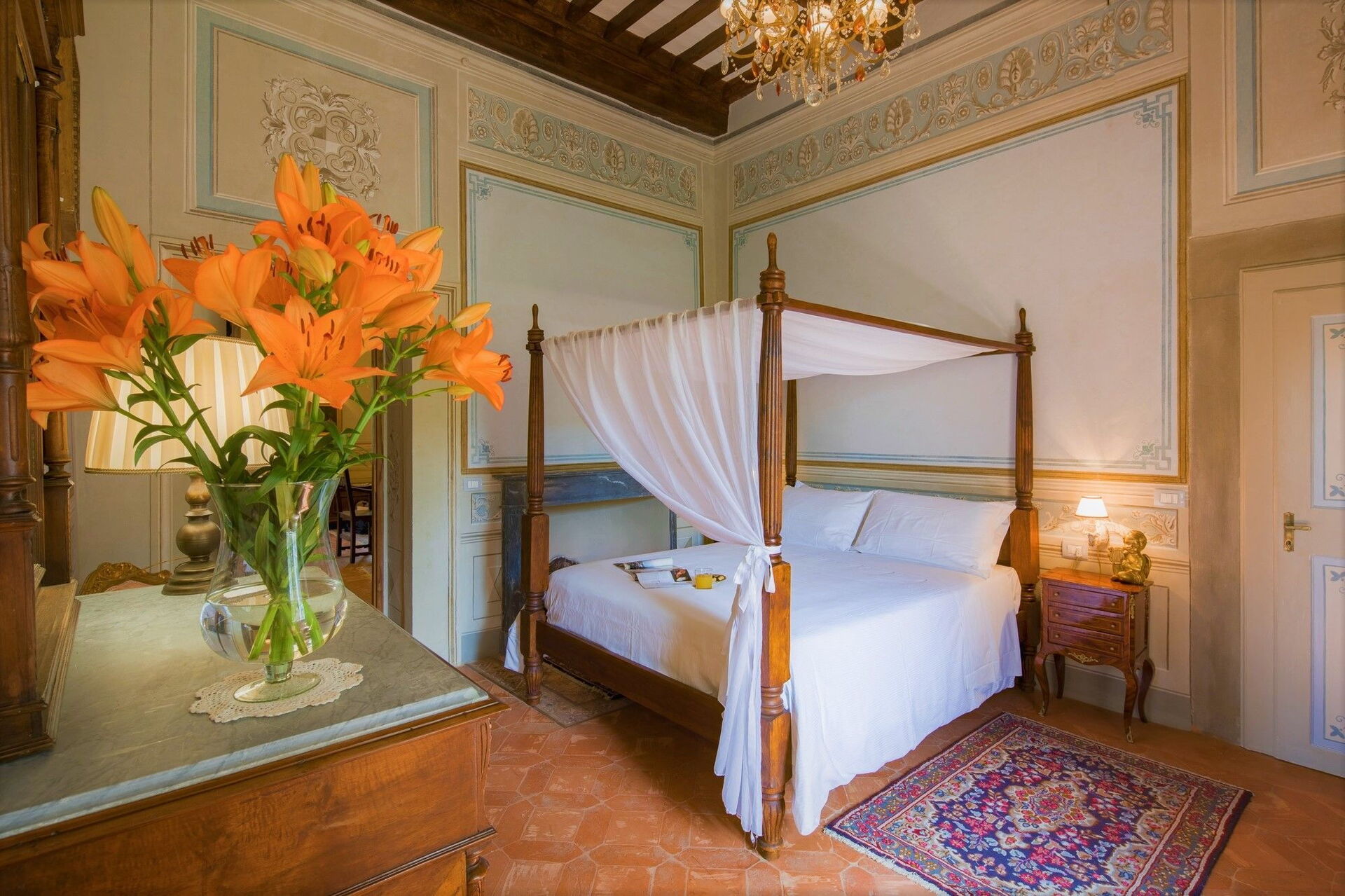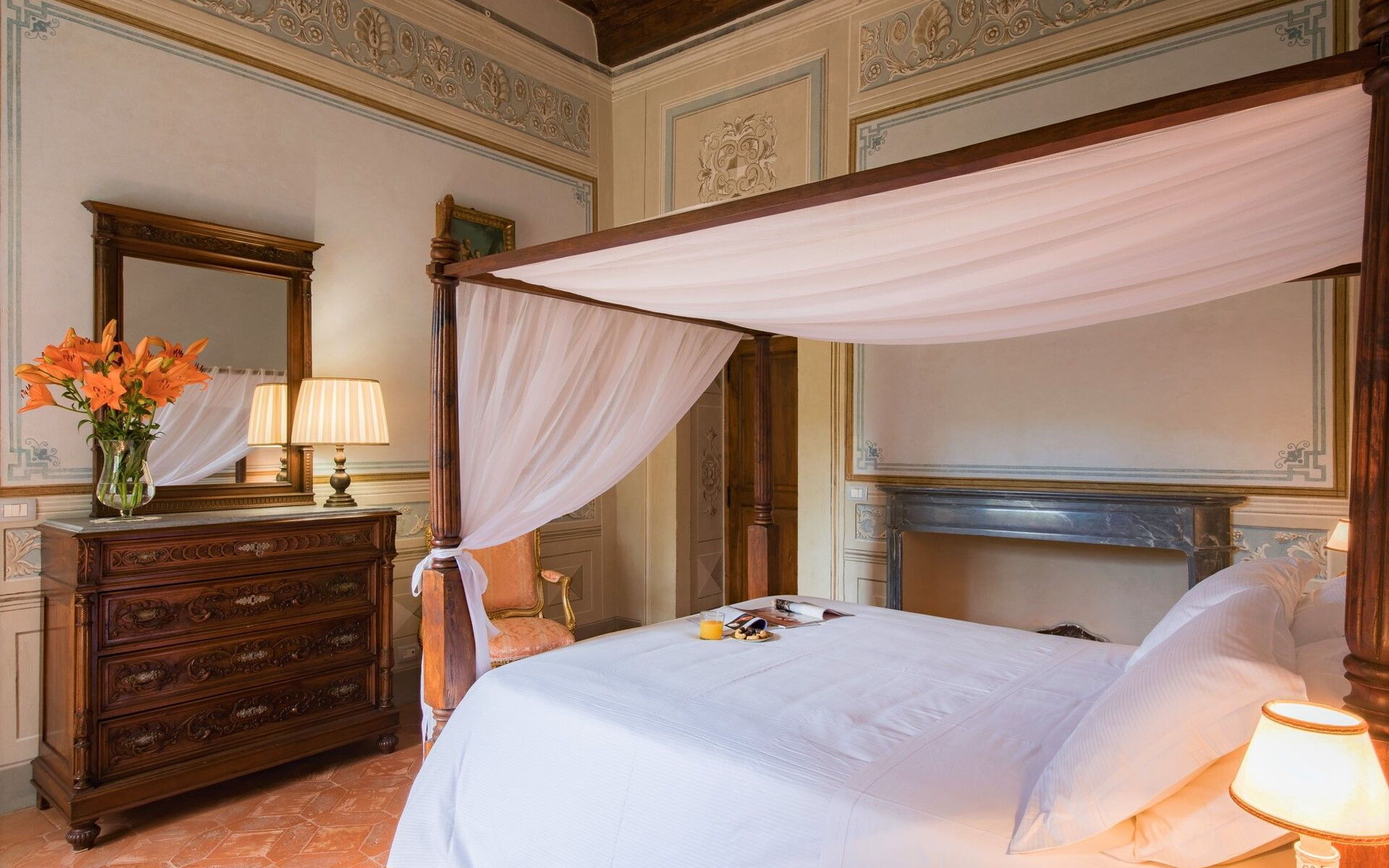Bedroom + Ensuite Bathroom 4: king size bed (length: 200m, width: 165m), WIFI internet, internet, air conditioning, mosquito net, satellite tv, television, sofa, two armchairs, fireplace, basin, toilet, bidet, shower, hairdryer.
